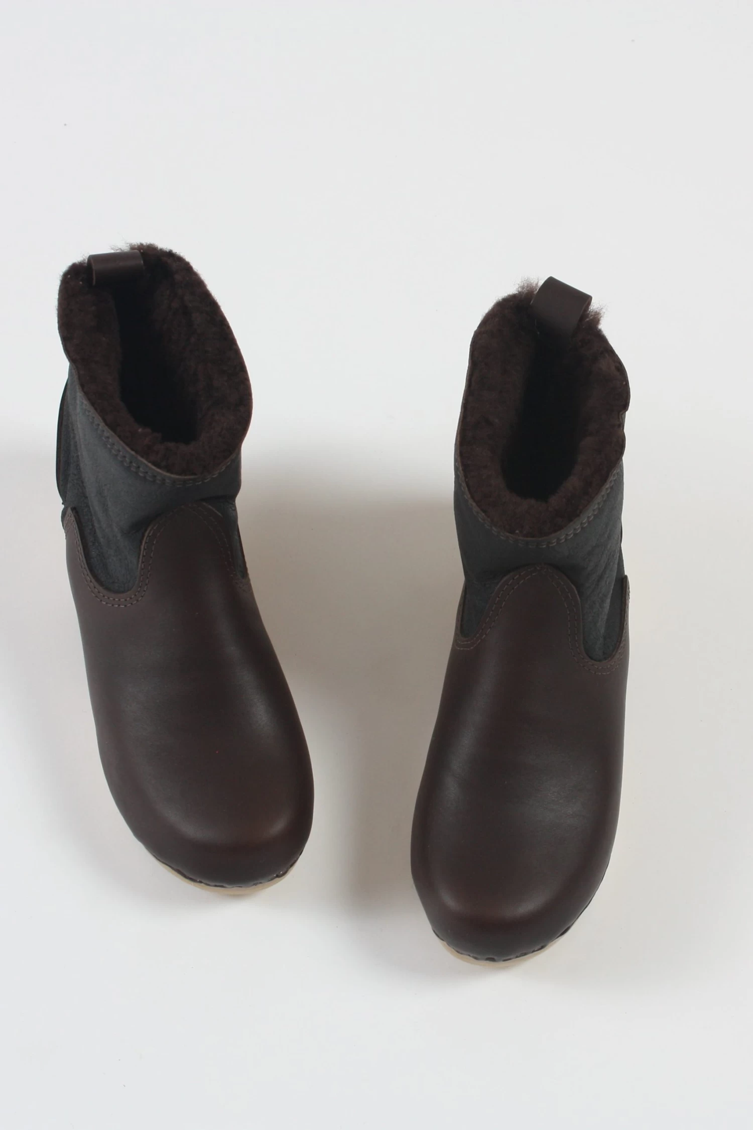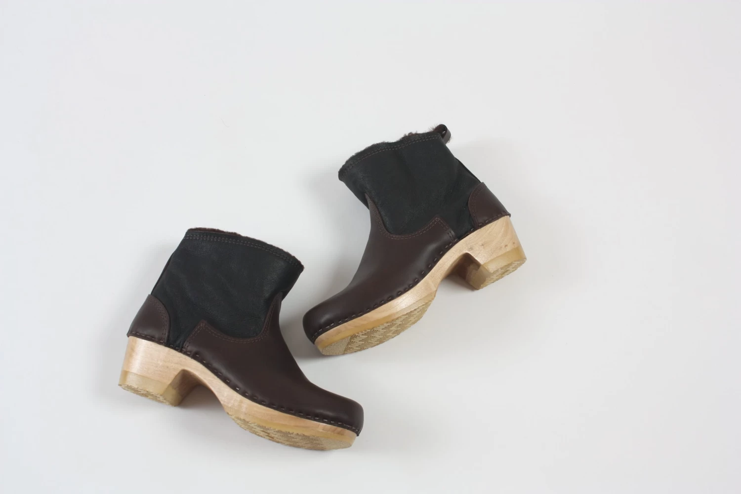 - Water repellant shearling with cow nubuck upper, wood base with polyurethane sole