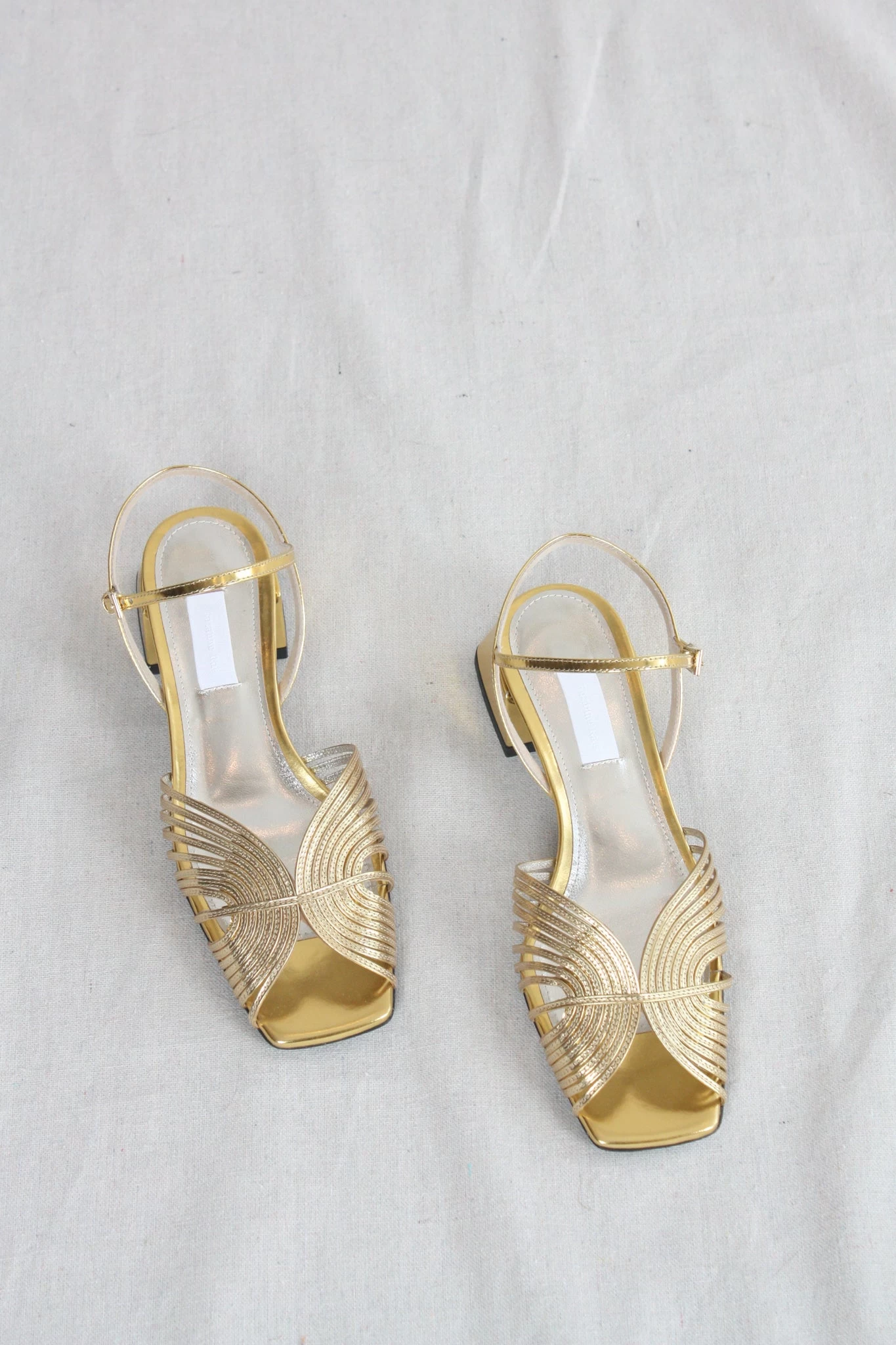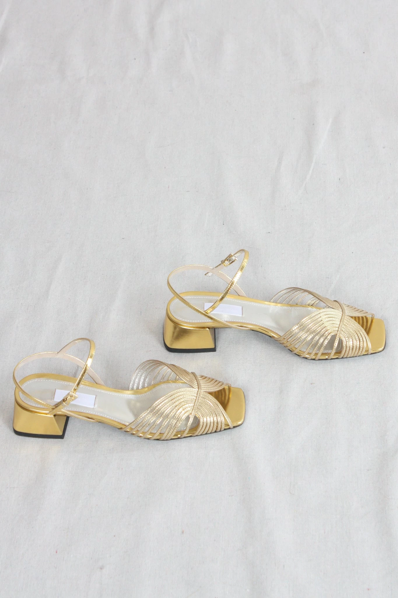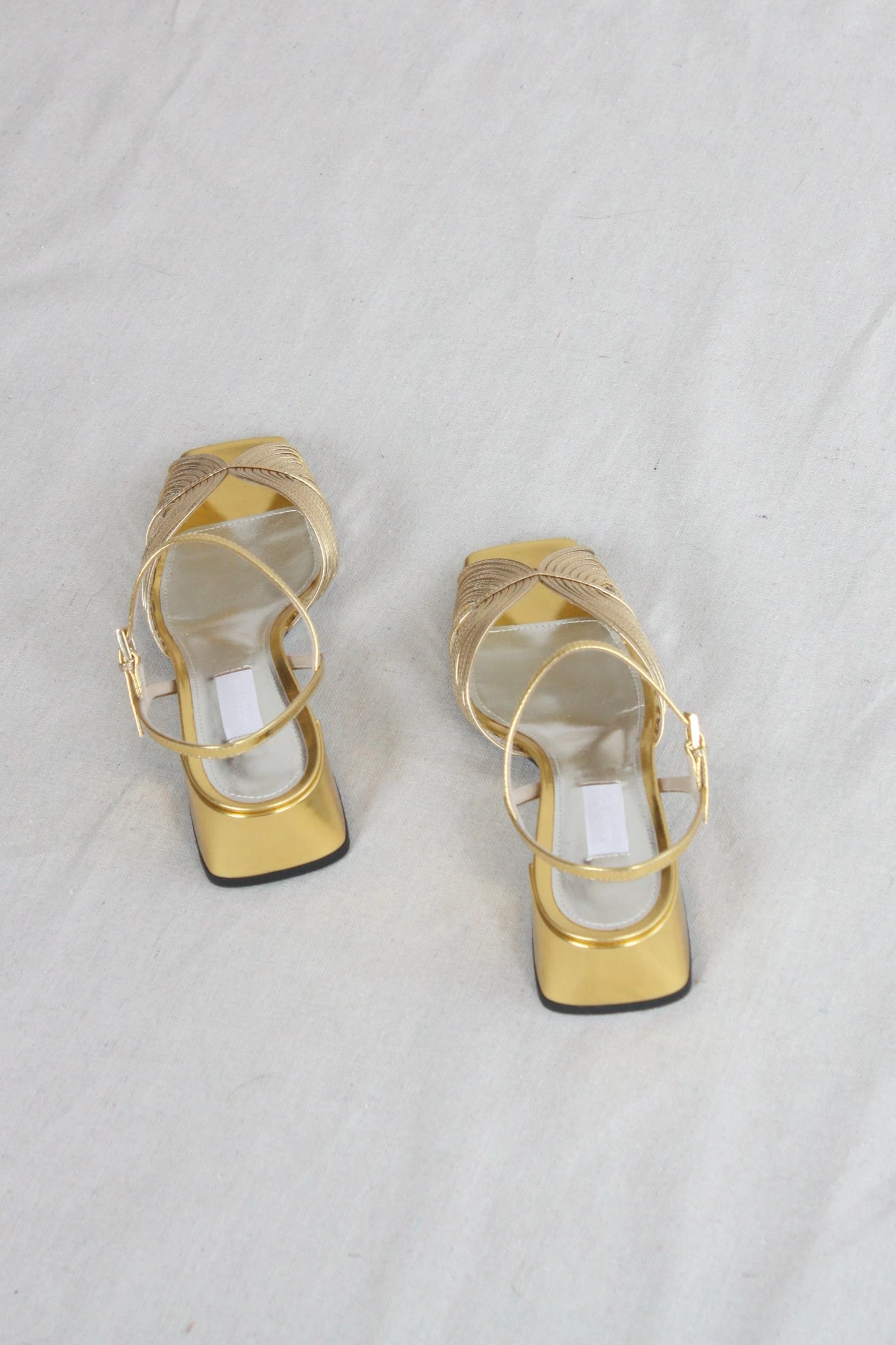 A classic 70’s style in high shin gold leather. Open square toe with slender ankle strap and gold buckle closure. Leather covered heel.
