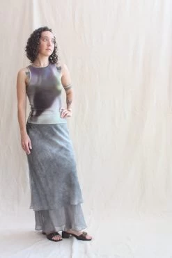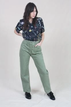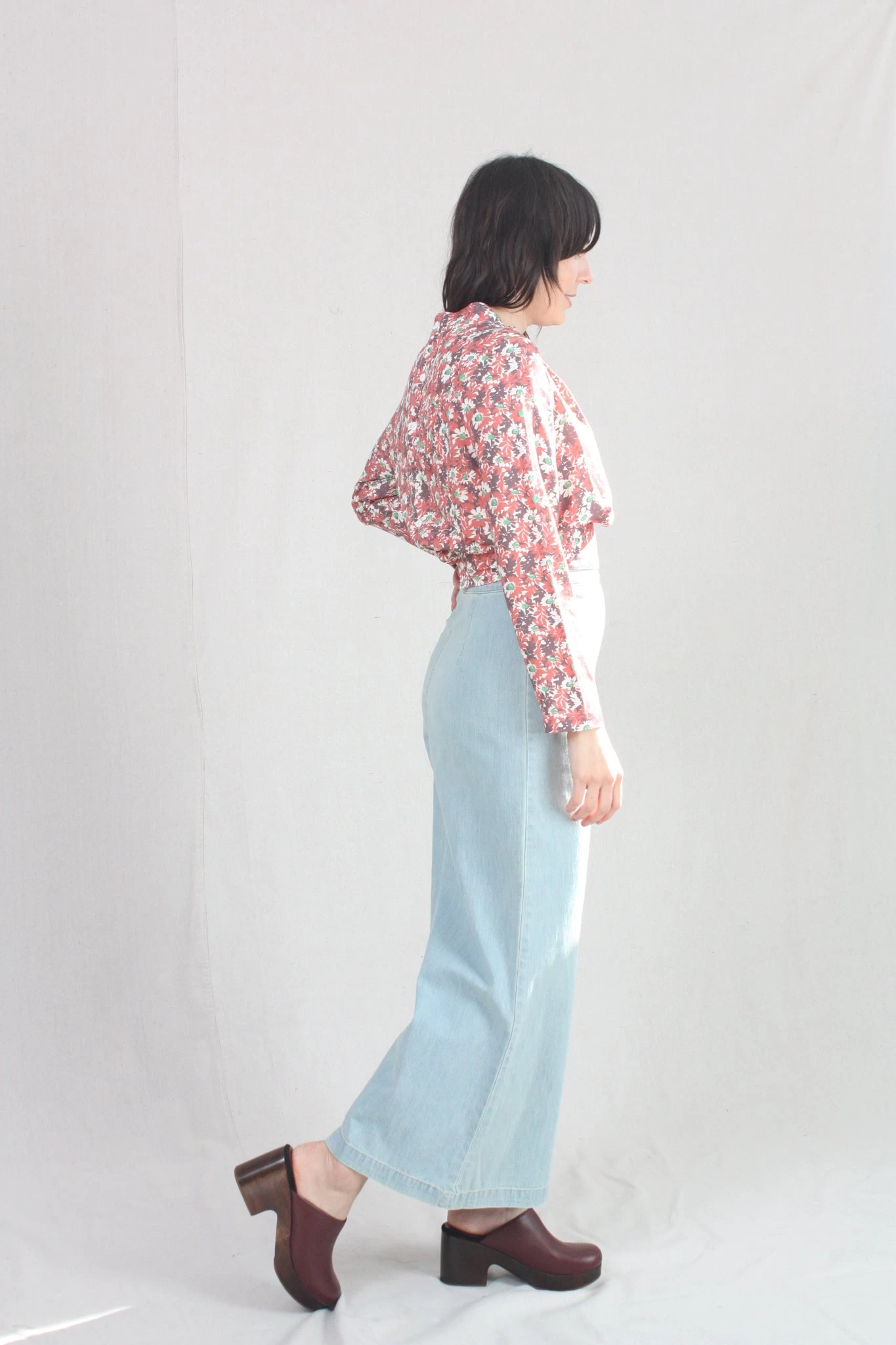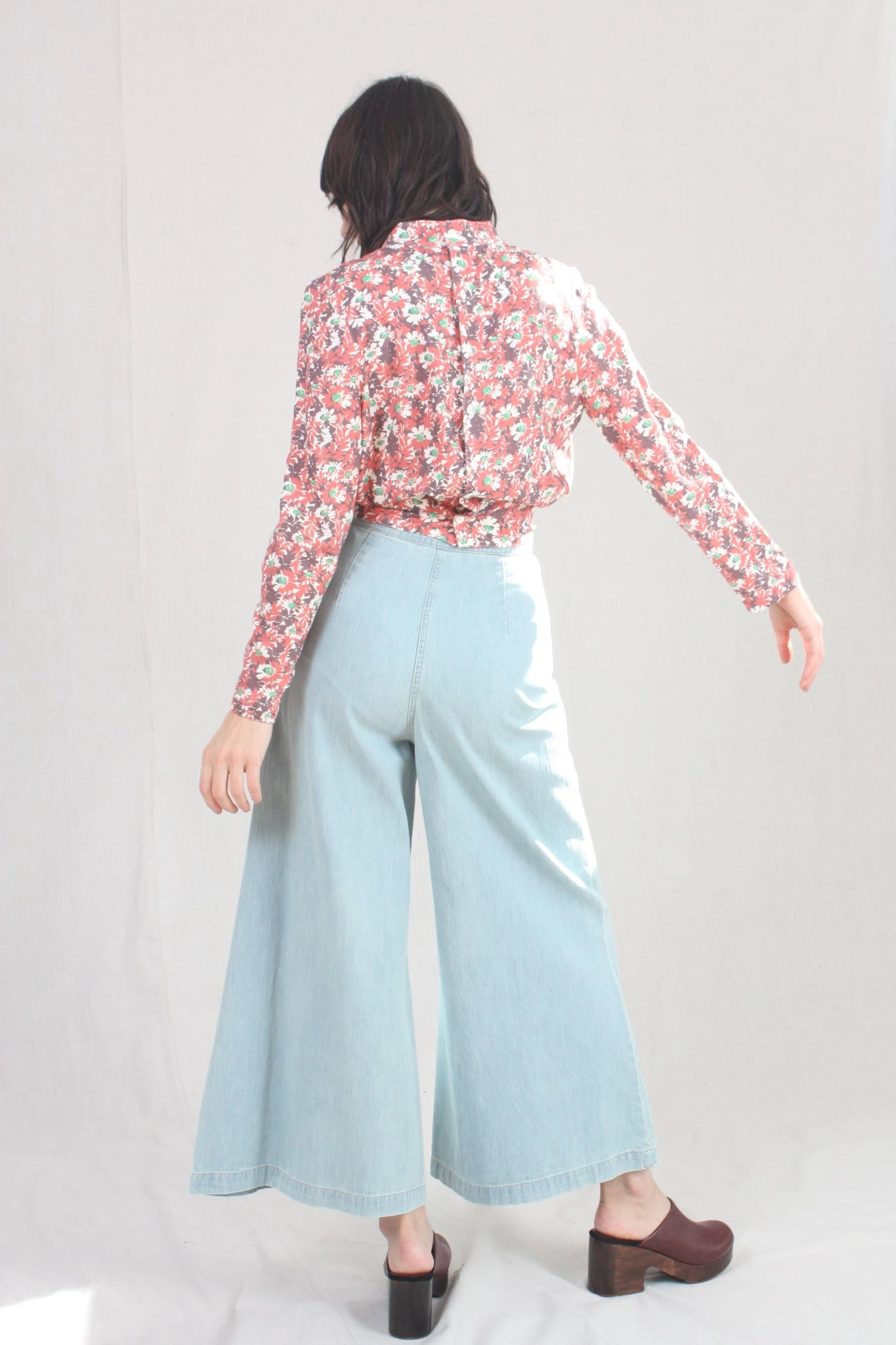 Voluminous, high-waisted flared denim pant with an extra wide leg that falls at the ankle. Side zip closure creates a clean, tailored fit with minimal detailing to reduce bulk.