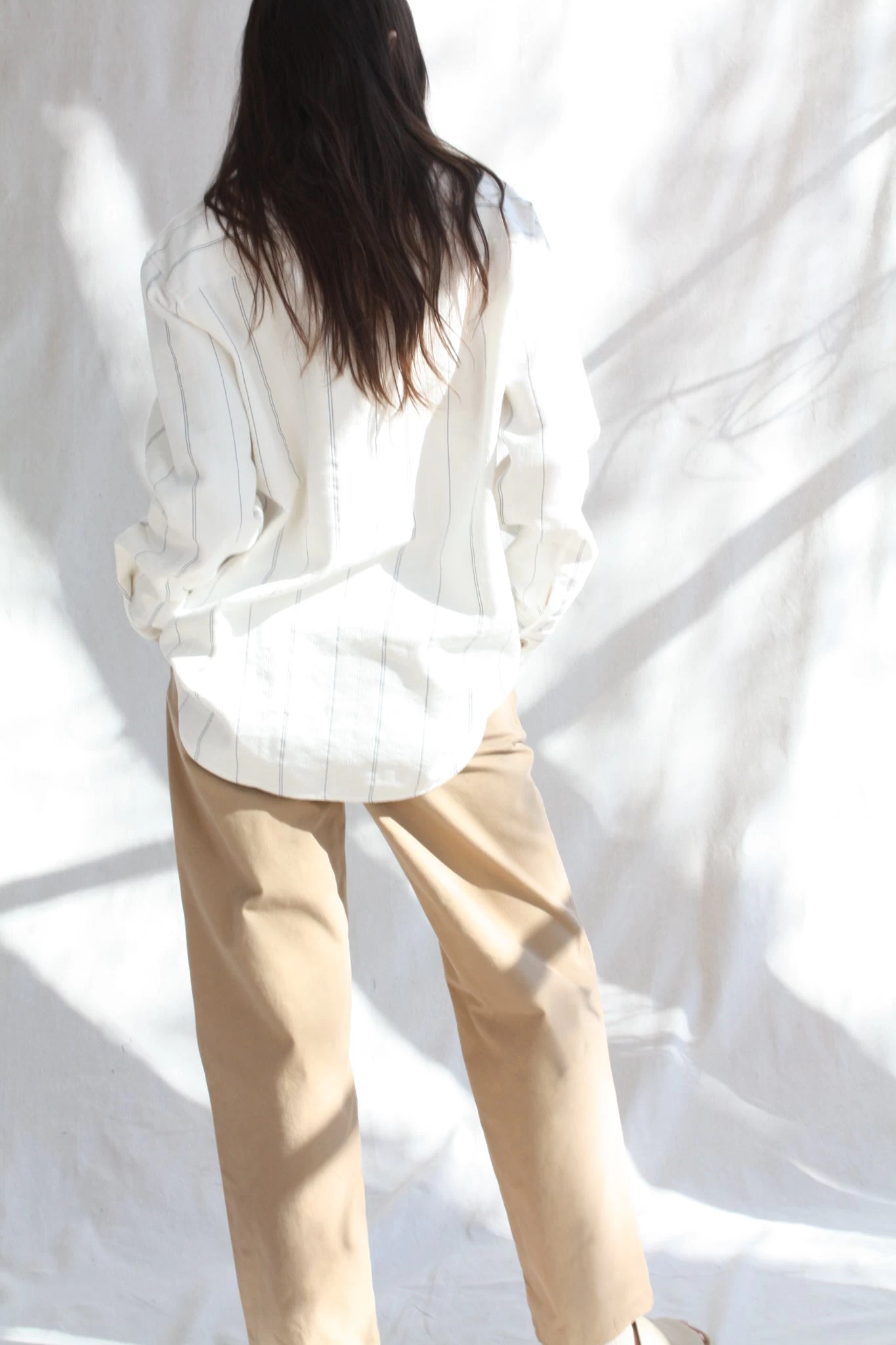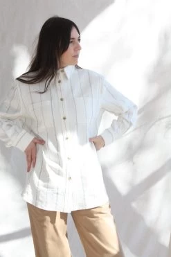 Adele is an oversized, menswear-inspired button-up with chest patch pockets and pleated, single button cuffs that land at the wrist. Throw it on as an overshirt with your favorite denim or pair with our Tulay Skirt. Made from a heavy-weight organic cotton and linen blend in our Polson Stripe pattern.