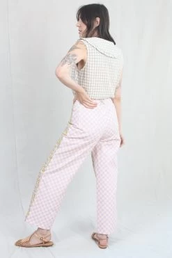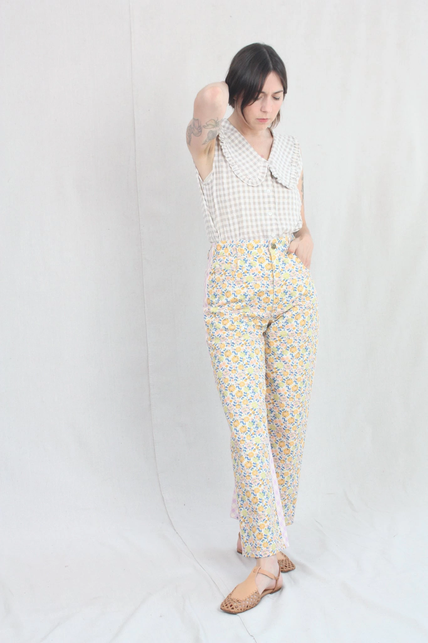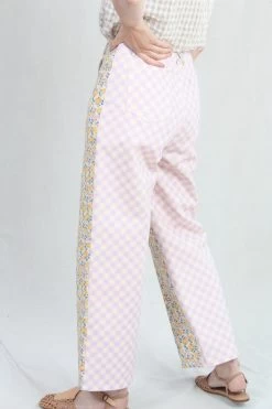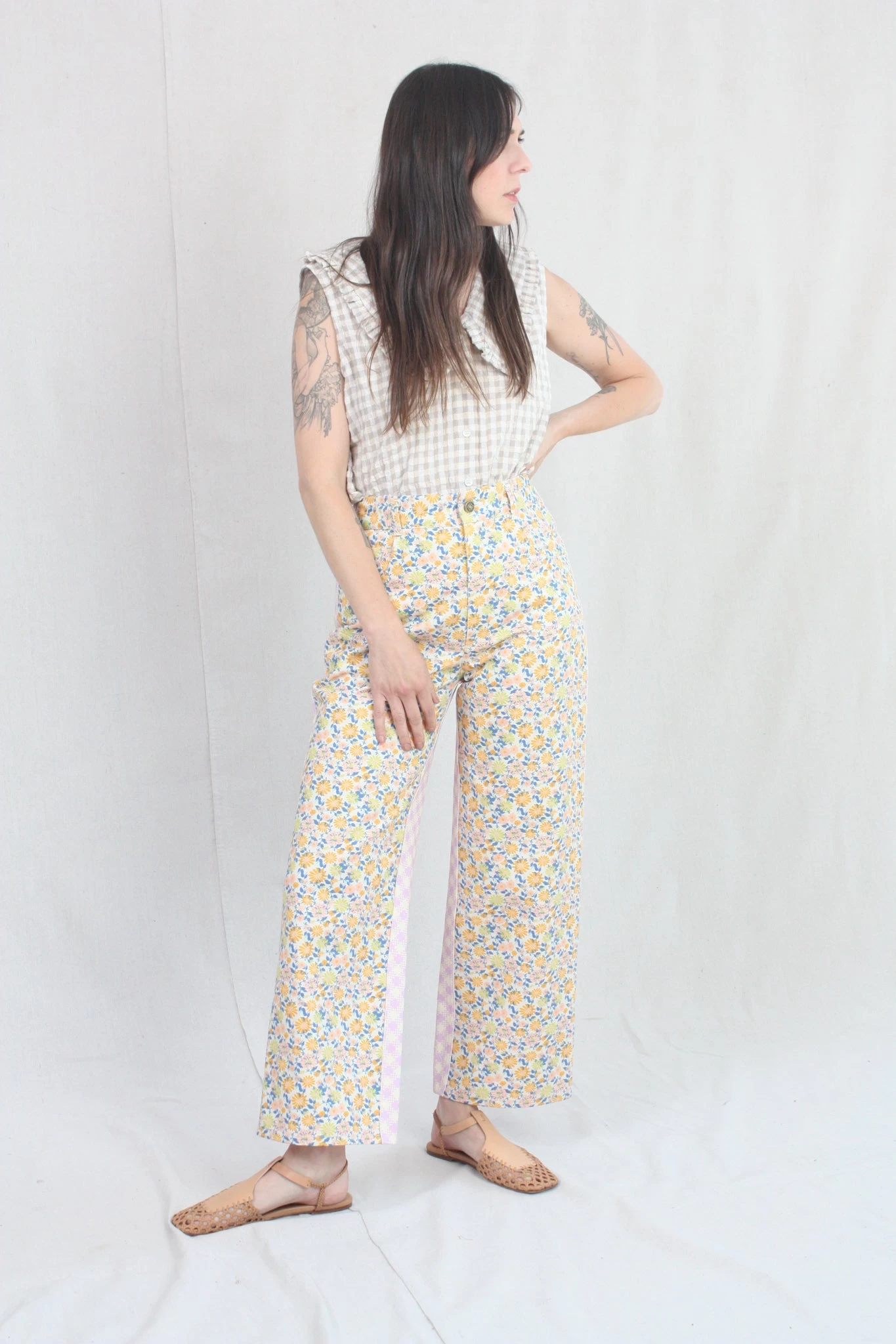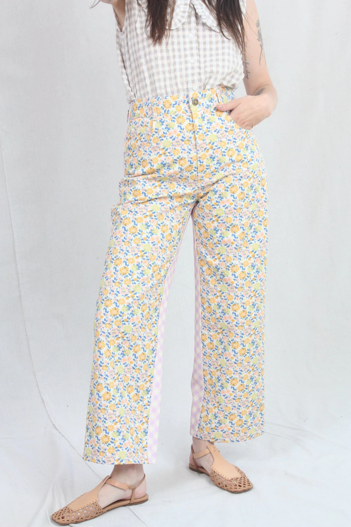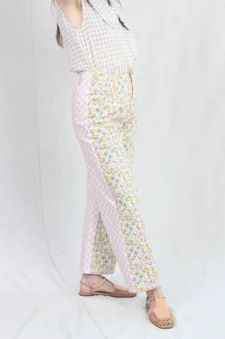 Carpenter inspired mid weight denim pant with floral and gingham printed panels. High rise. Five pockets. Button and zip closure.