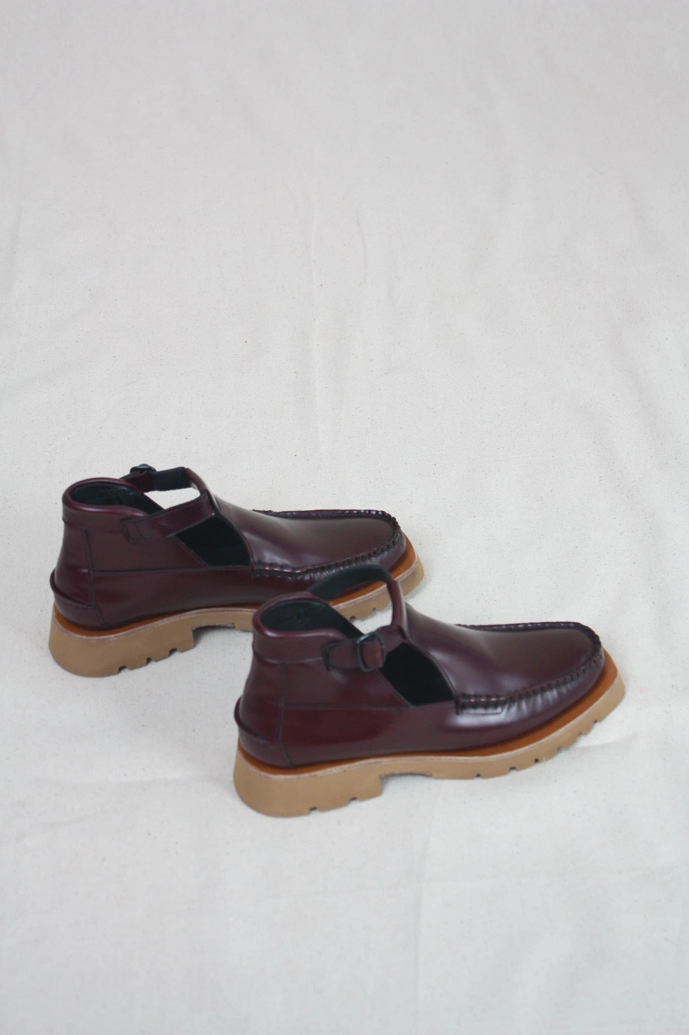 T-bar ankle boot crafted in Spanish full-grain calf leather. Hand-sewn using the traditional moccasin construction. Blown-rubber ultralight outsole. Adjustable buckle fastening.