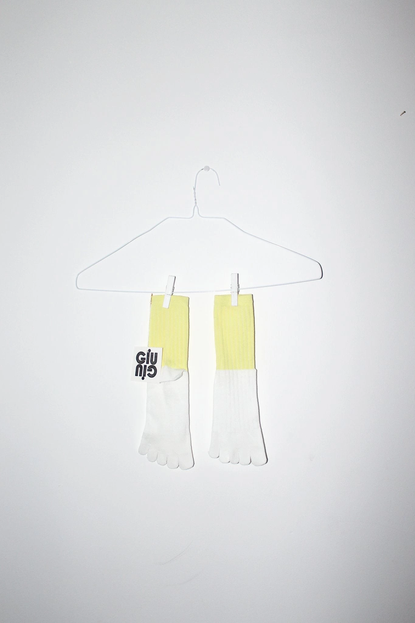 Classic 5-finger reflexology sock in ribbed knit. 2-tone with a clear non-slip “GIU GIU” grip on the bottom. A cotton canvas drawstring carrying bag, with a map to locate pressure points on the feet in included.