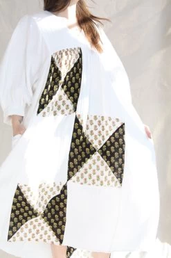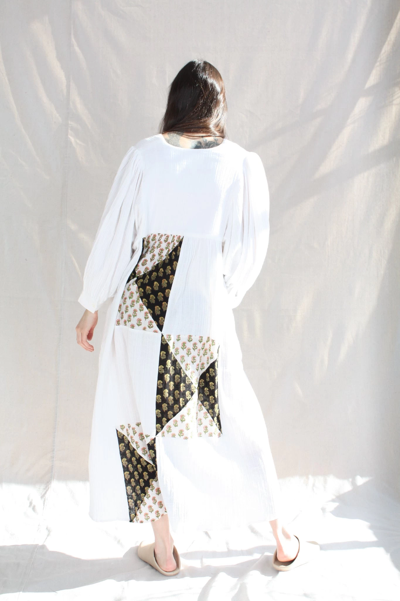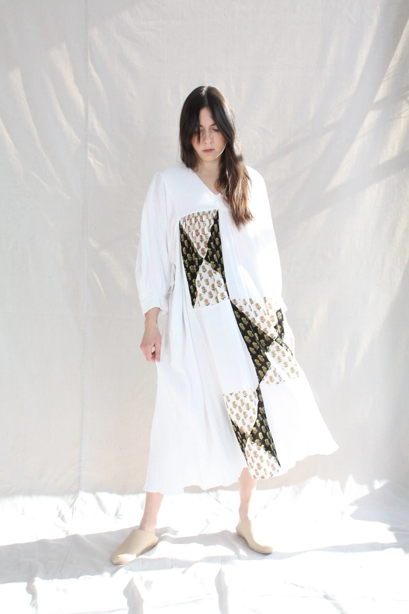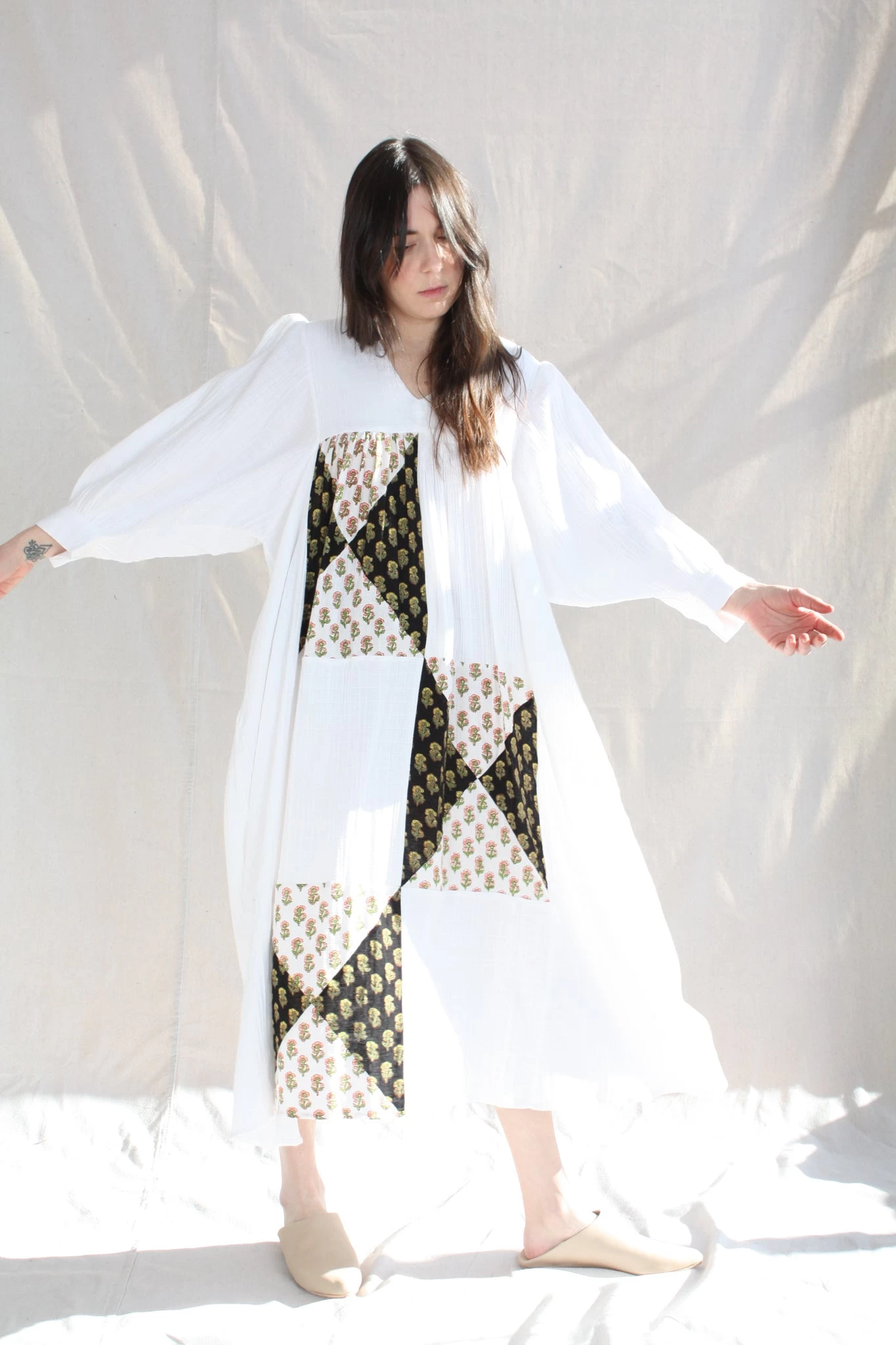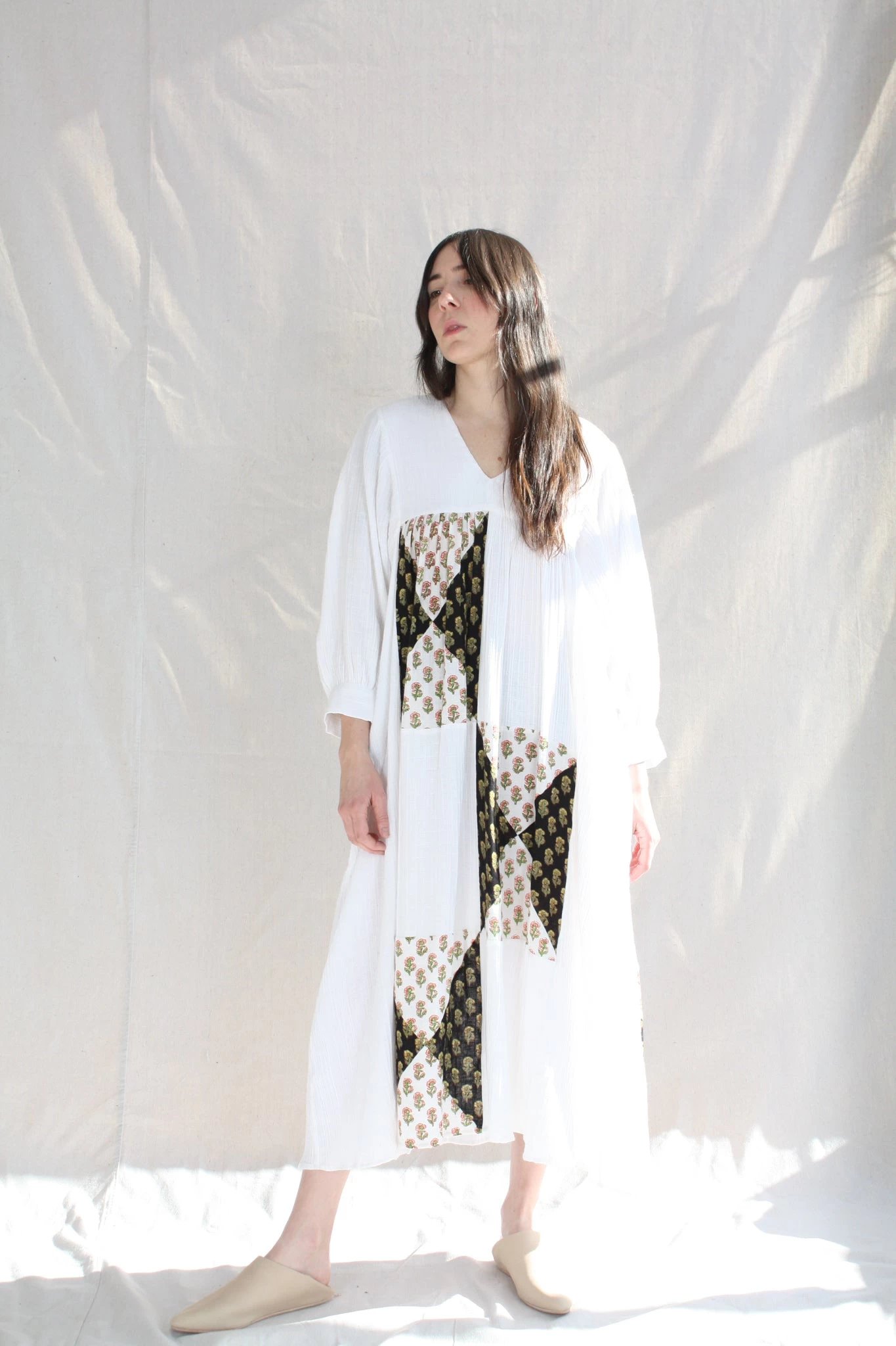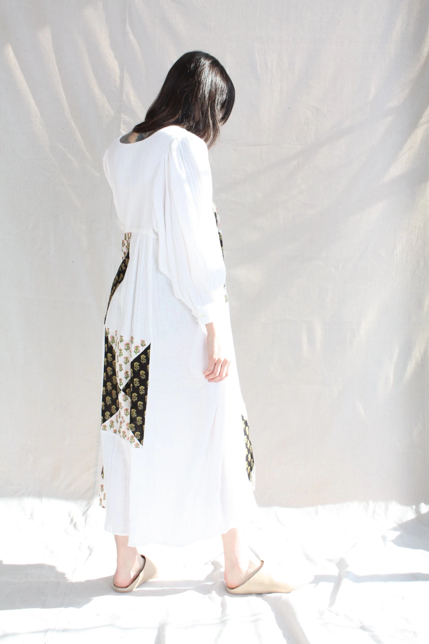 Oversize maxi dress in cotton gauze floral patchwork. V-neck and gathering at the bust, slight gathered 3/4 length puff sleeve. Buttoned cuff.Â