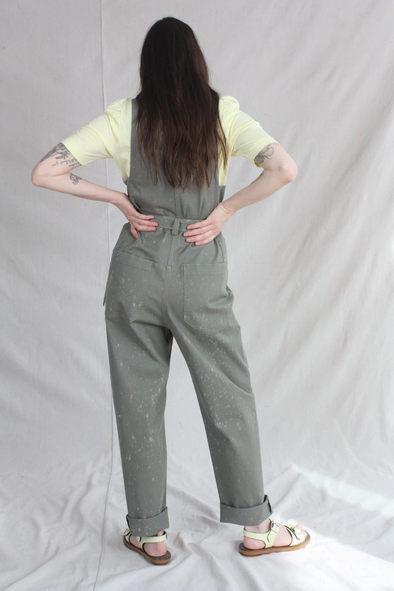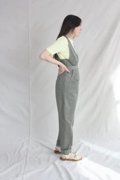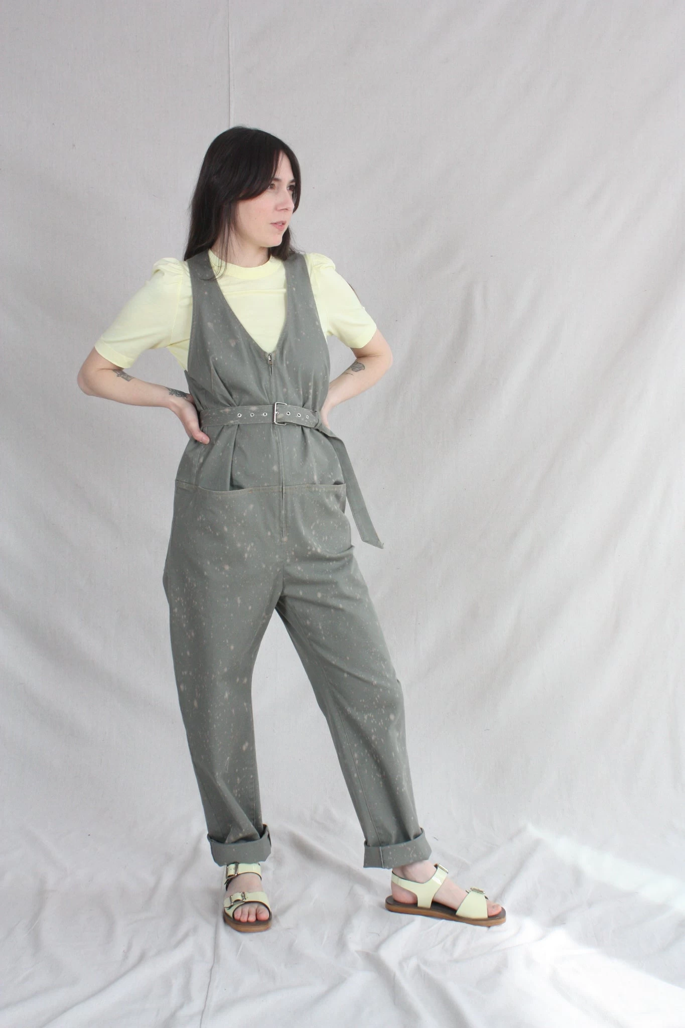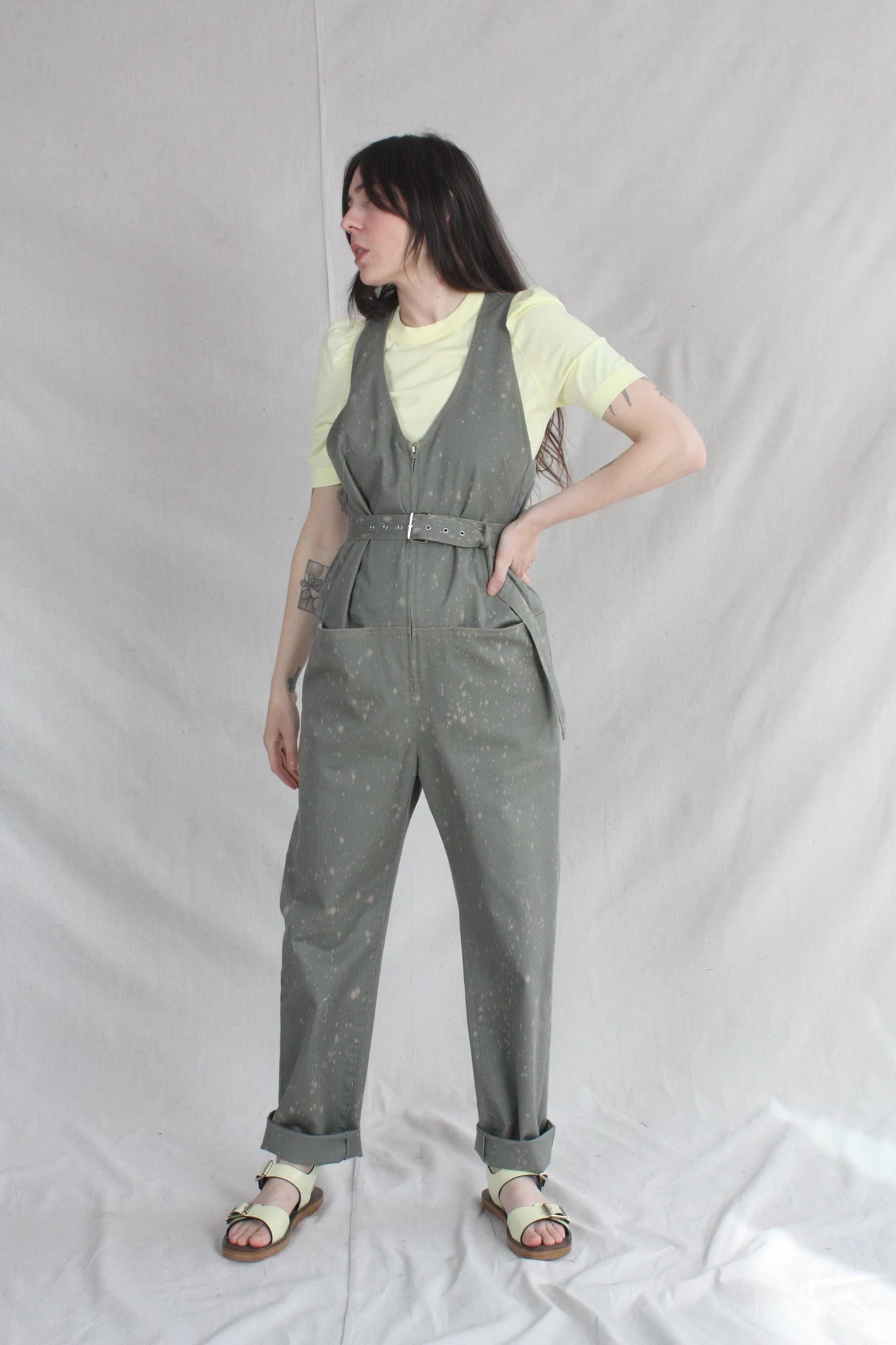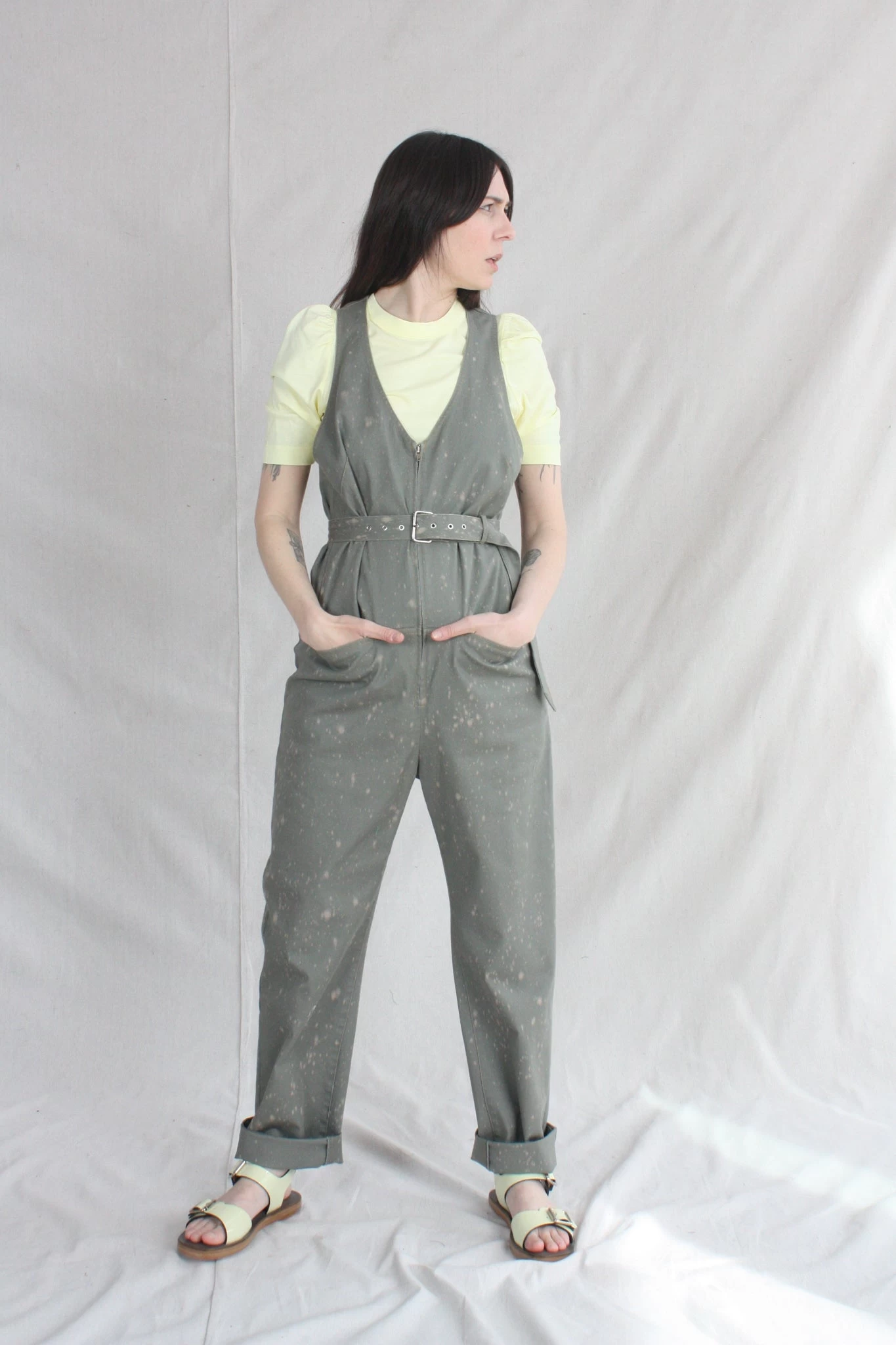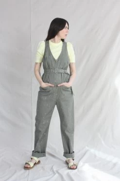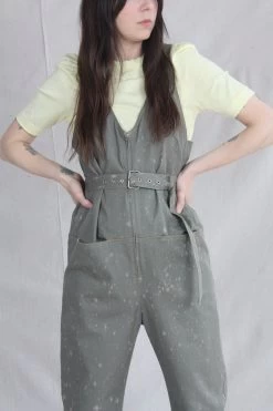 Sleeveless zip-up belted jumpsuit with a deep V neck and front slip pockets, in Rachel Comeys’s new bleach-splattered Stretch Chino Twill. Straight leg. Adjustable belt. Front slip pockets and back patch pockets.