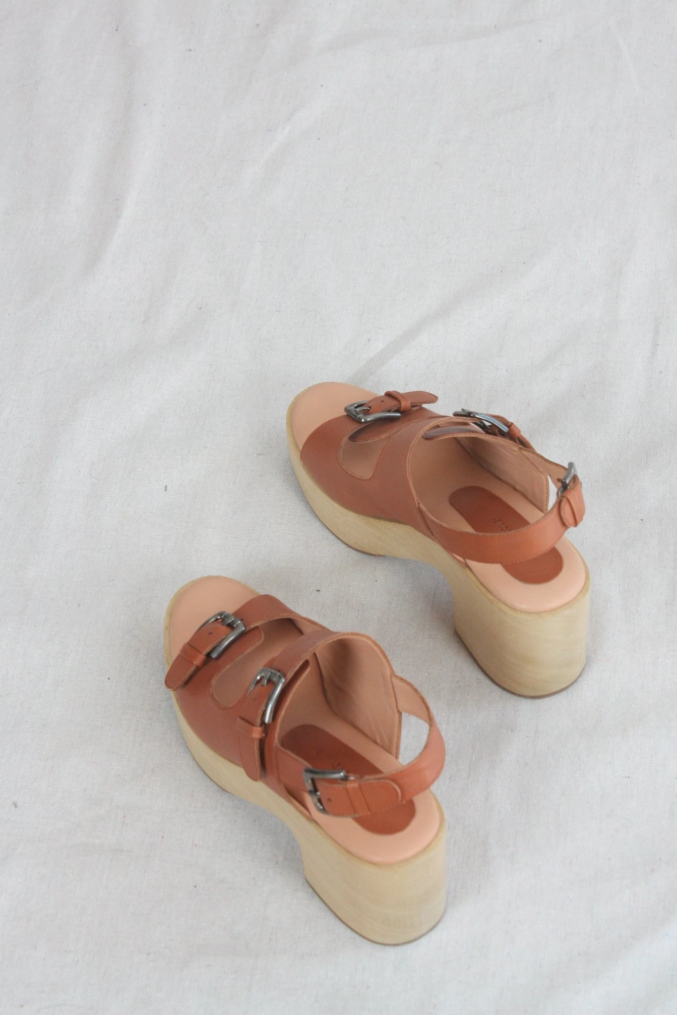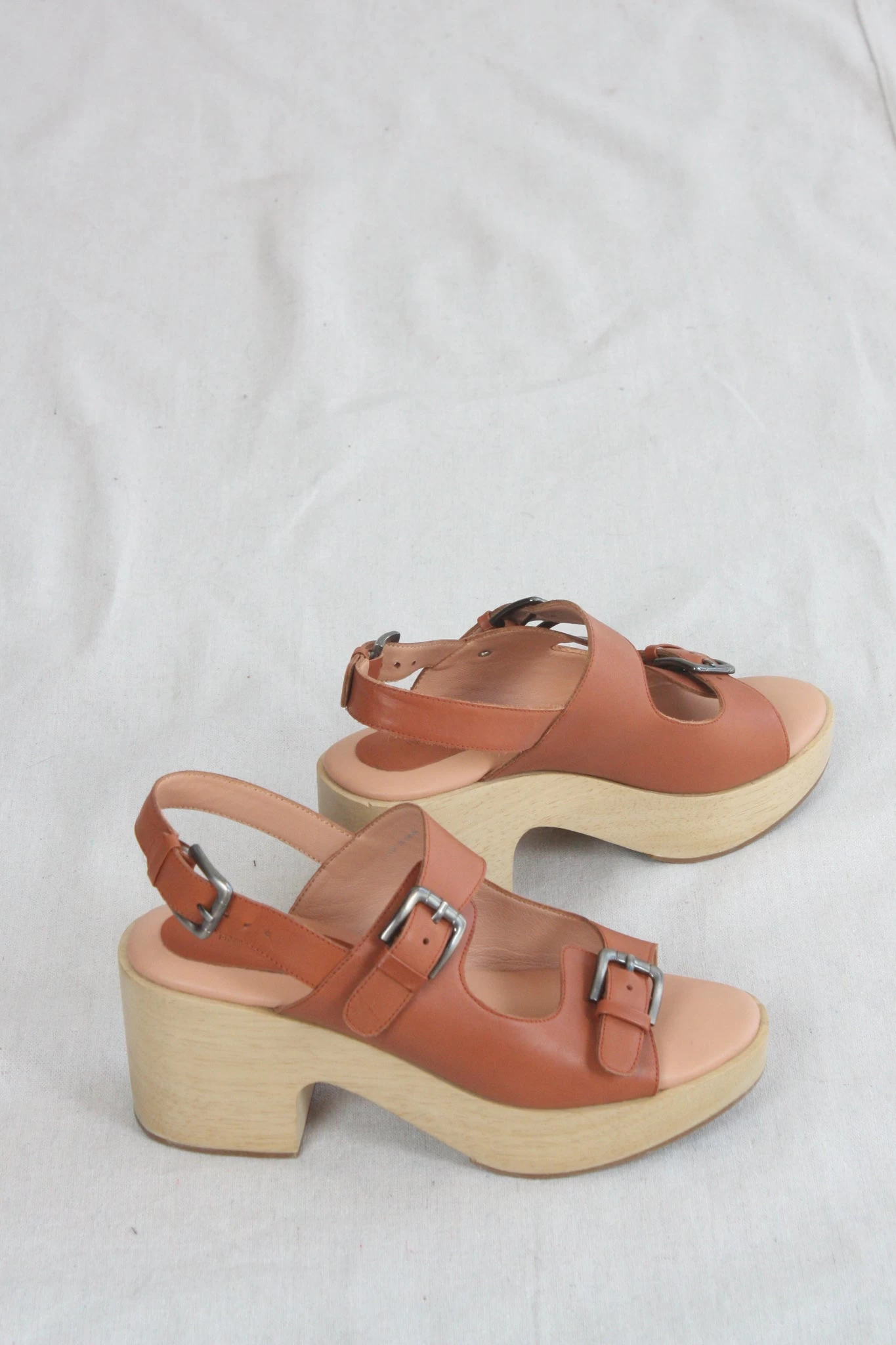 Chunky mid-heel triple strap clog sandal, in kidskin leather. Buckle closures.