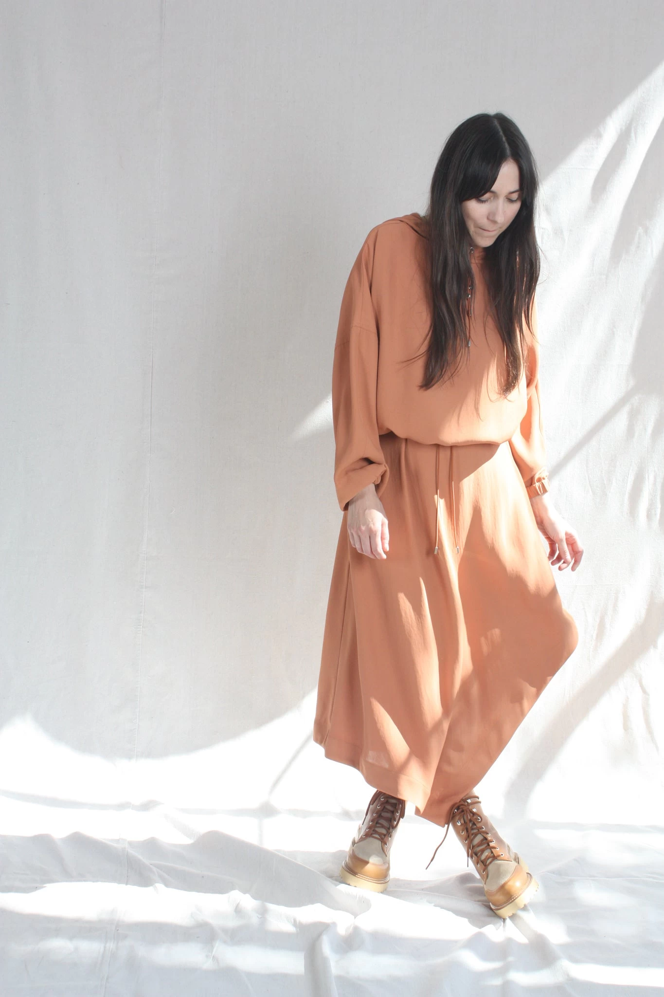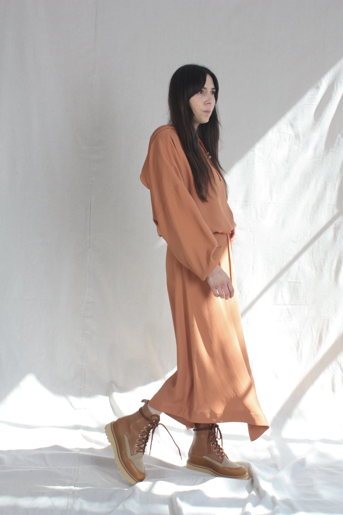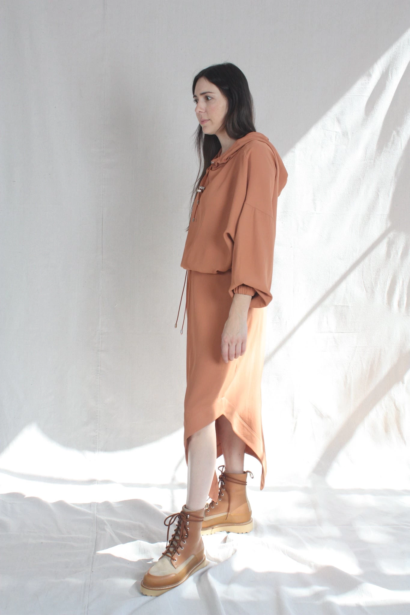 Flared, handkerchief hem skirt in fluid draped acetate. Invisible zipper at side hem with center pleat at front.