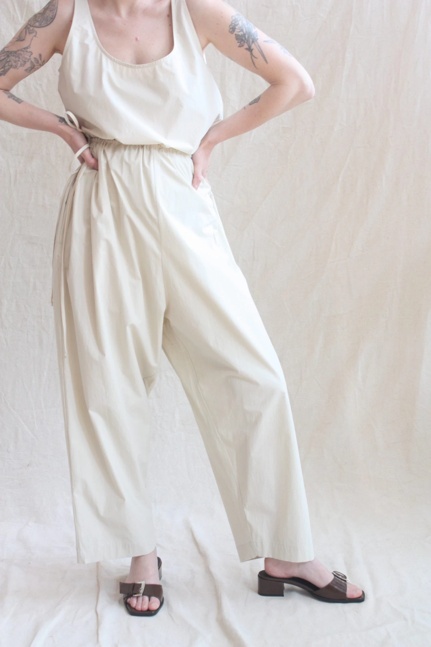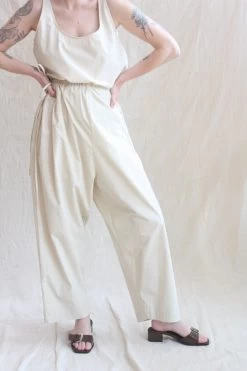 Crisp cotton parchment poplin pant with a gathered, adjustable string waist. Drawstrings on both sides of the waist to adjust the size. Side pockets. Pair with the coordinating Button Front Kaftan, Pocket Popover Top, and Tank Top from Modern Weaving for a monochromatic look. One Size.