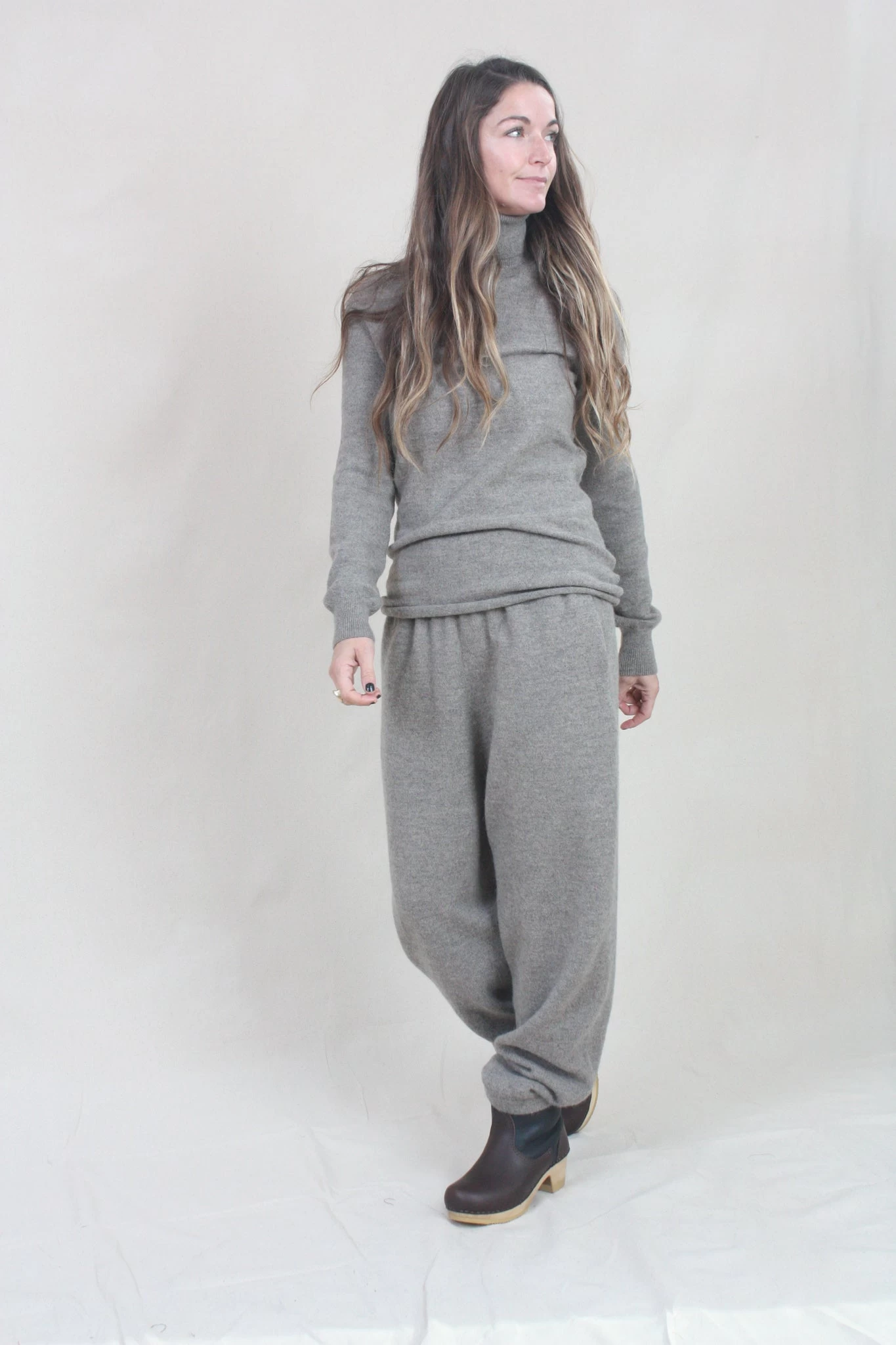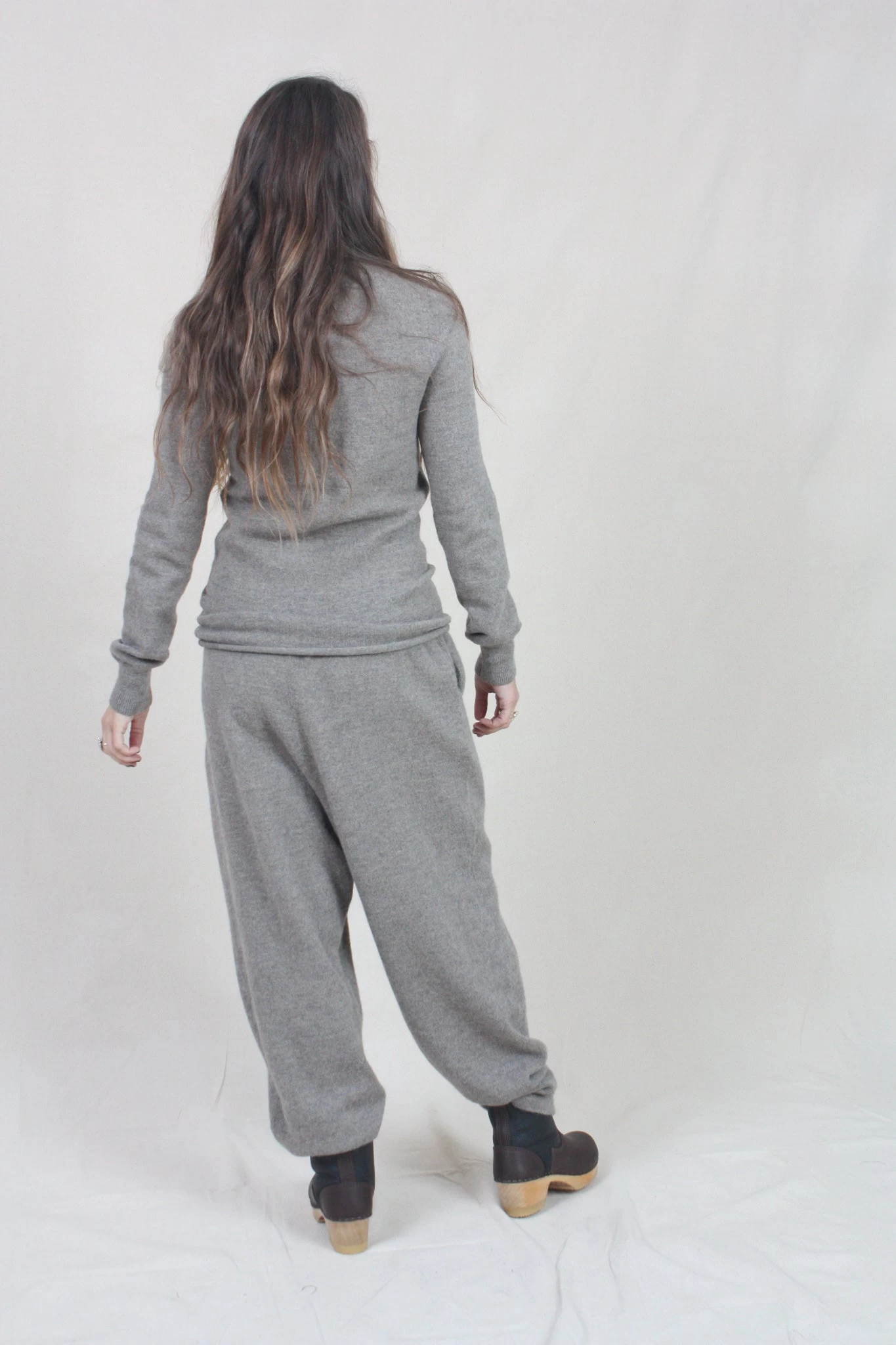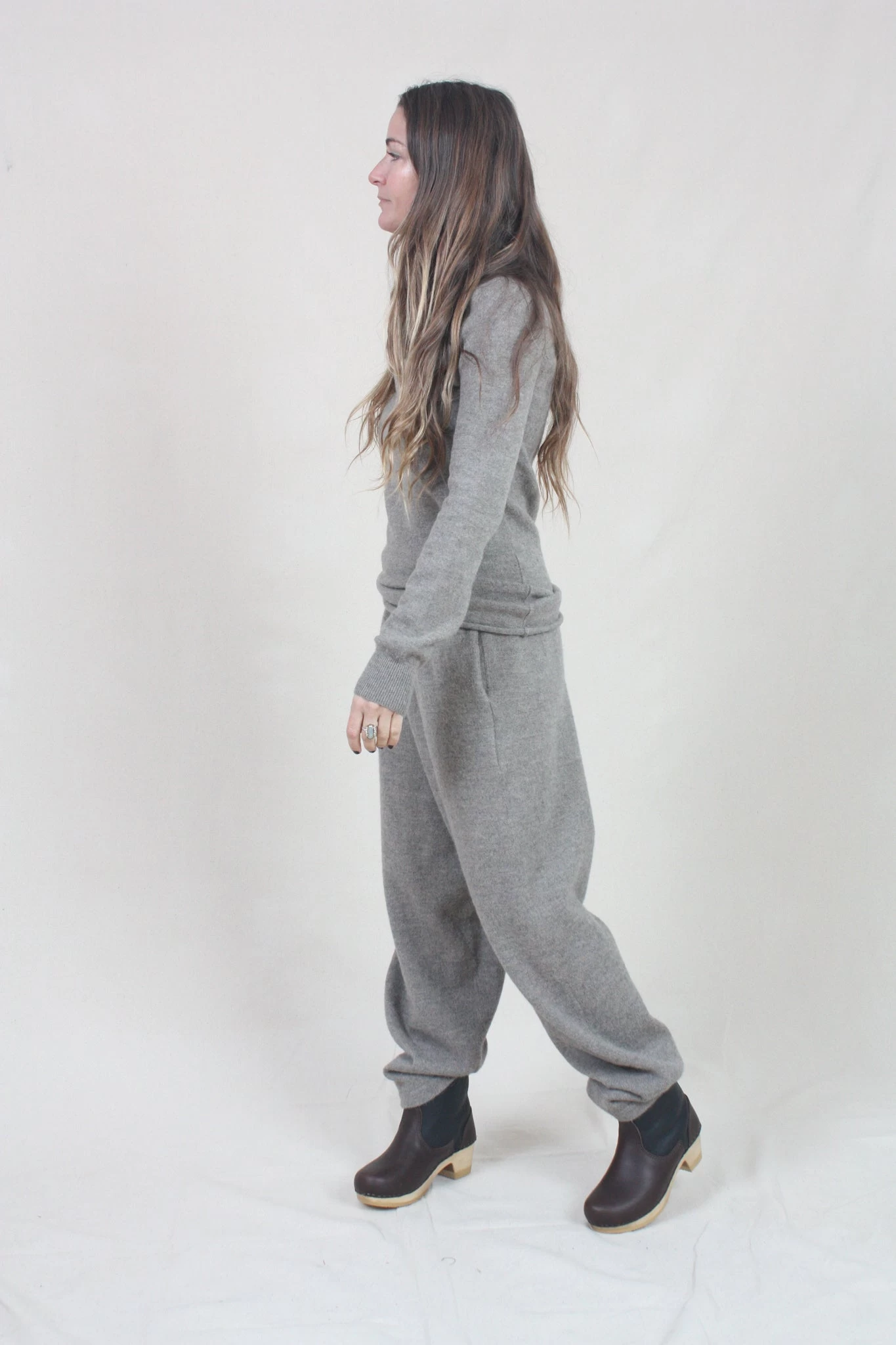 Fine weight knit pant with elastic waist and tubular cuff. Side seam pockets. Softly washed finish with stretch.