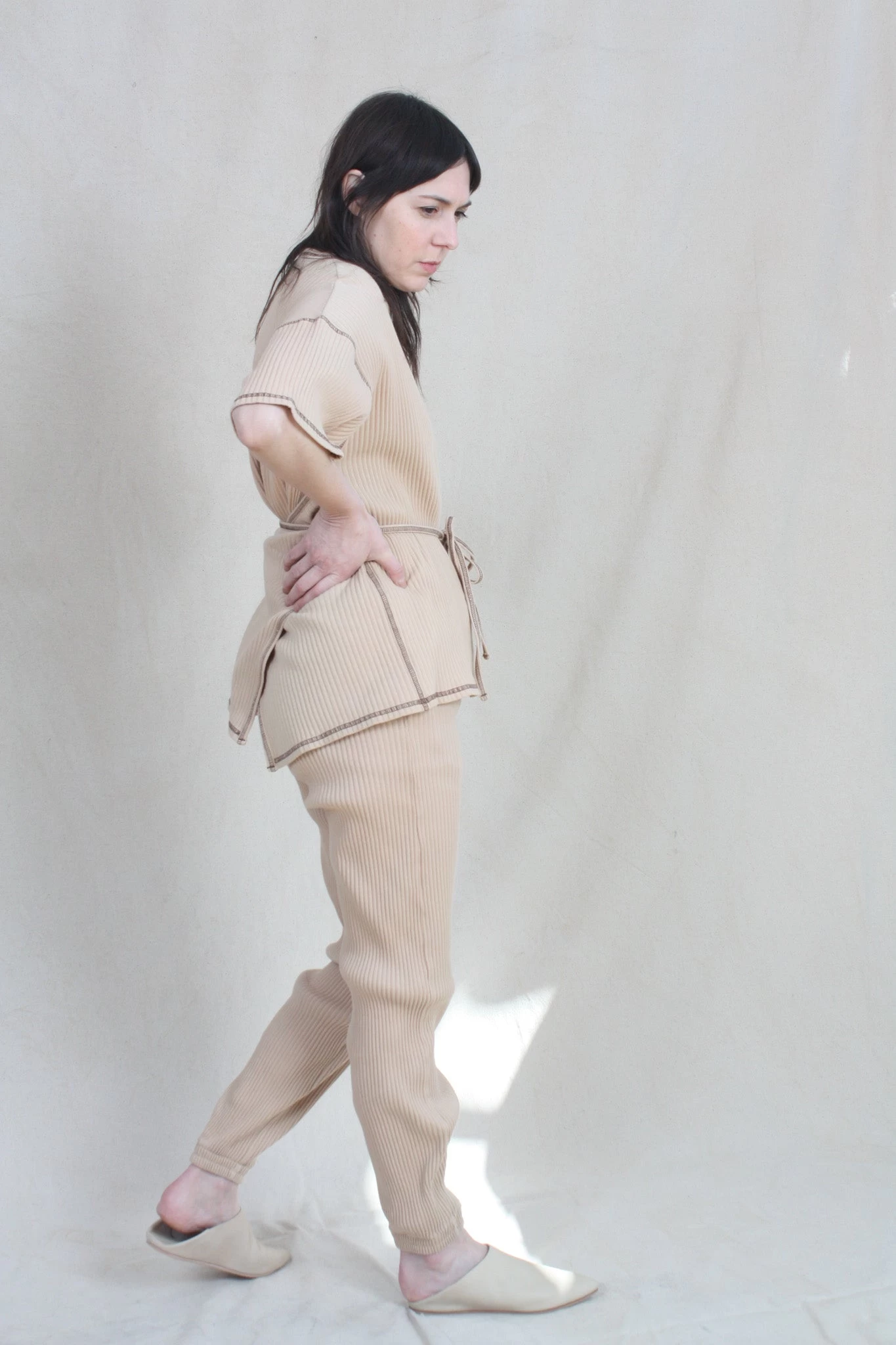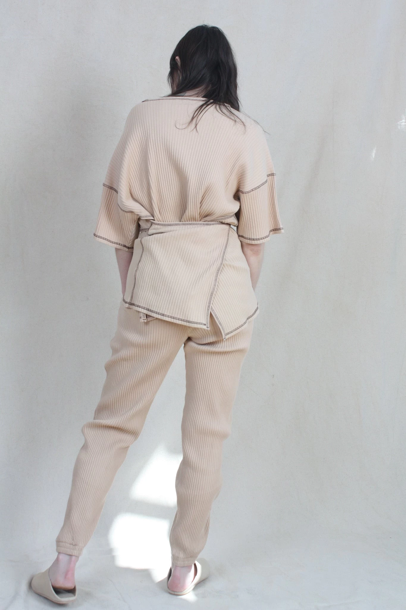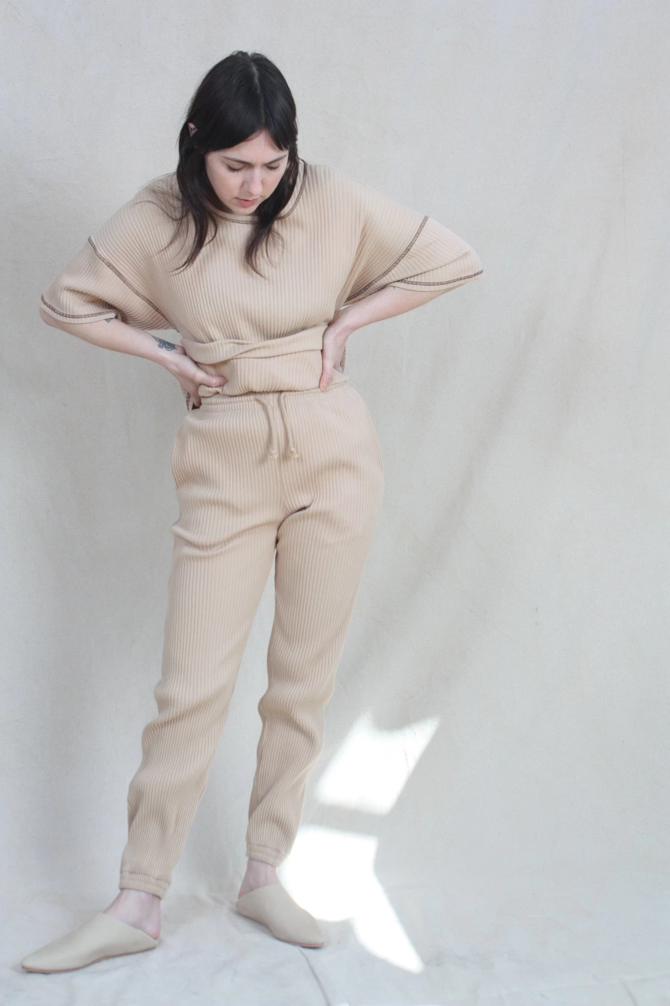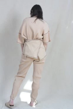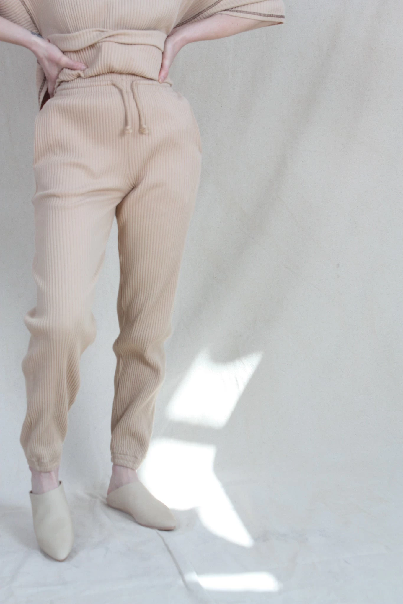 Organic cotton rib fleece sweat pant. Elasticized waistband with drawstring.
