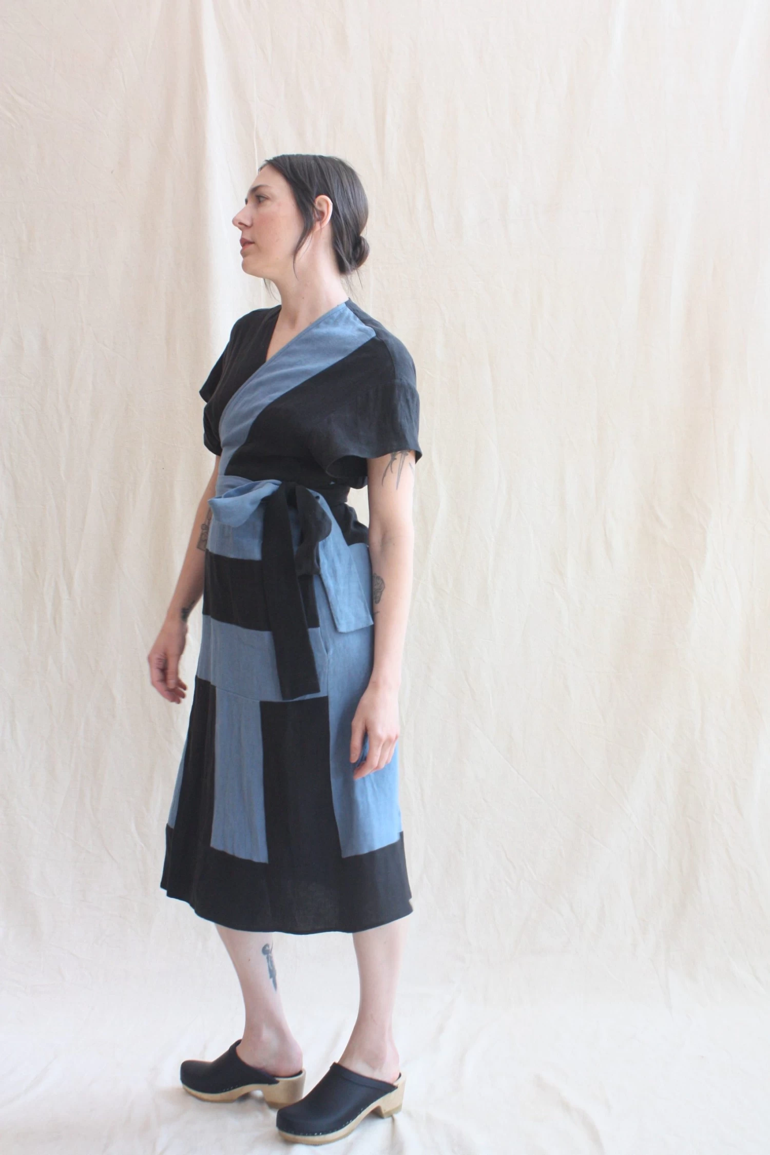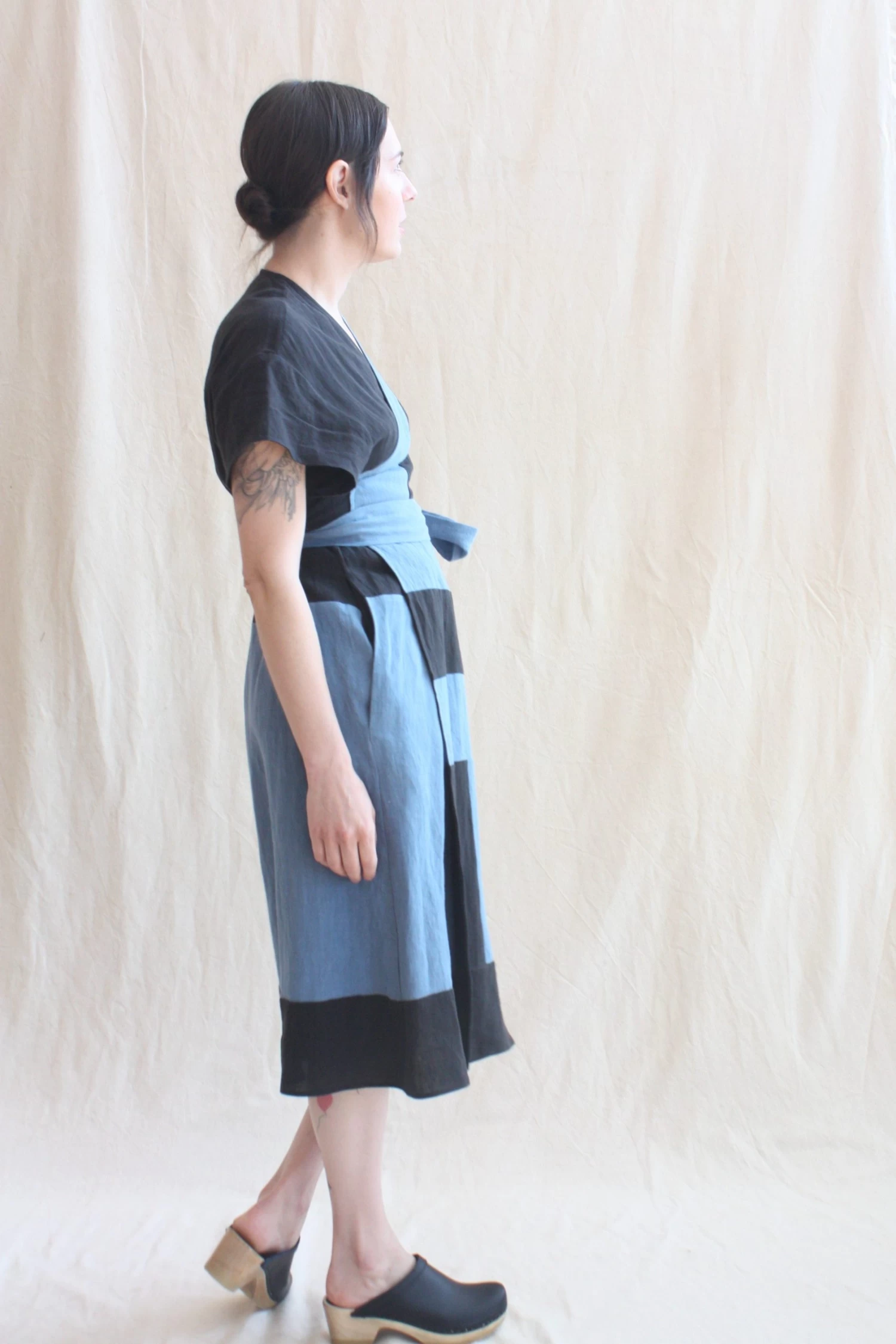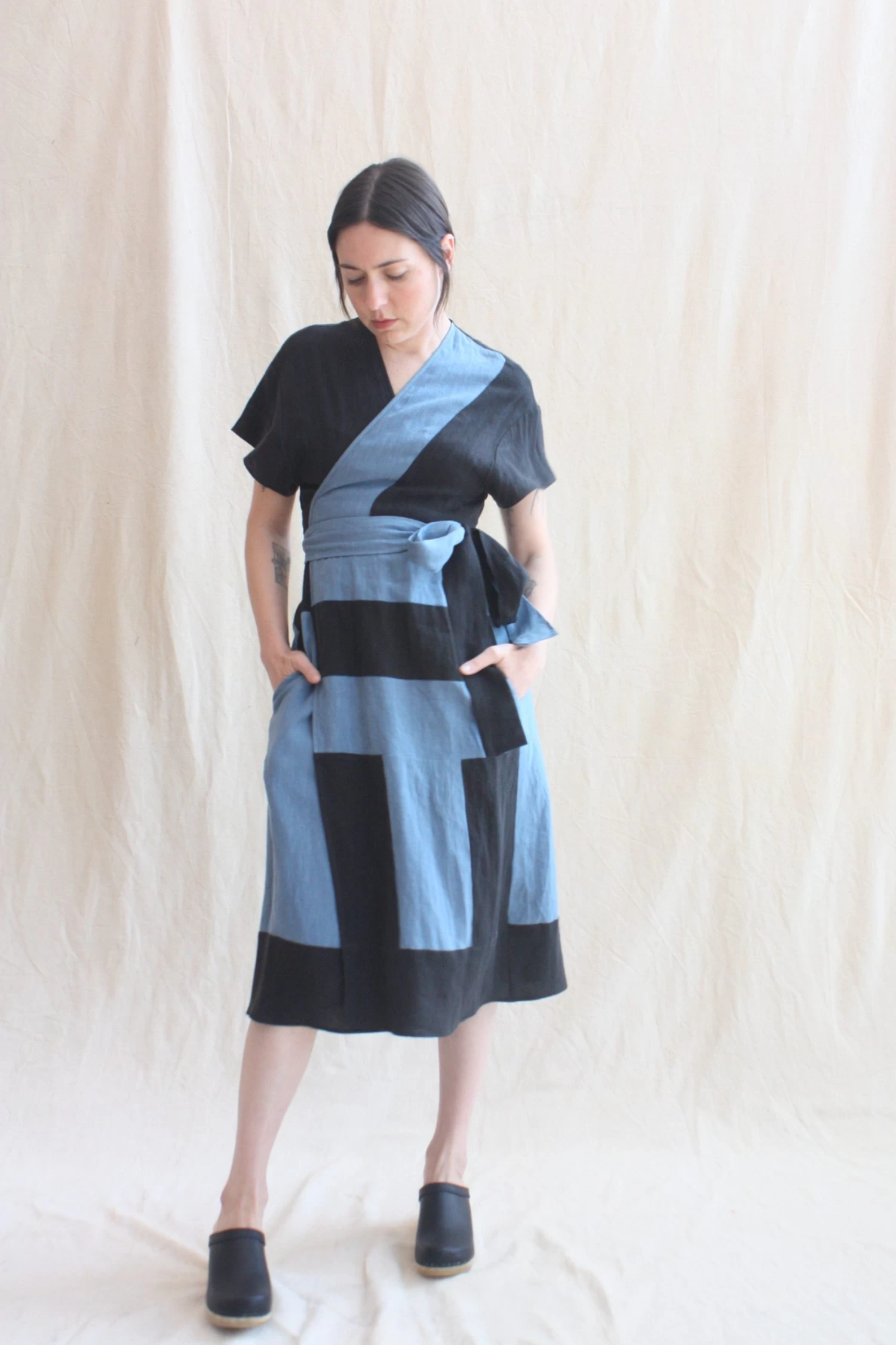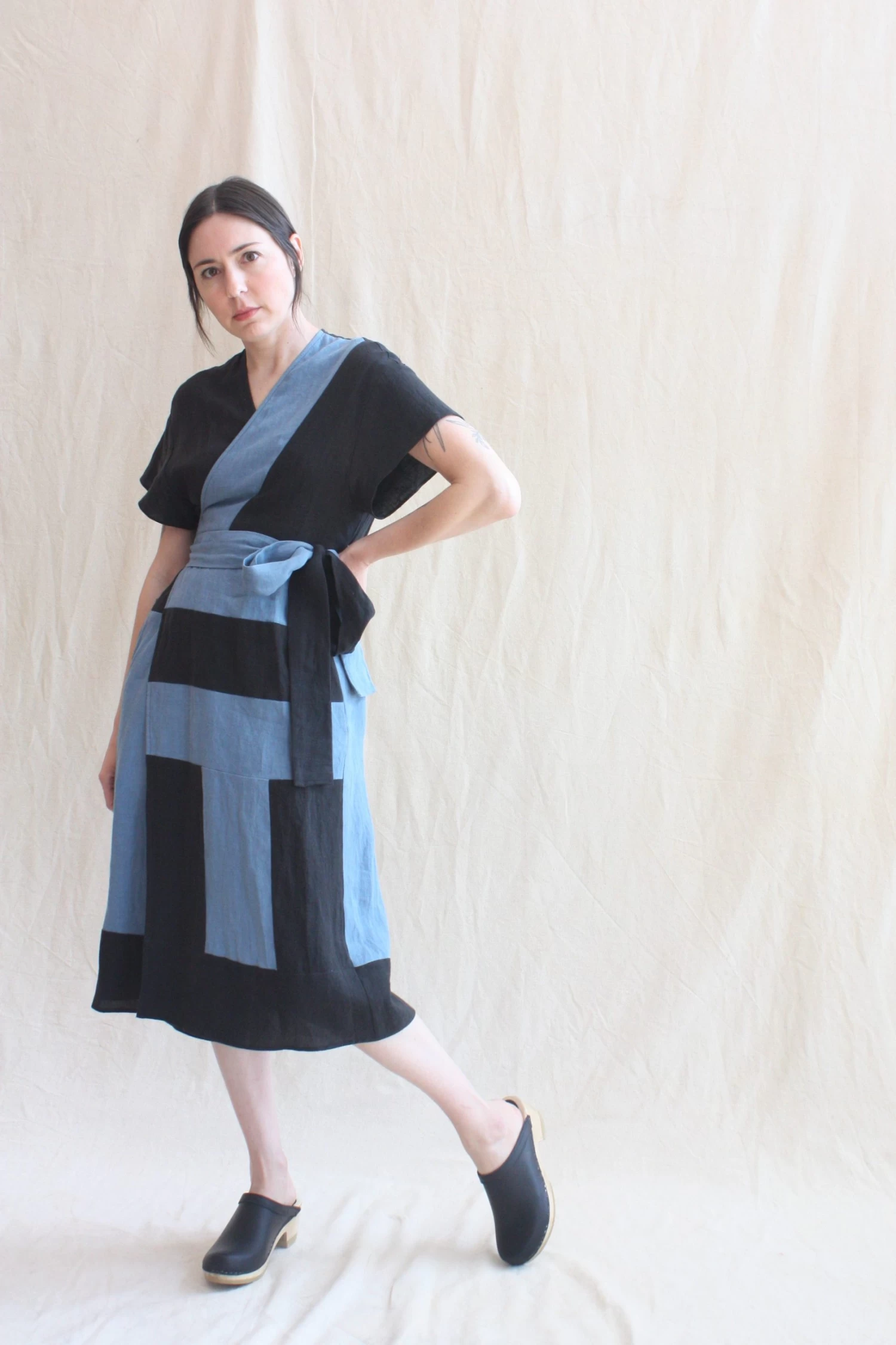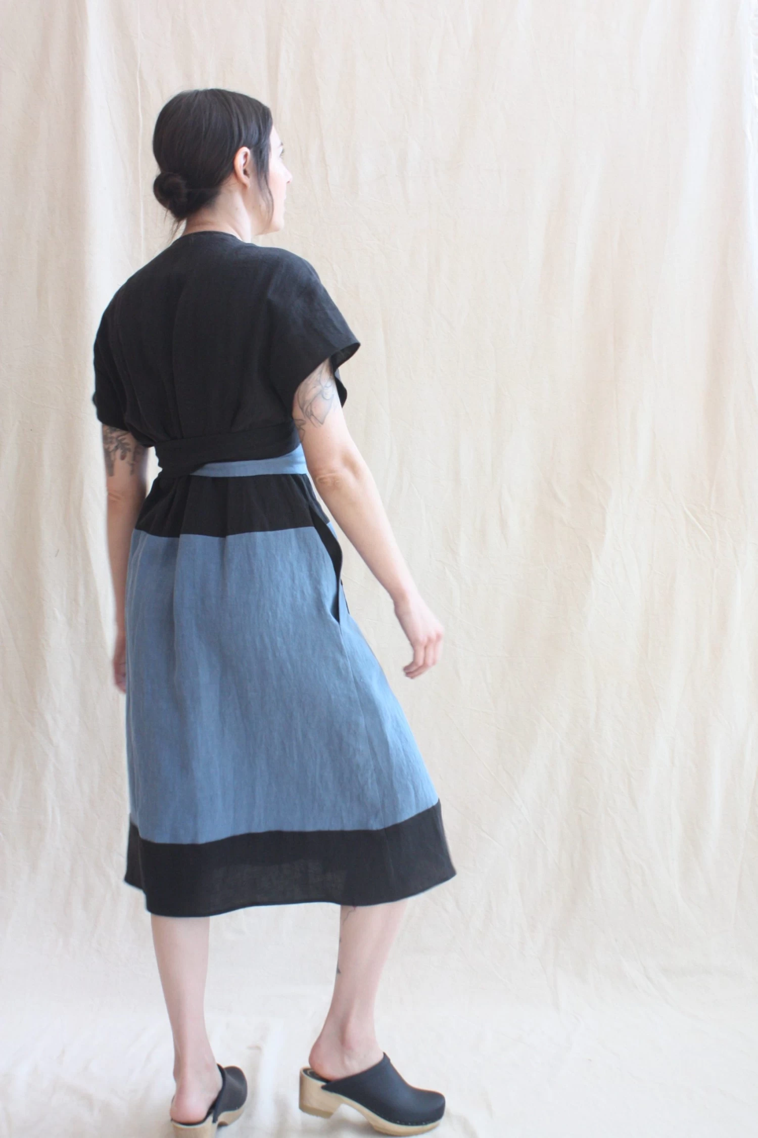 A summer dress in antique wash finish linen. Colorblocked belted wrap dress with short sleeves and side pockets. Relaxed knee-length fit.