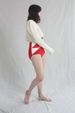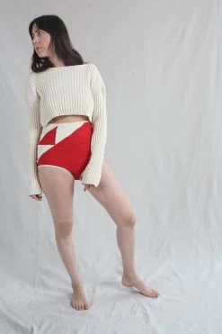 These high-rise undies are made entirely from t-shirts rescued from the waste cycle and 100% organic cotton grown in Texas. Wear them on the couch, in your yard, or under your clothes. They get their name from the triangle motif on the upper left corner- a patchwork pattern called “Birds In The Air”. Due to the nature of using reclaimed material, the exact color varies from pair to pair. There is no spandex in these, and they are only as stretchy as your favorite basic t-shirt.