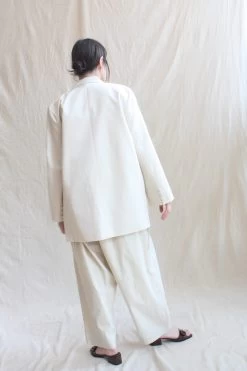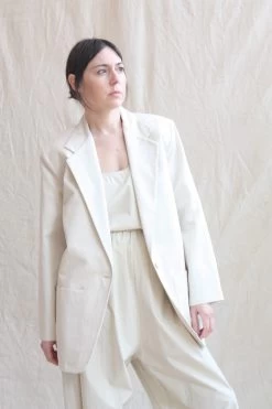 Single button closer peak lapel boxy blazer for all your summer layering needs. Oversized fit. Japanese cotton linen twill with parchment poplin lining. Patch pockets. Padded Shoulders. Self Covered buttons – Handmade in Italy. Pair with the coordinating Relaxed Lean Trouser.