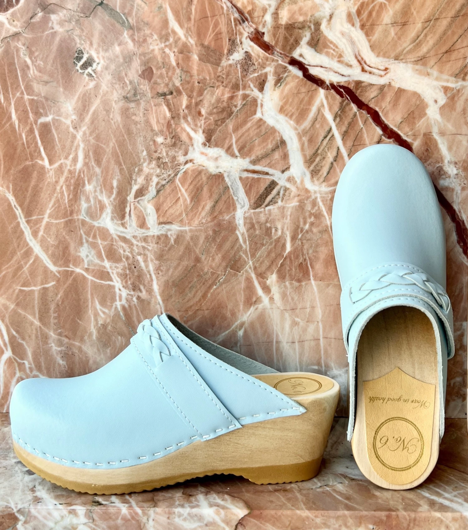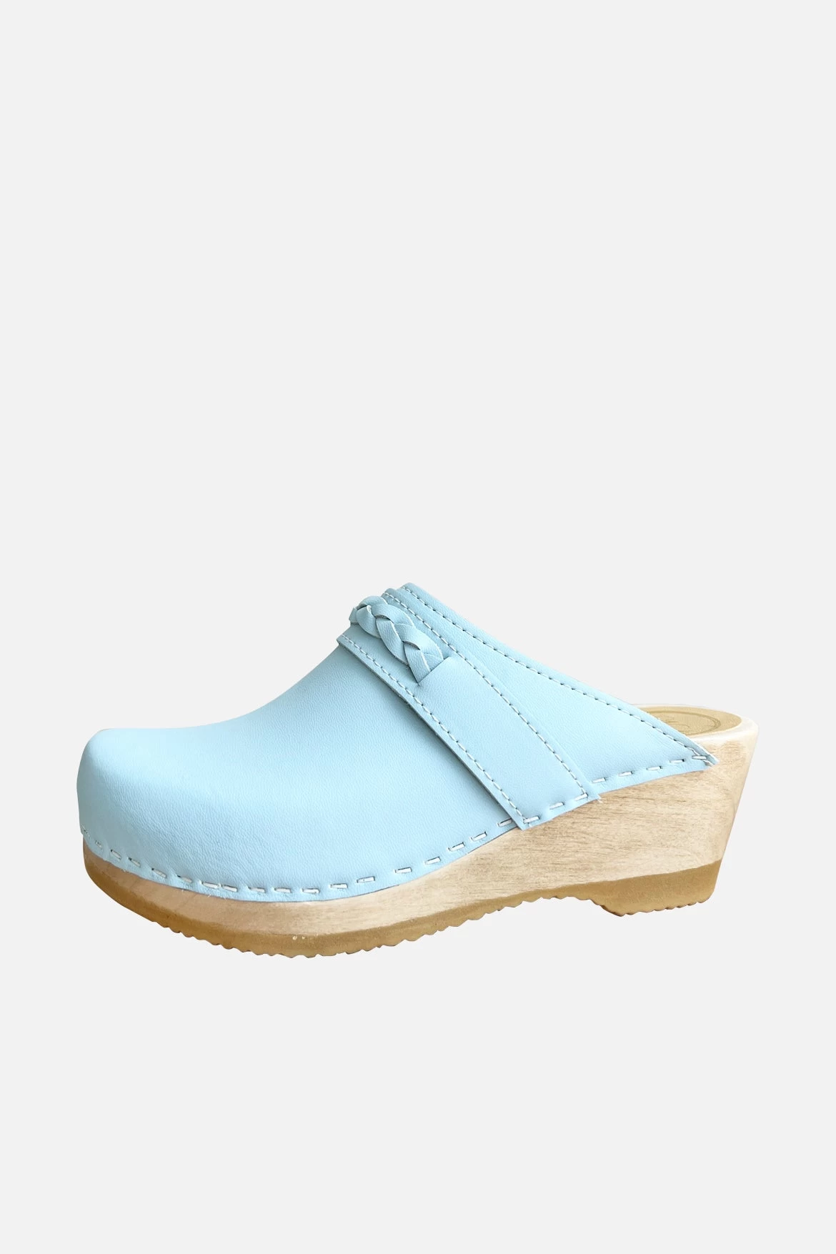Slip on, closed toe clog with braided band detail on a comfy mid wedge base. Soft, smooth, warm sky-blue leather upper. Stitched collar, slightly rounded toe and open back. Lacquered, lightweight wooden base.
