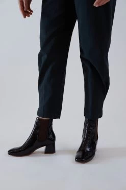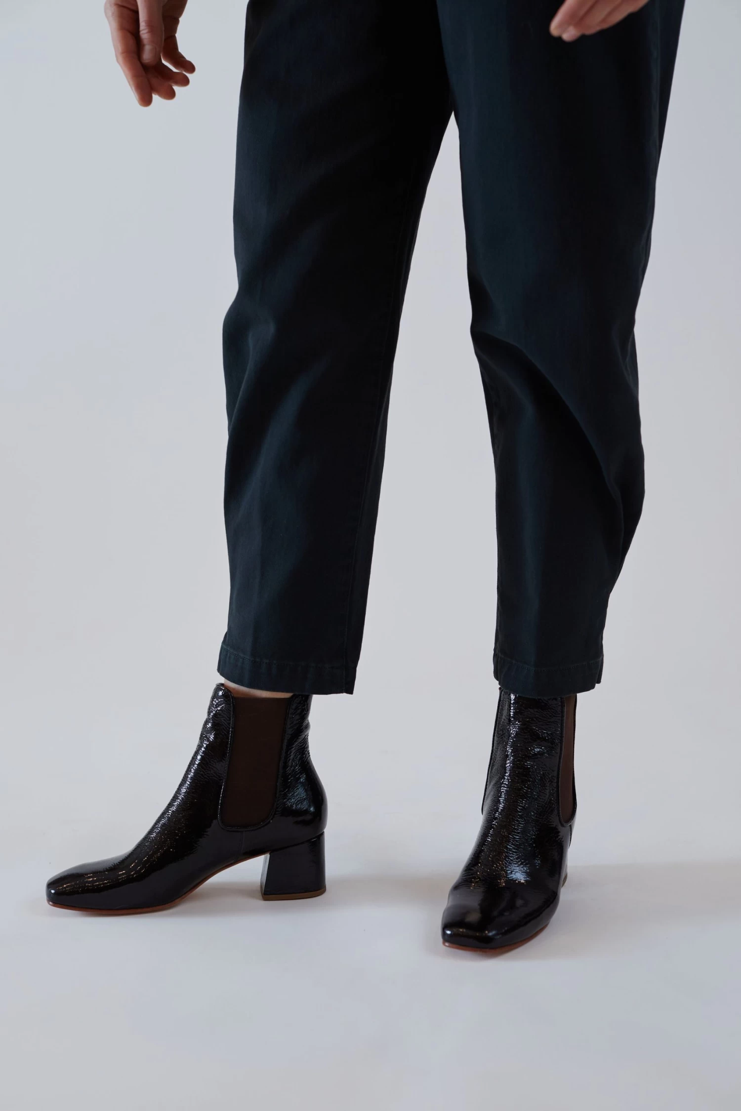 Sleek ankle boot with matching elastic gore and square toe. Soft, espresso crinkled patent leather upper. Piping at seams. Decorative back tab. Fully lined. Pulls on.