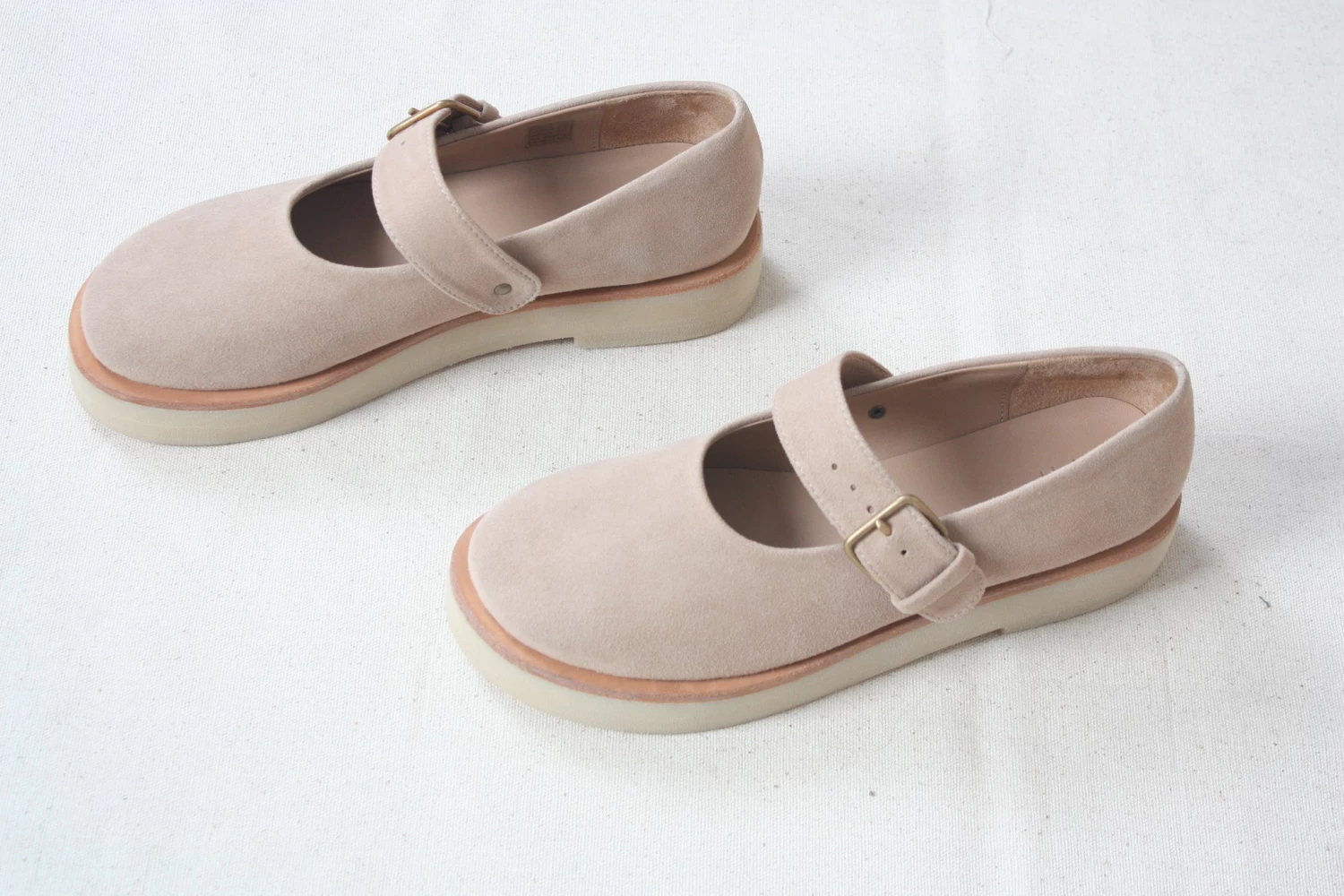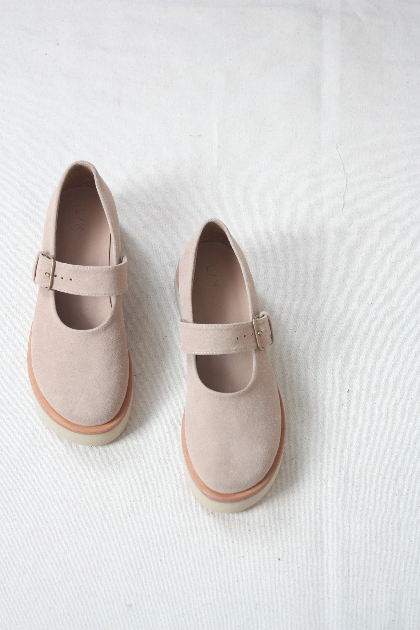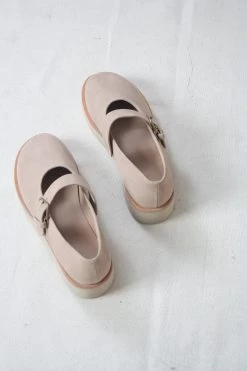 Soft, suede leather upper with hand-hammered bronze hardware. Natural crepe sole.