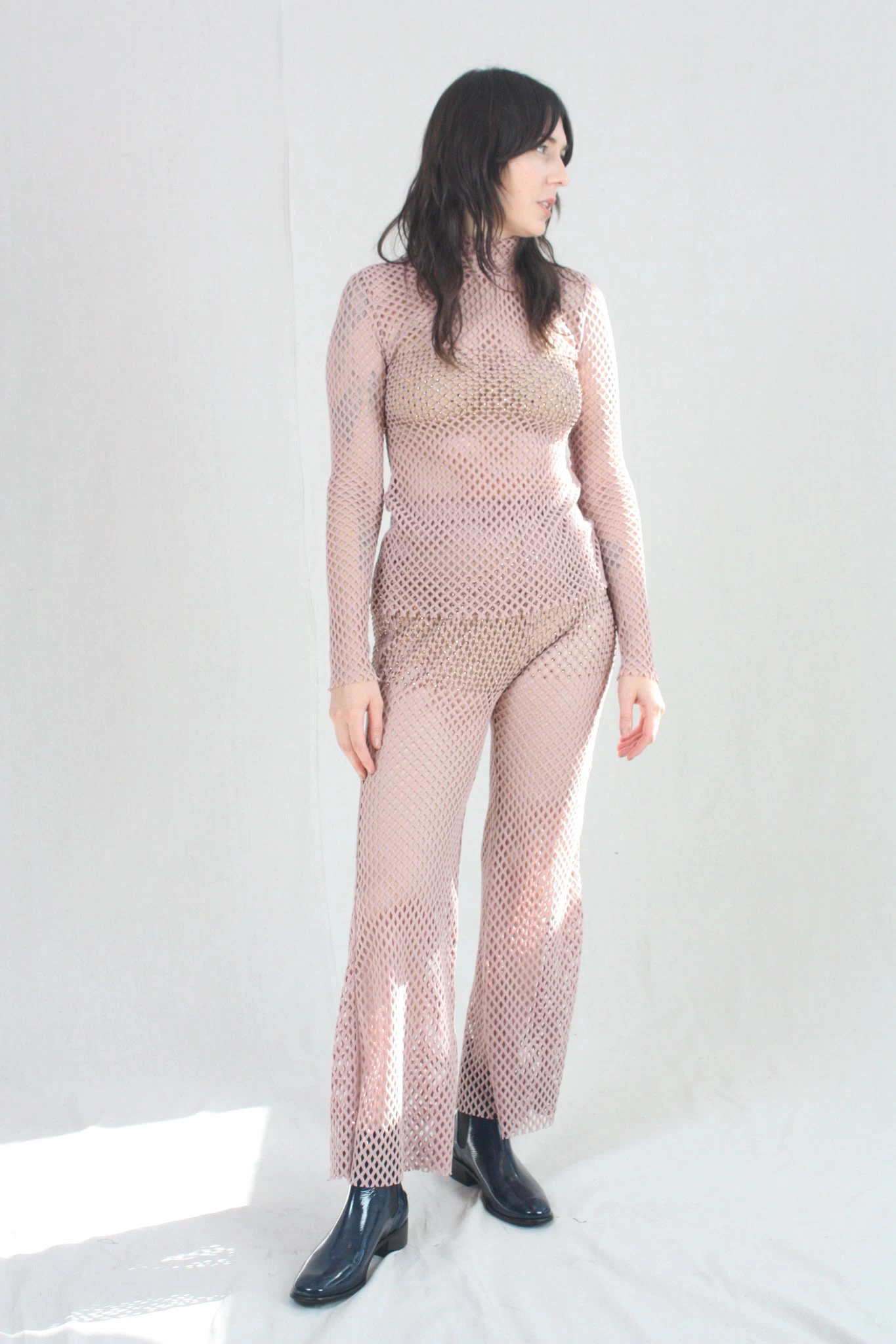 High-waisted, cropped flared pant in stretch open-weave cabaret Rhinestone Mesh. This fabric was created by New York makers, who individually applied each rhinestone to the mesh with a great deal of care, time and accuracy. The result is a thoughtfully engineered garment with a touch of sparkle. The hem falls in a swingy bell-shape at the calves, leaving room for a playful shoe. Zipper closure at side waist. Elasticized waist.