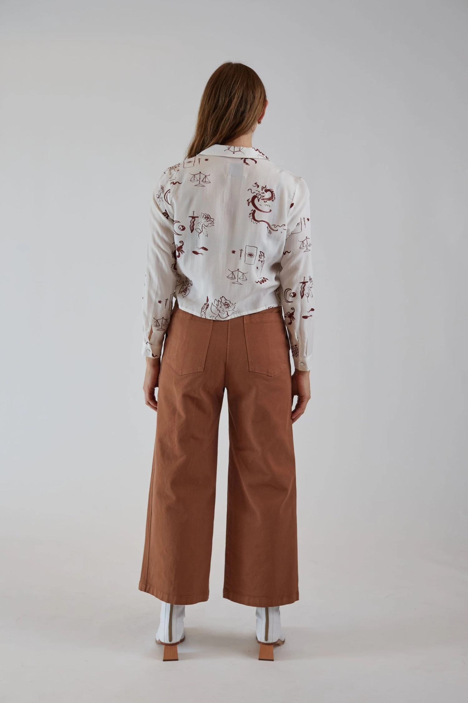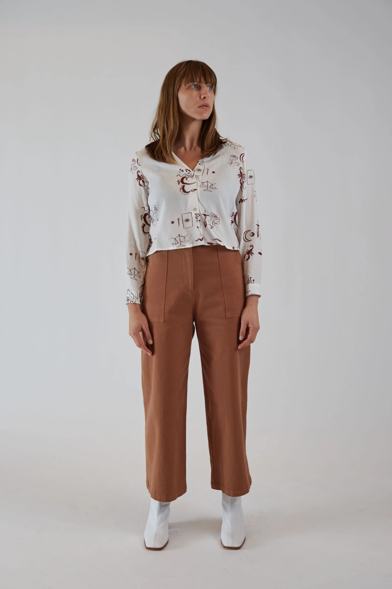 The Cargo Trouser is cut from a structured and soft heavy twill, has a high rise waist that is fitted through the hips and opens up to a crop wide leg. Styled with front and back utility pockets.