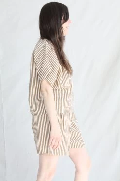AÂ relaxed short with an elastic waistband. Front creased box pleats. Side seam pockets. The printed stripe is imperfect due to the texture of the linen.