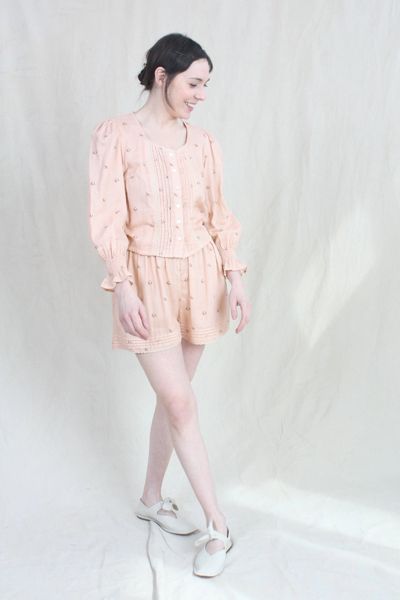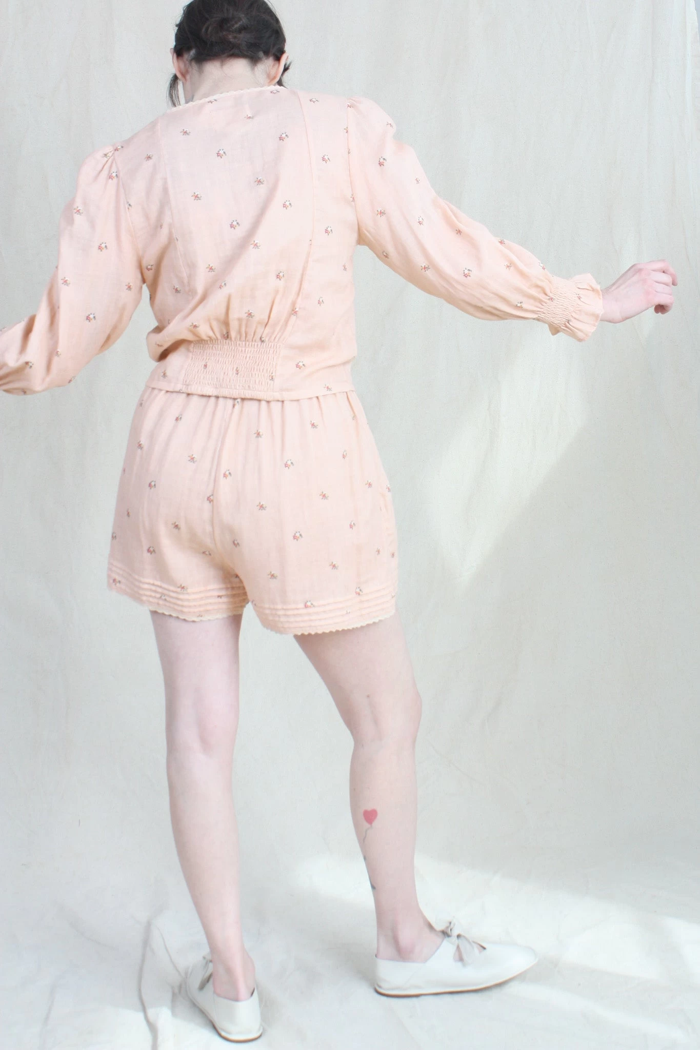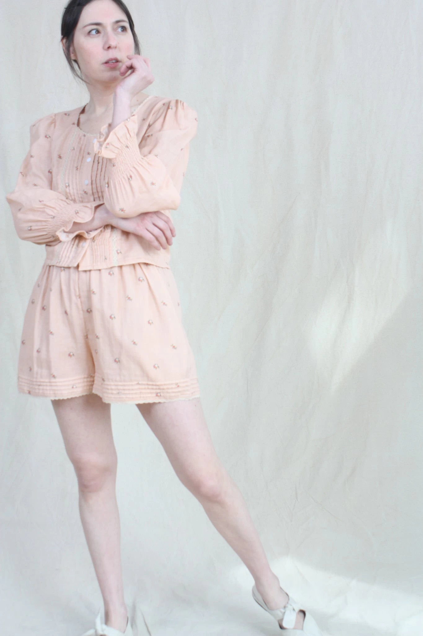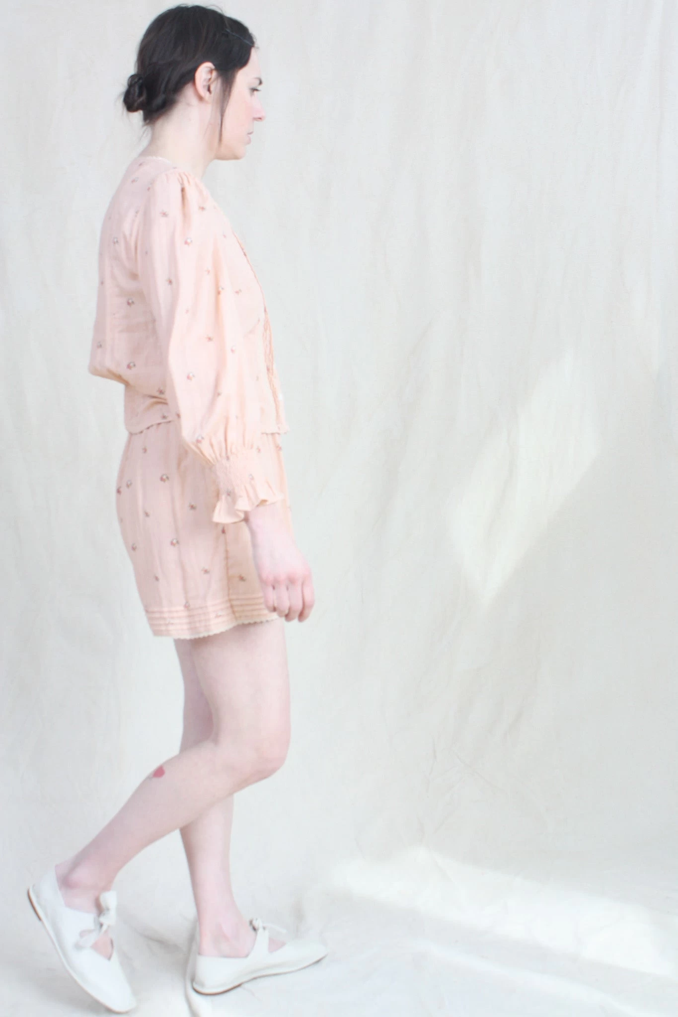 The Caspia Shorts have an elasticated gathered waist with side and back pockets. Lace detailing on the hem with embroidered floral detailing on a pink base. Pair with the coordinating Linden Top in Pink Floral.