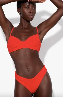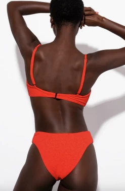 Cece is a fully-lined bikini bottom with a high-leg cut. Provides minimal coverage. Made from recycled polyester and spandex with UPF 50+ protection in a textured, vibrant poppy-colored fabric. Pair with the coordinating Lira Bikini Top.