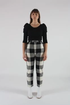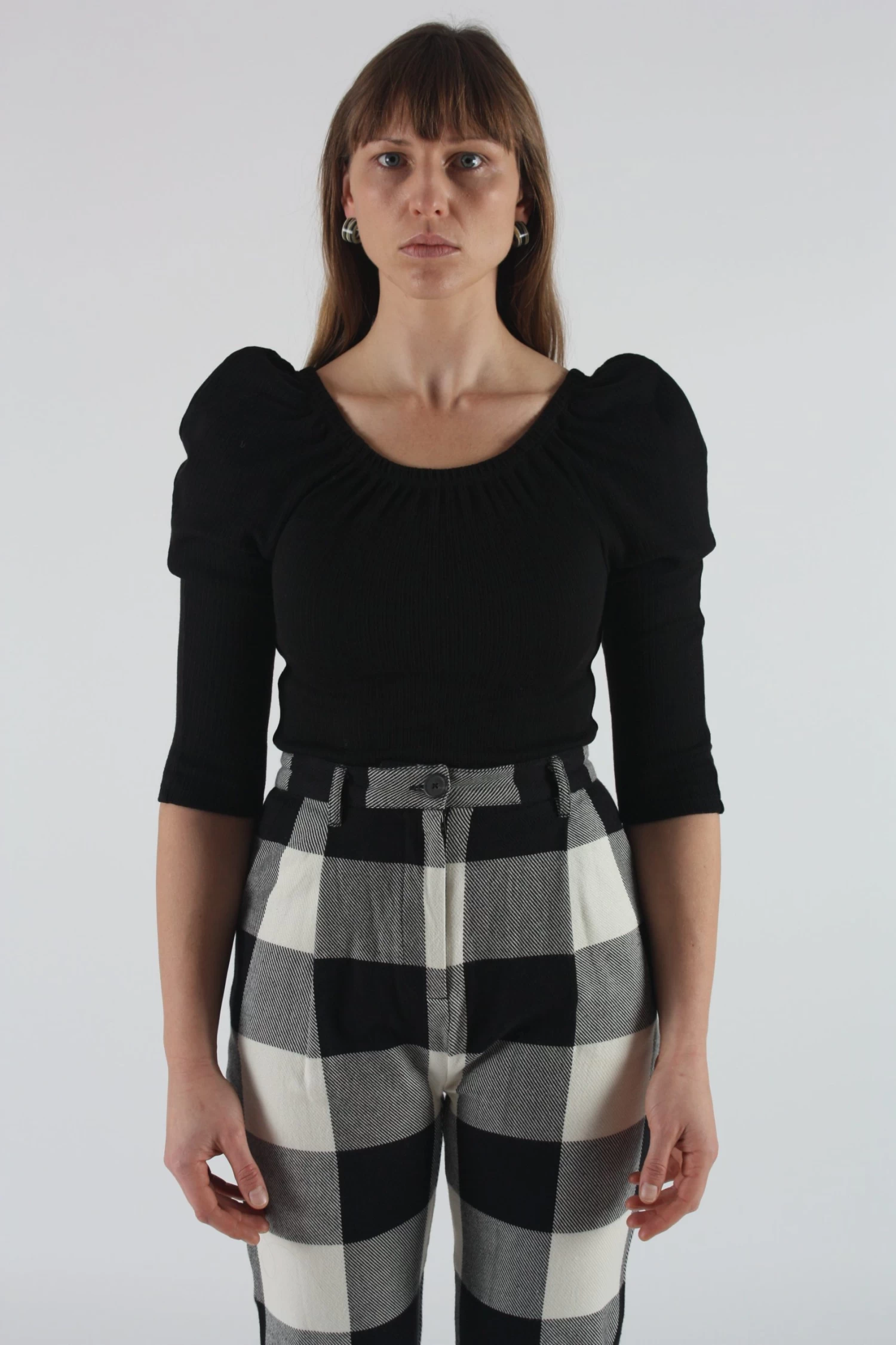 Chiara knit bodysuit in black rib. 3/4 length sleeves with puff shoulders. Snap crotch closure.