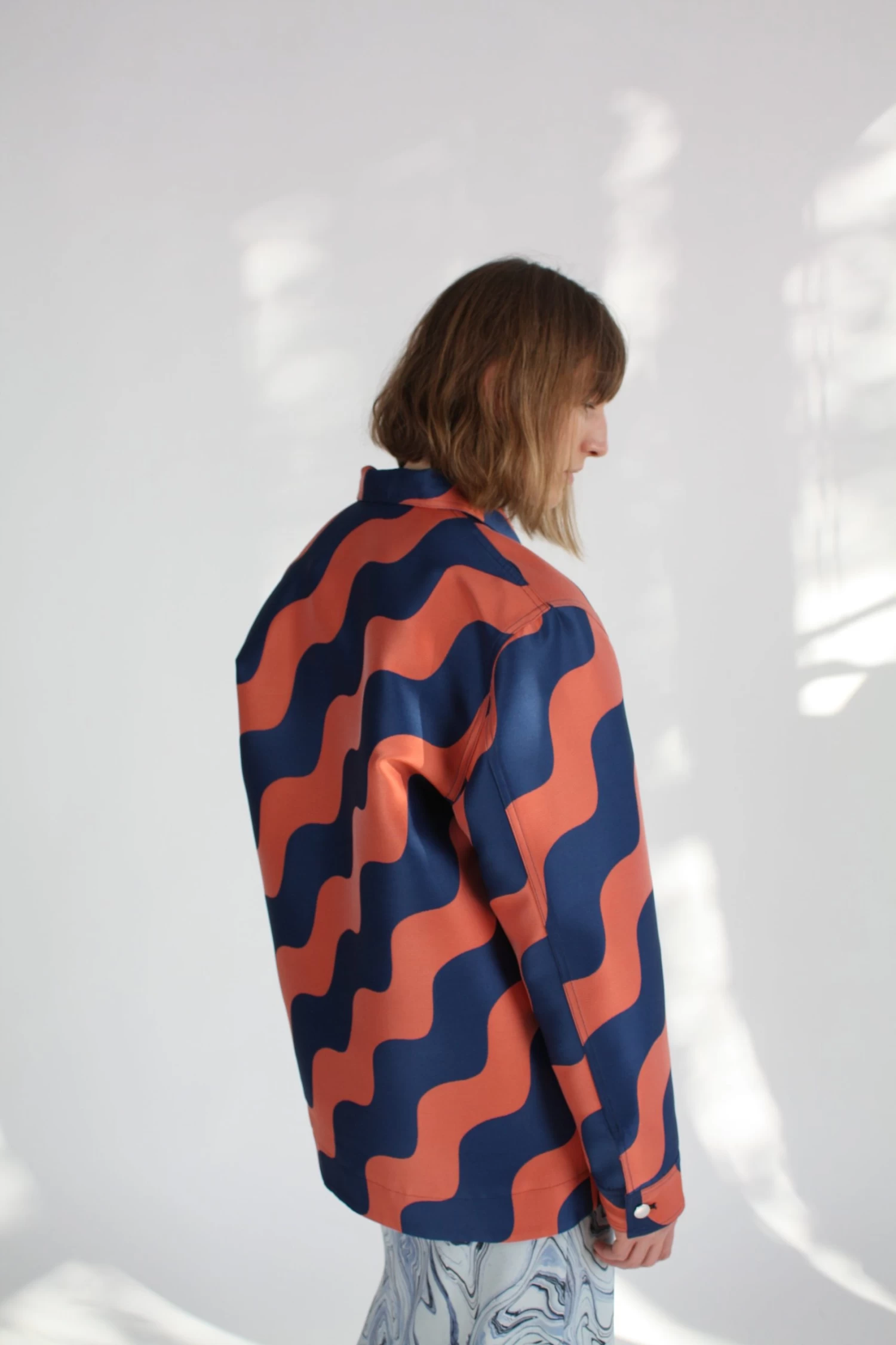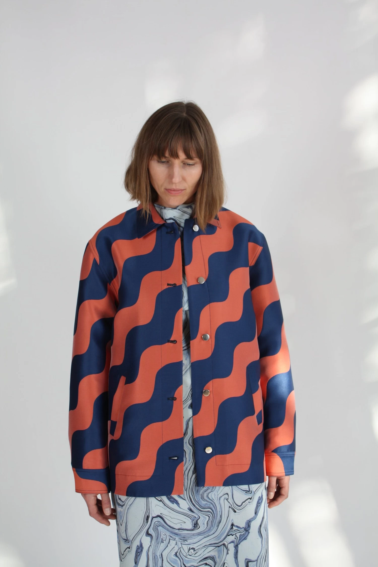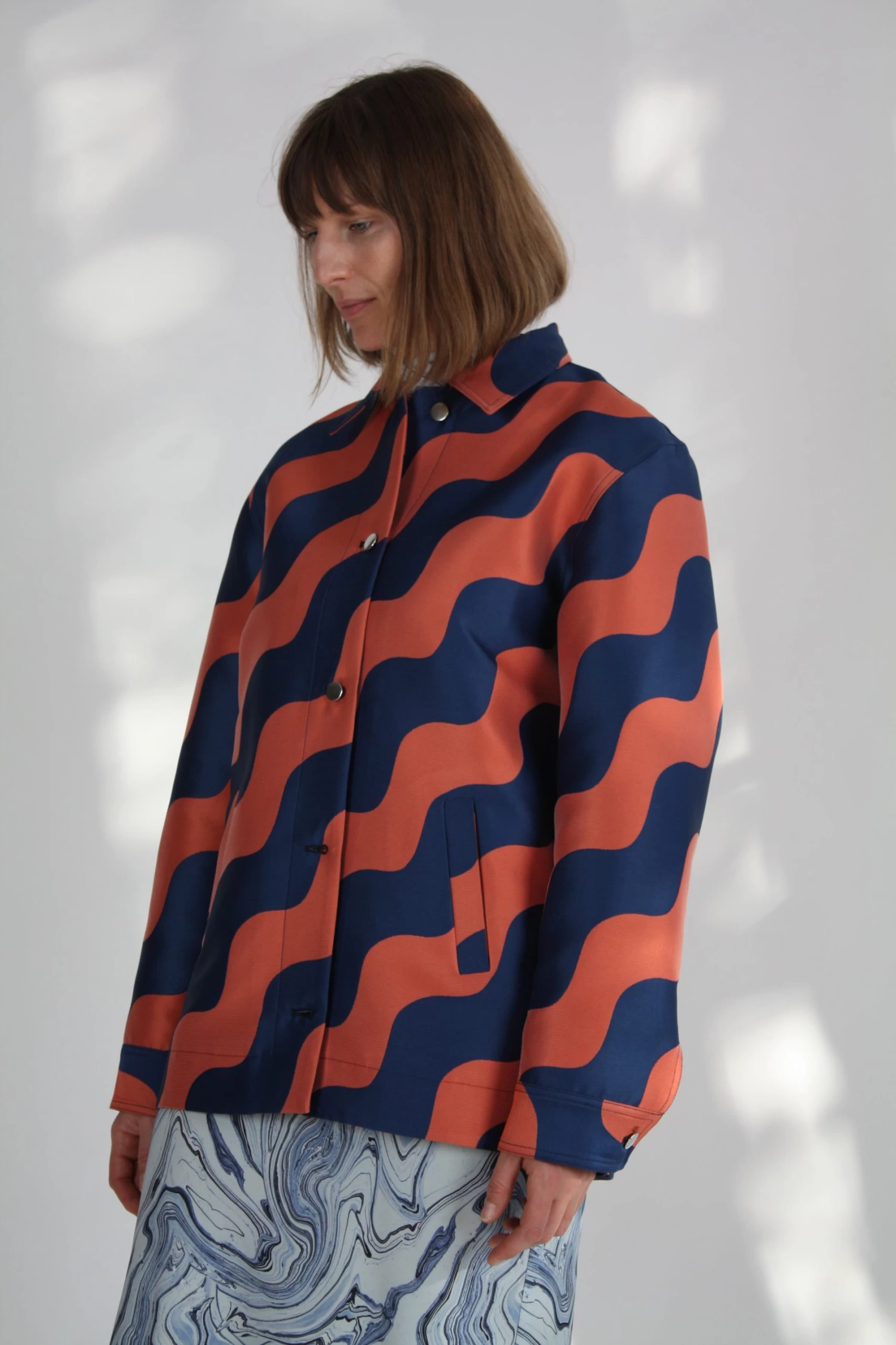 Oversized chore jacket in a wave pattern Italian Jacquard. Silver tone shank button and 2 welt pockets.