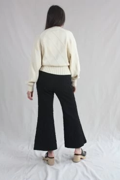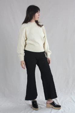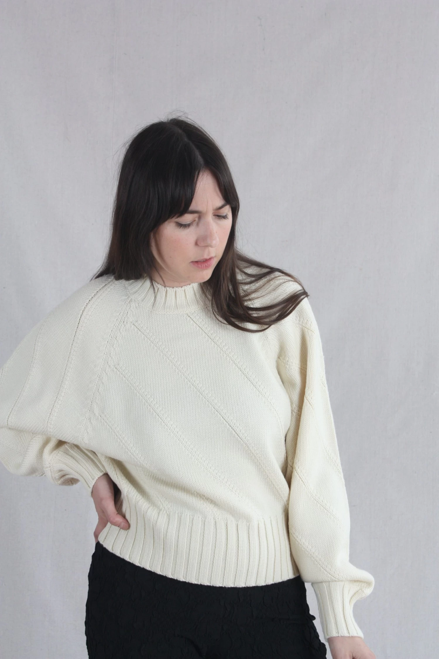 Pullover sweater with a beautiful diagonal rib-knit pattern. Rib knit round neck and long raglan sleeves. Rib knit cuff and hem. Slouchy fit