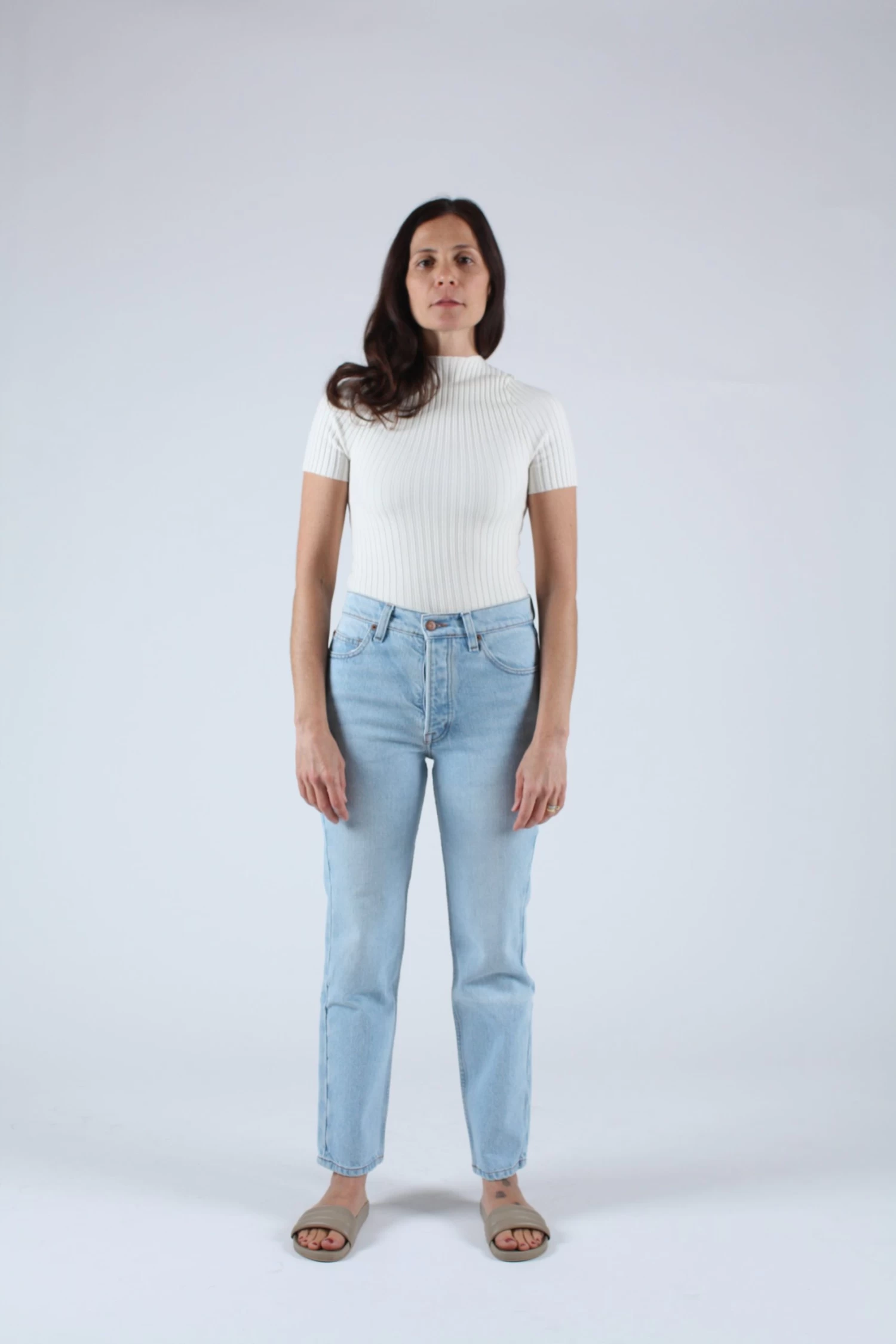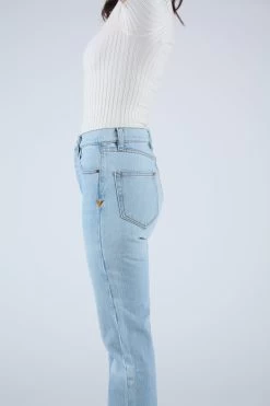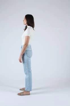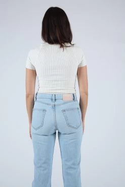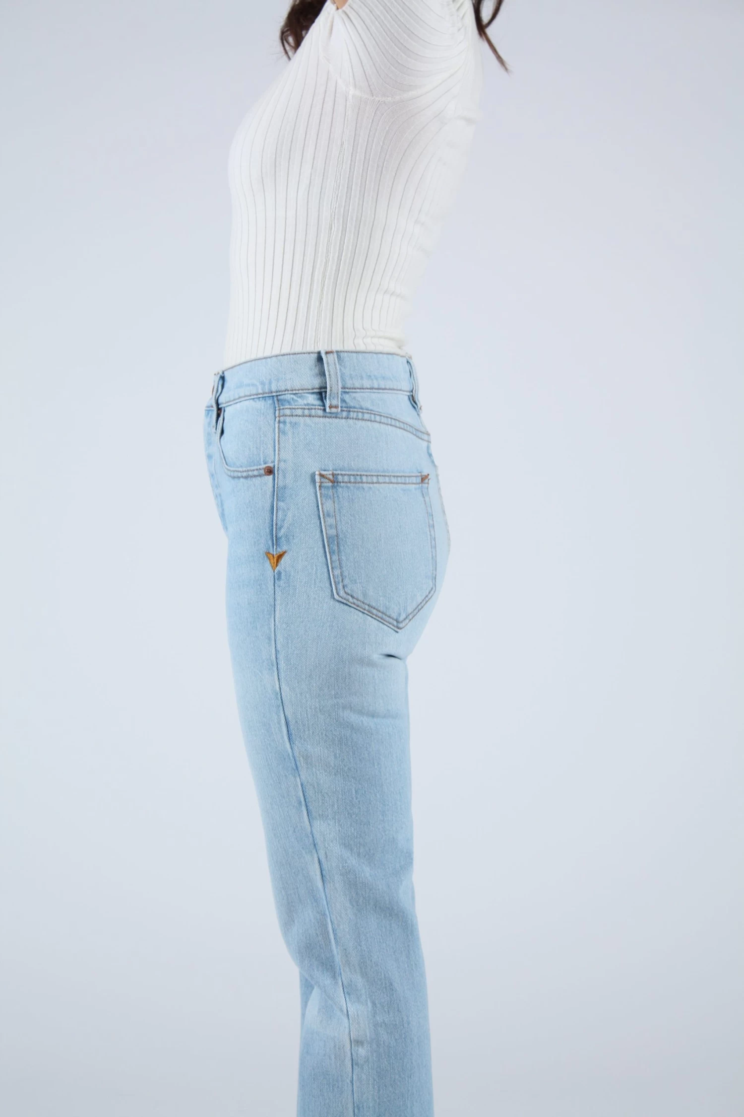 A timeless button fly silhouette with a rise that sits at high hip, eases into a straight leg, and hits at the ankle. Light wash deadstock cotton indigo denim. Each pair features custom BAM hardware, pocket bags made from deadstock stripe shirtings, and our signature embroidered Western arrow bar tack.