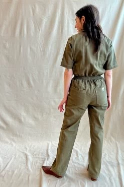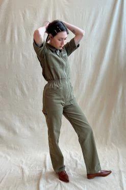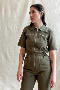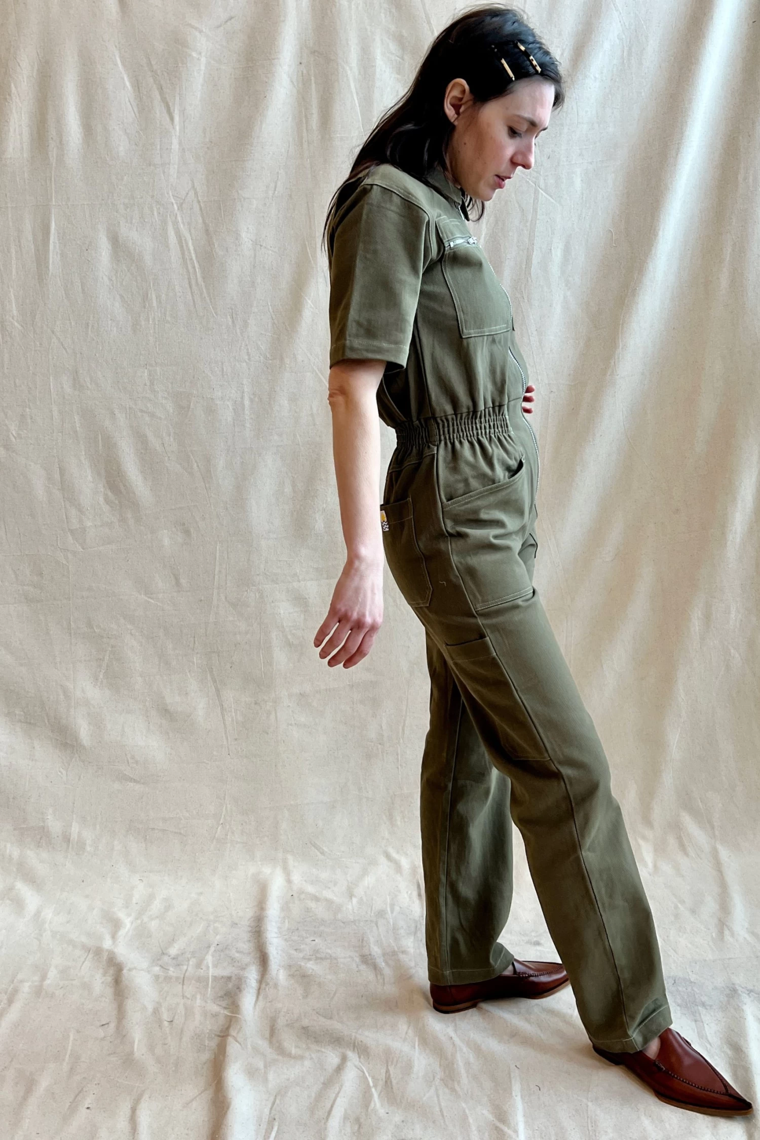 A shortsleeve 70’s style Boilersuit in cotton drill. With a metal front zip, workwear pocket details and an elasticated waist for a flattering fit.