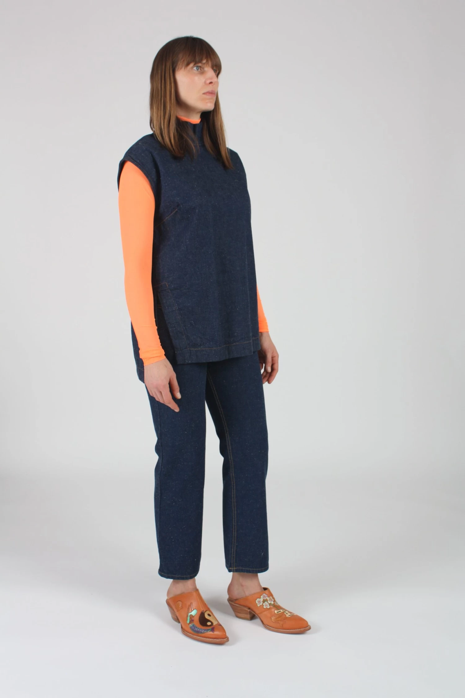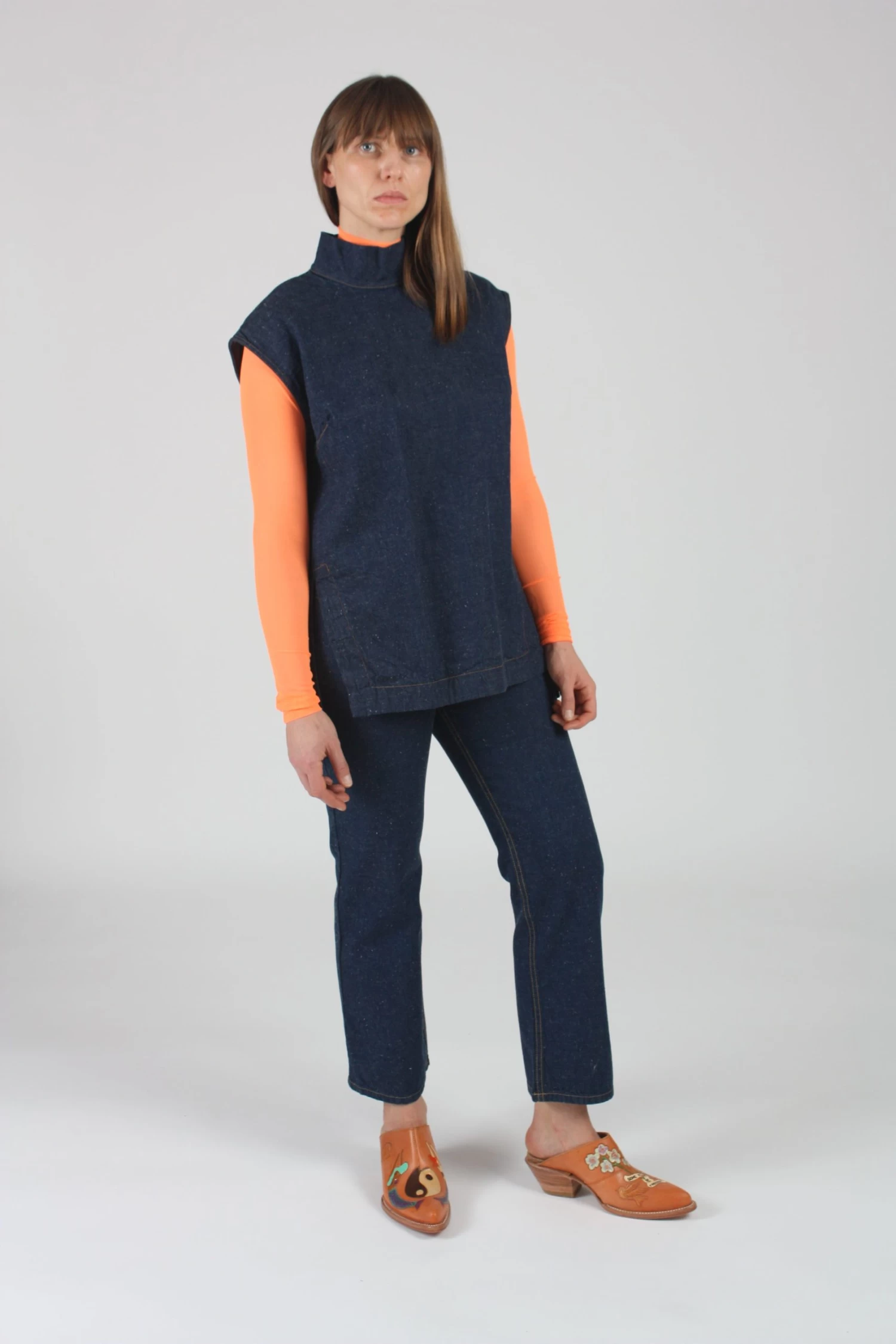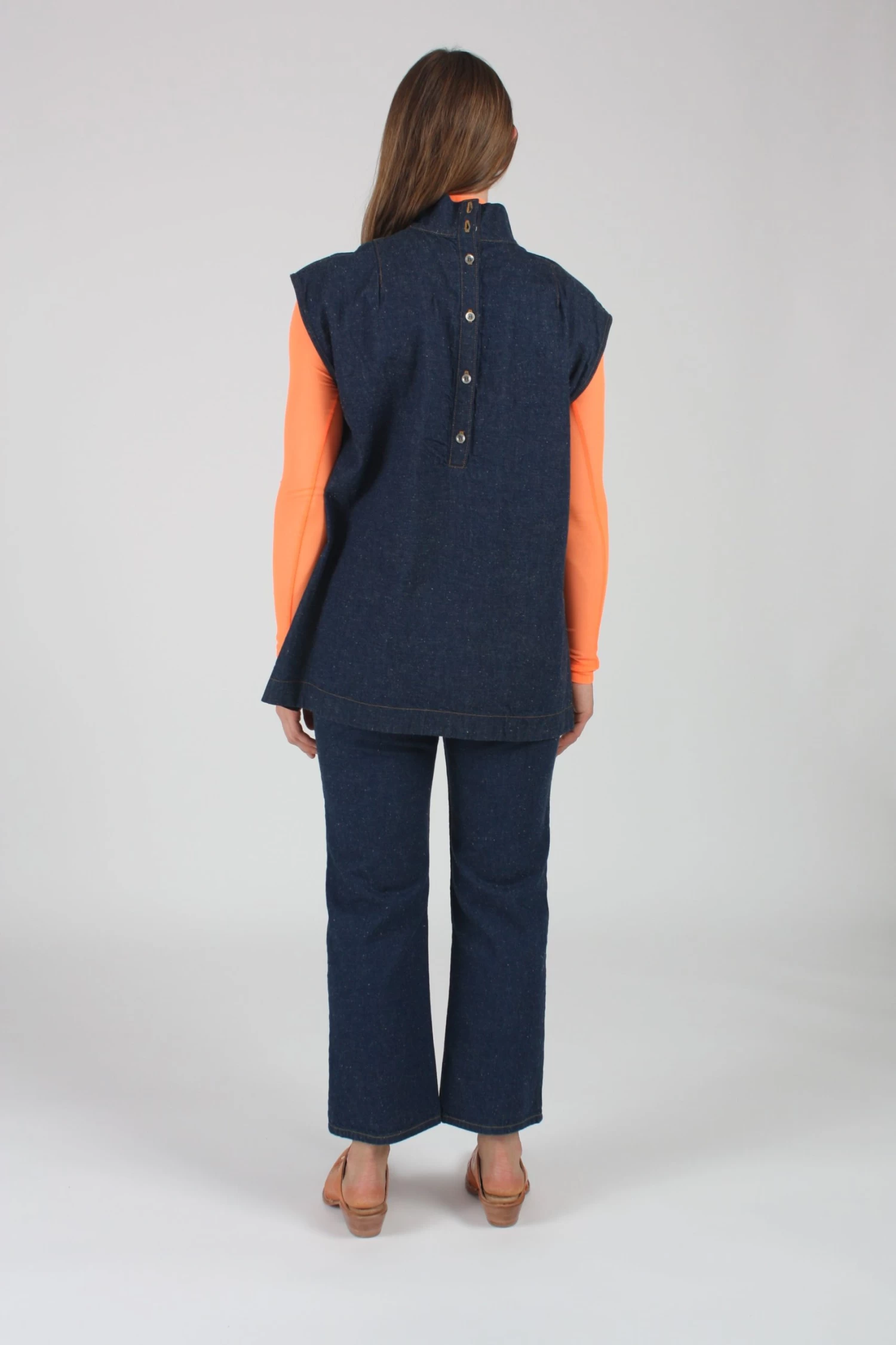 Long mockneck sleeveless relaxed fir tunic in raw indigo denim. Side slit details and exposed button placket closure at back. Dart shaping at bust and shoulders. This denim comes from a mill who is a member of the Better Cotton Initiative, a membership-based organization focused on creating a more sustainable cotton sector.