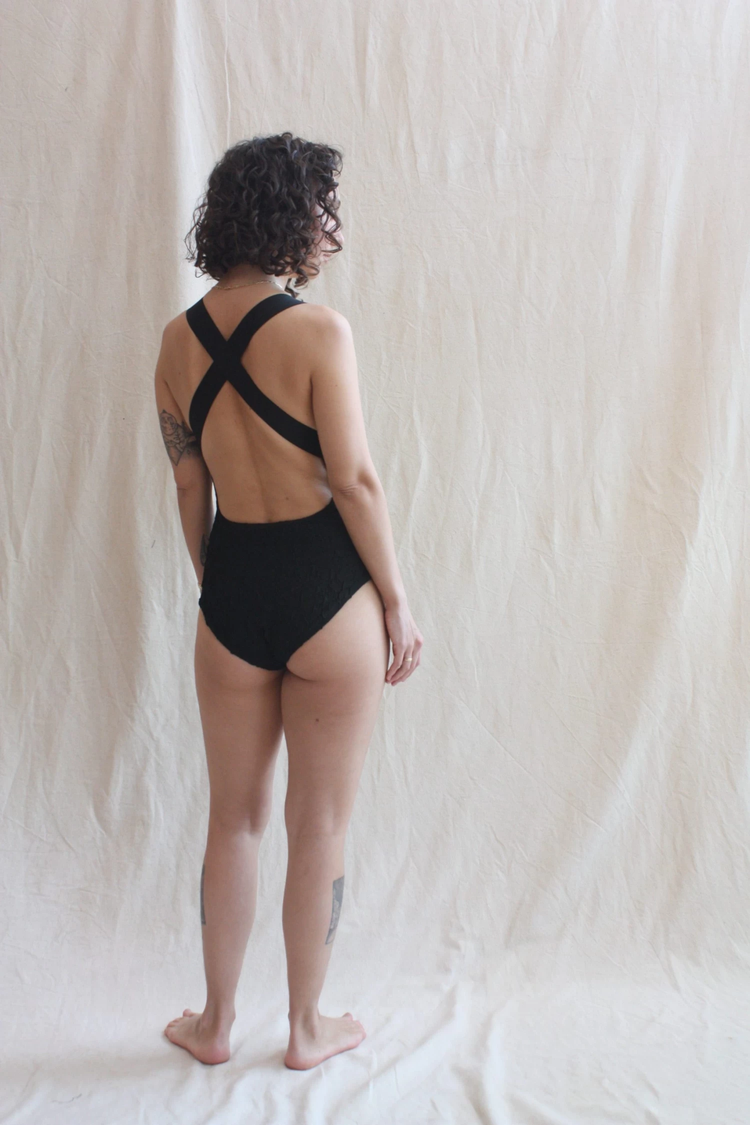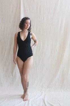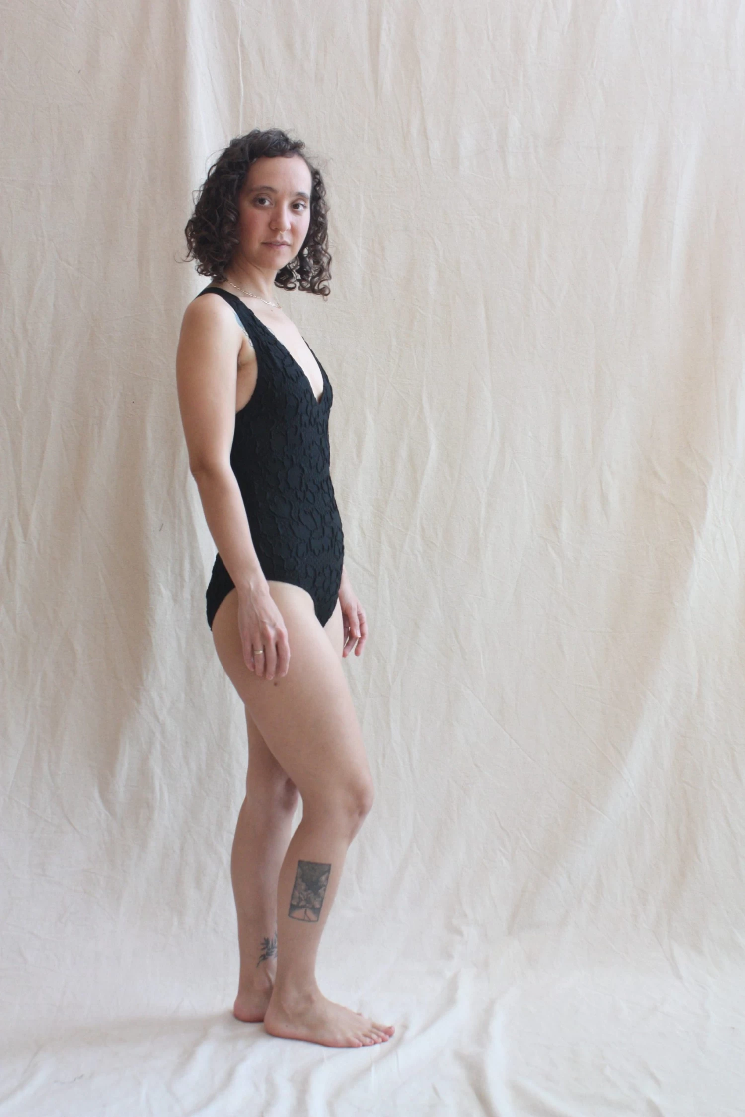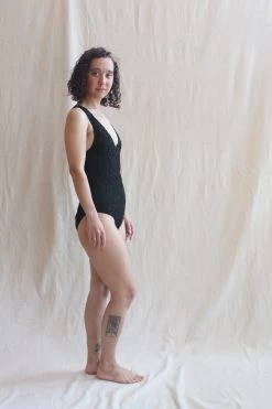 One-piece swimsuit in textured jacquard Flower Stretch with wide elastic straps across the back and scalloped edges. Wear as a swimsuit or style as a bodysuit. One of the Rachel Comey customer’s favorite fabrications, this soft bi-stretch fabric is made in Lyon, France, by a mill that specializes in swimwear and lingerie materials. Coordinates with the Dara Skirt.