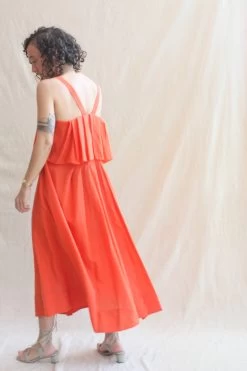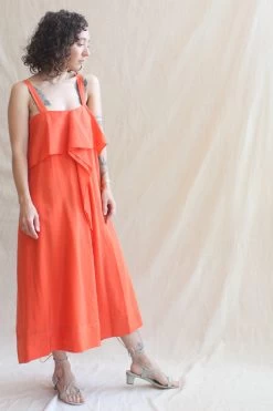 Strappy, diaphanous pintuck-front dress with a ruffled bust and subtly flared skirt, in airy, wrinkle-resistant Poppy cupro. The Dovalina is constructed of lightweight, delicate red cupro fabric, with a crisp hand feel and soft pebble texture.
