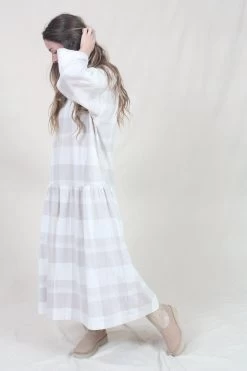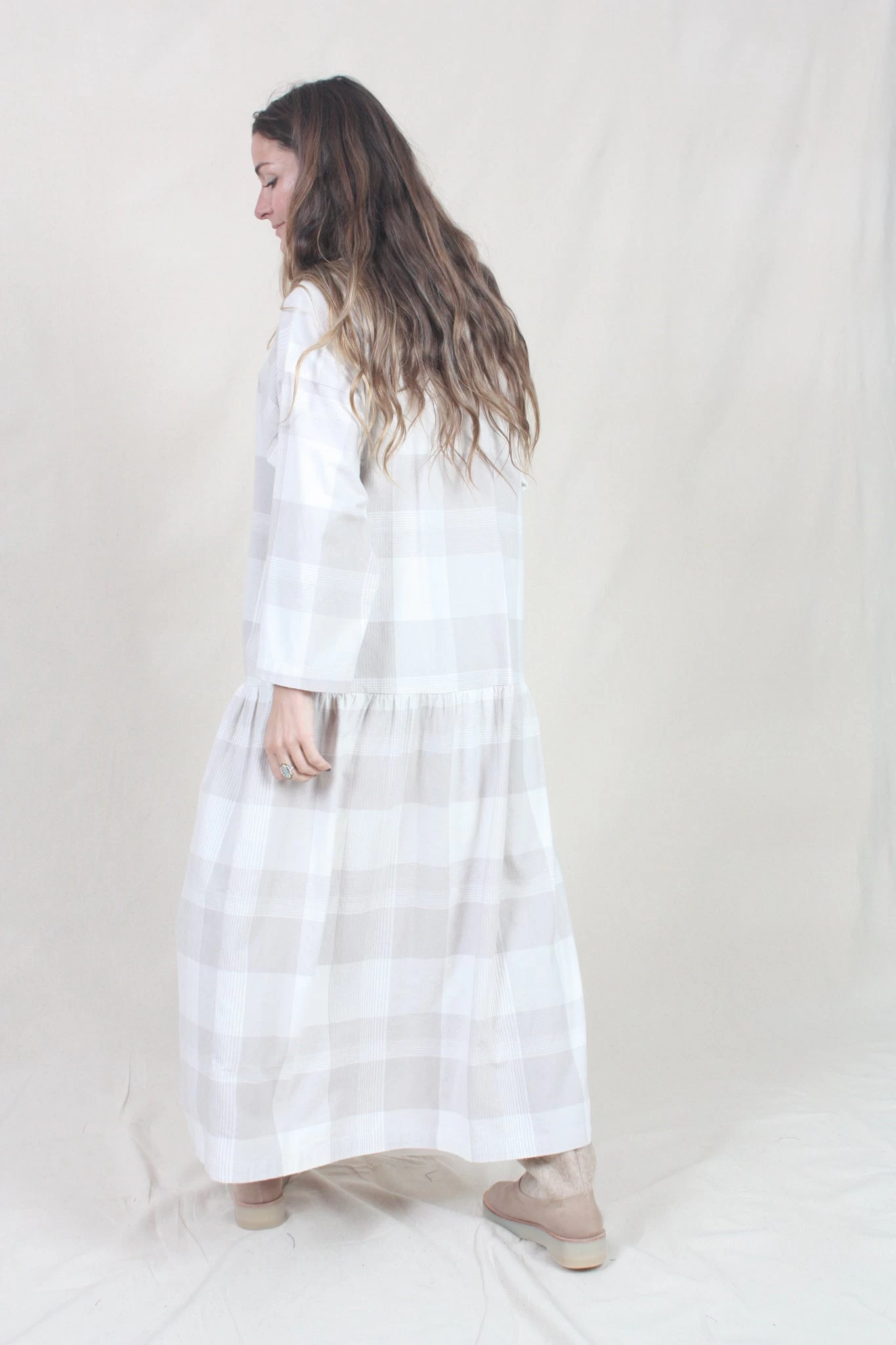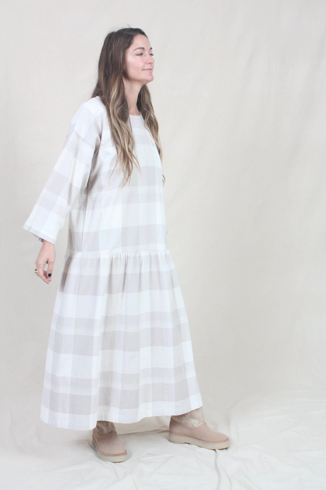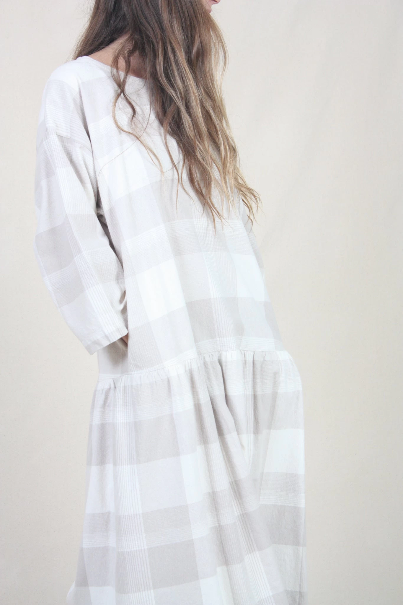 A relaxed dress with a wide crew neck, dropped shoulder and long sleeve in a soft brushed cotton flannel. Side seam pockets.