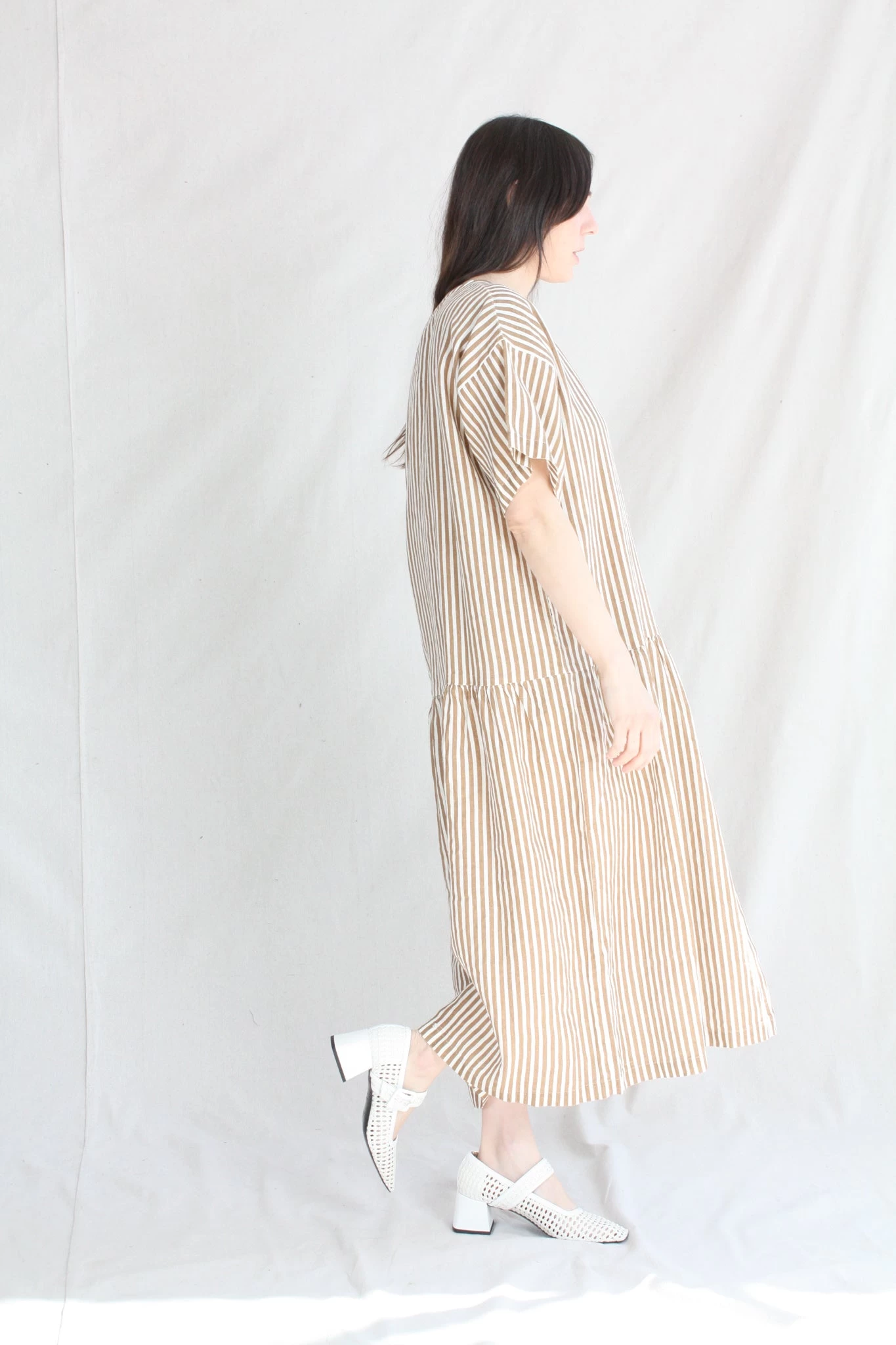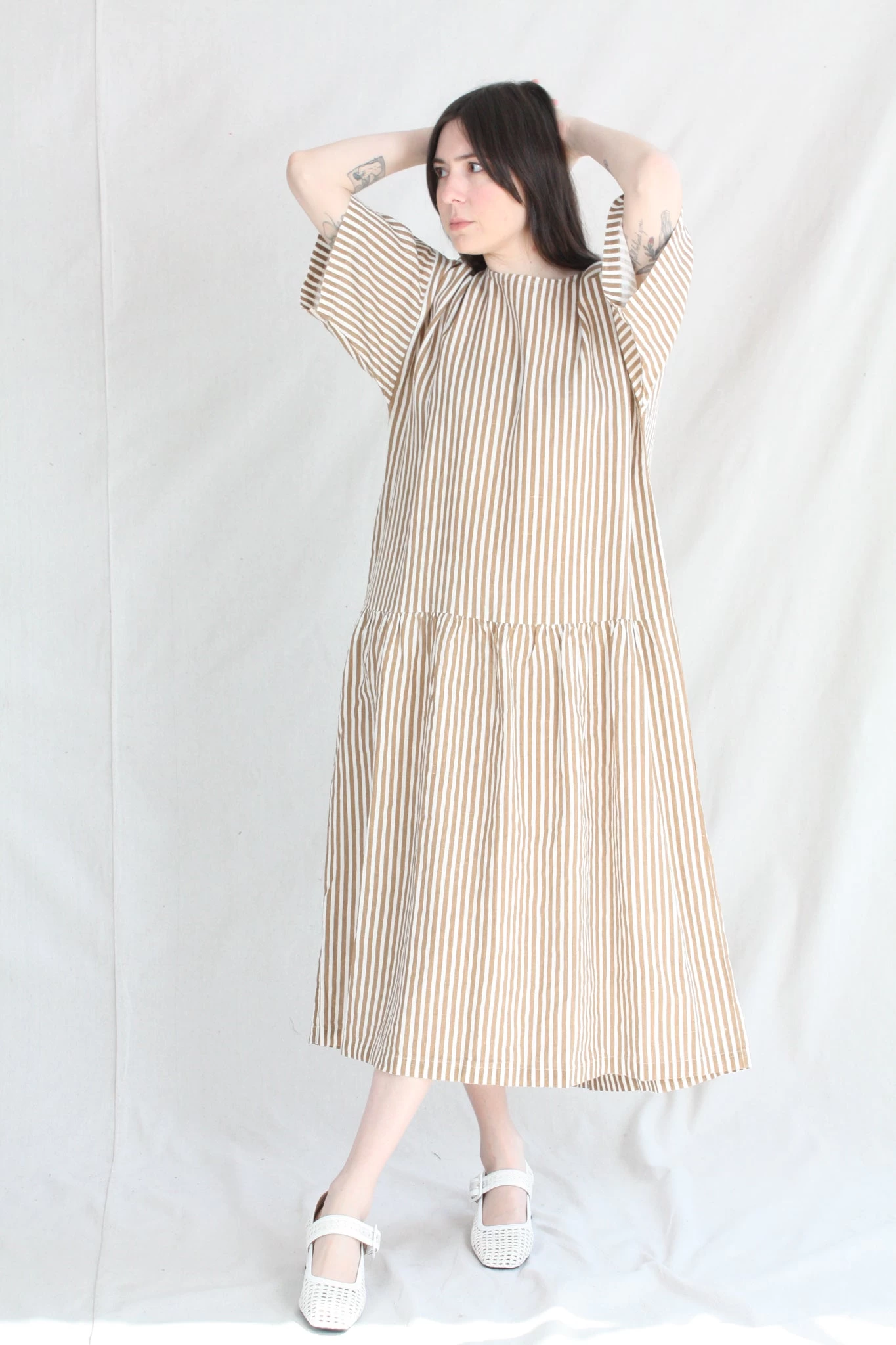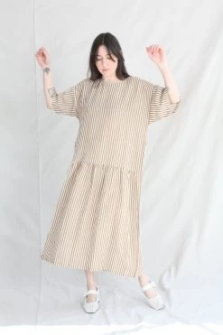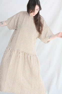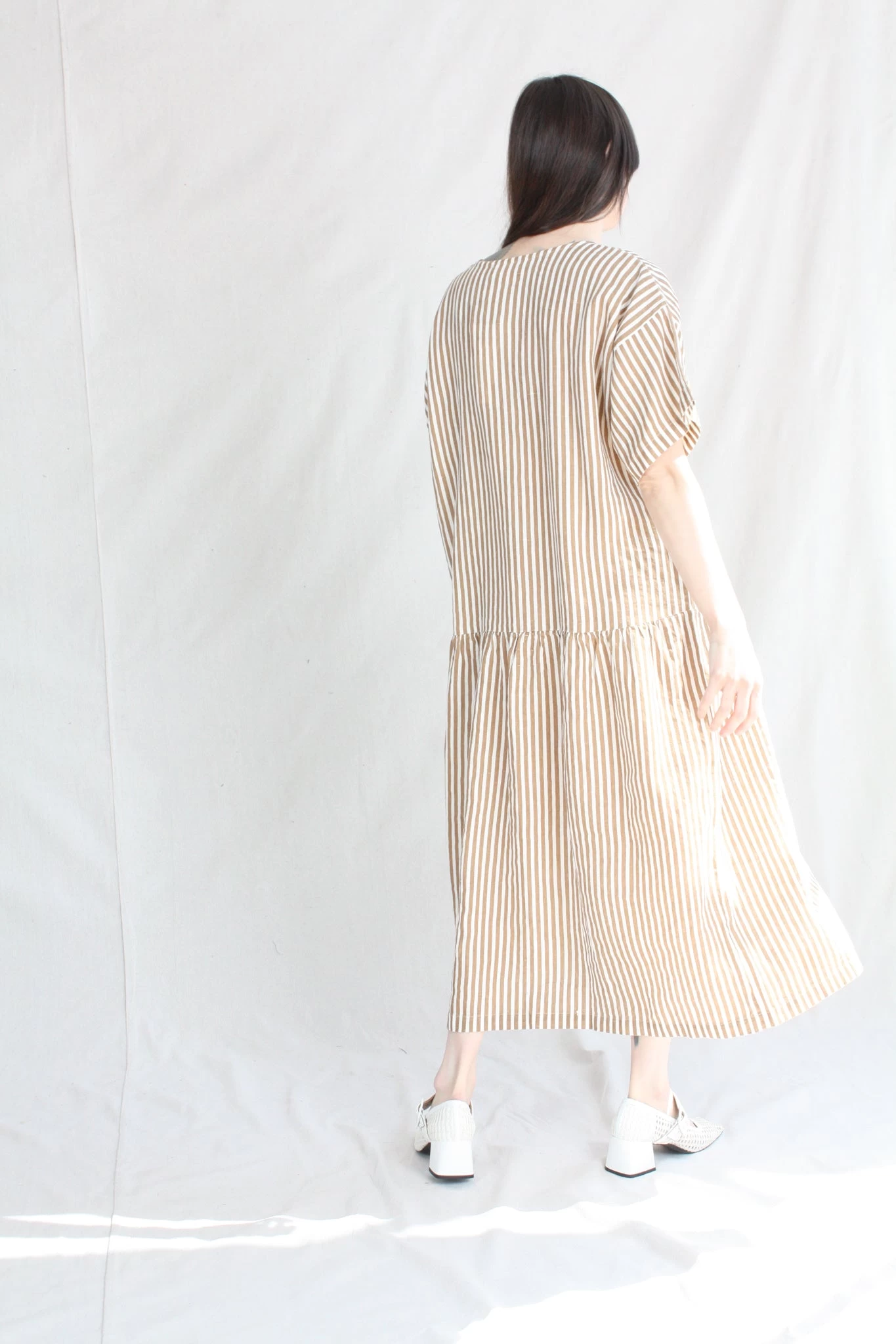 A relaxed, easy dress in stripe printed linen. Wide crew neck and dropped shoulder. Side seam pockets. The printed stripe is imperfect due to the linen.