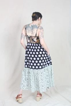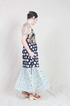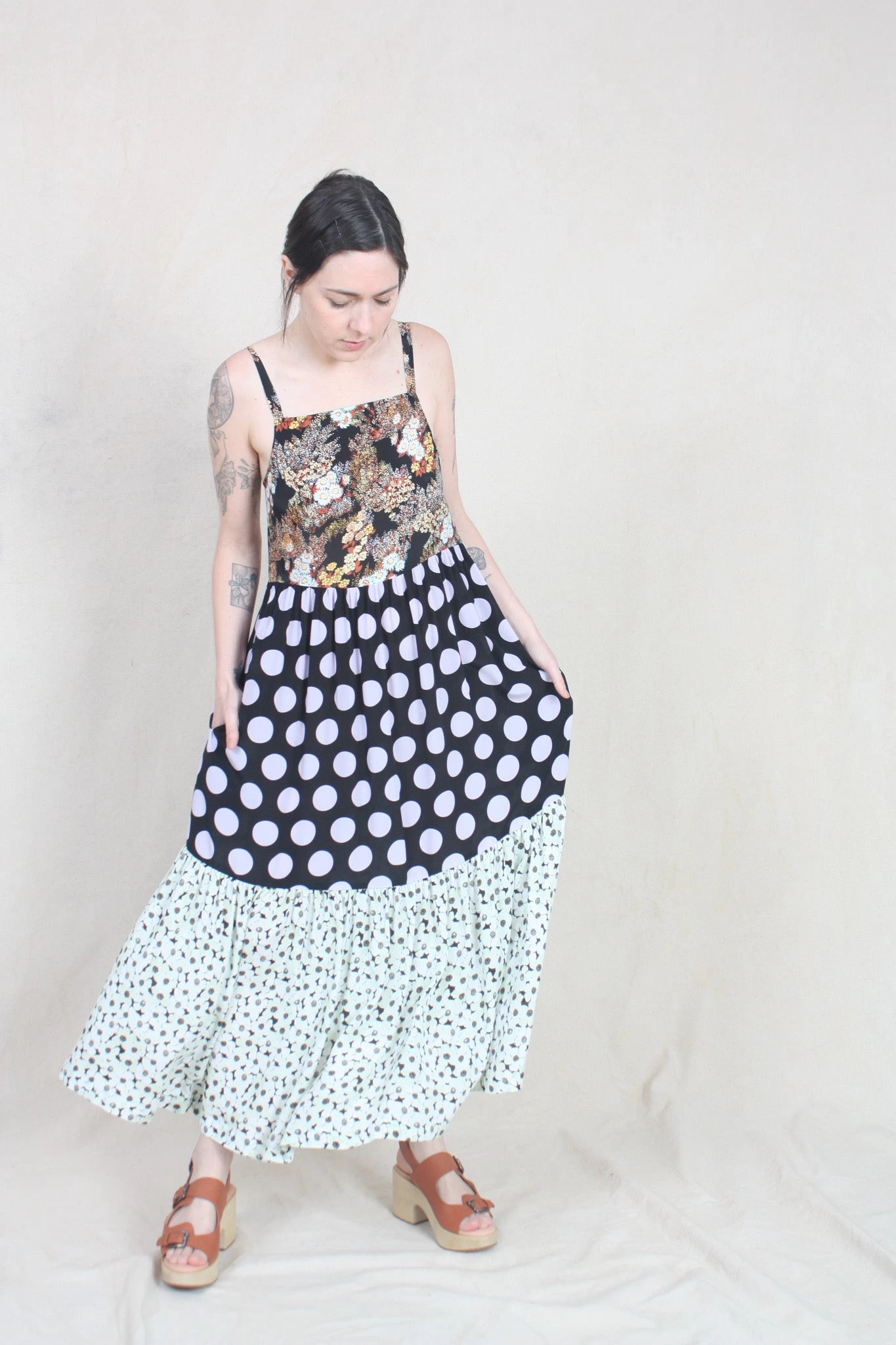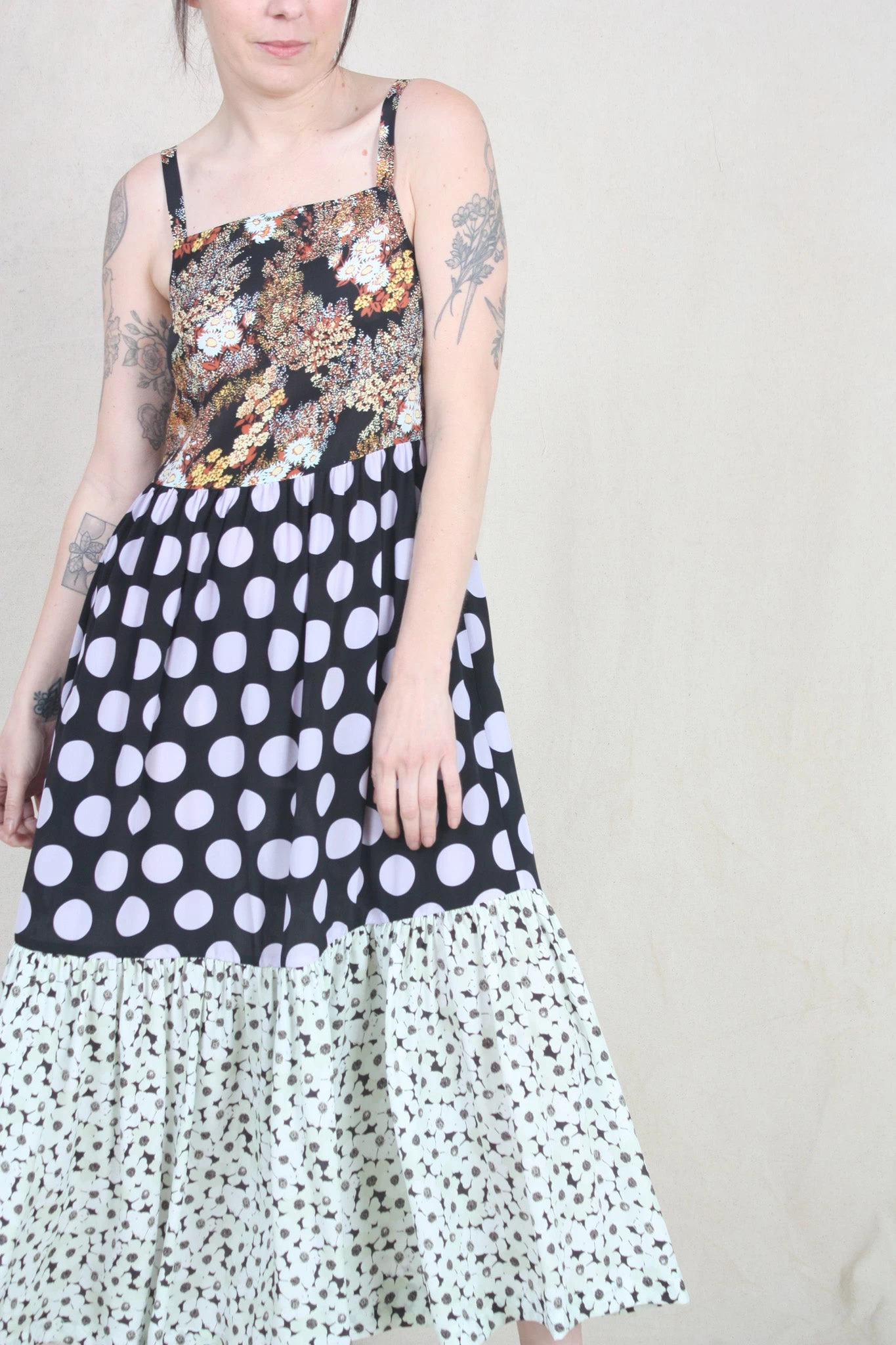 Tiered tank dress with contrasting floral and polka dot patterned panels. Relaxed a-line fit. Side pockets. Soft silk blend. Looks great styled over pants or a turtleneck in cooler months.