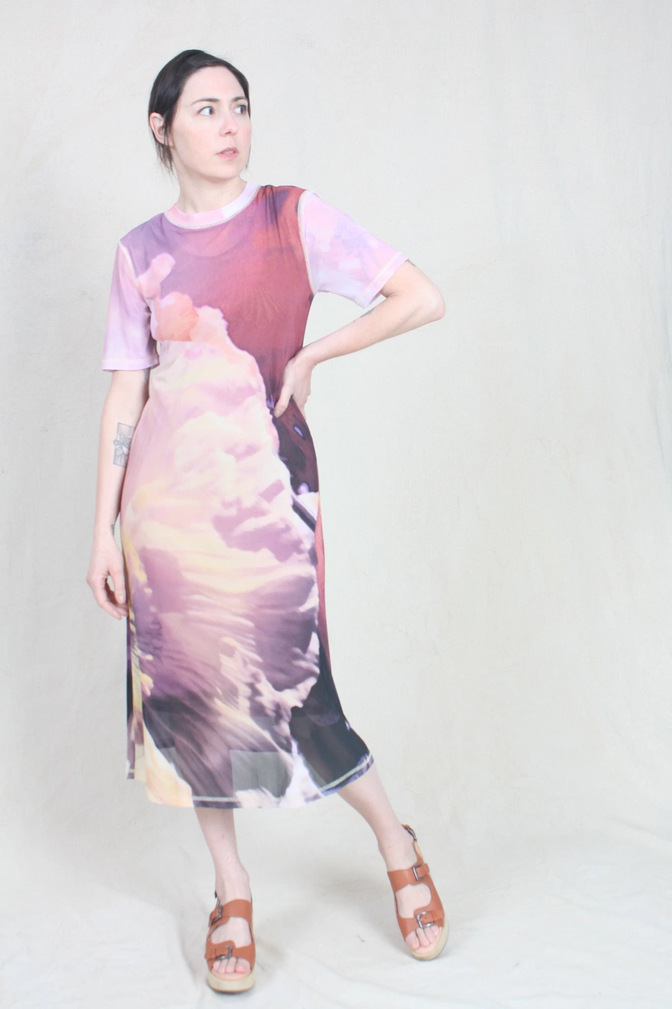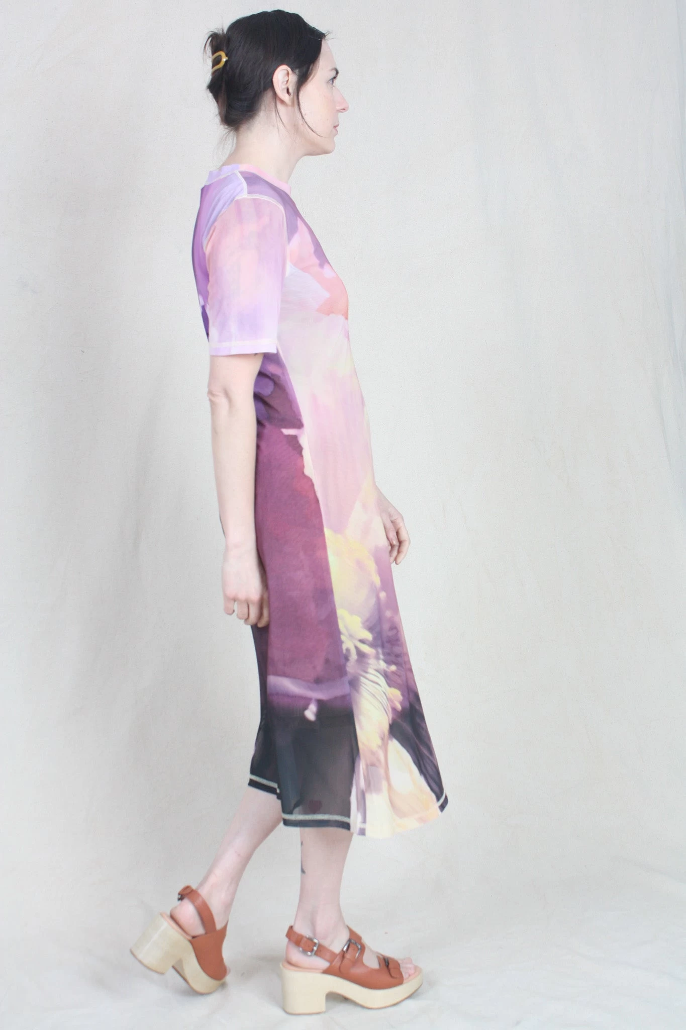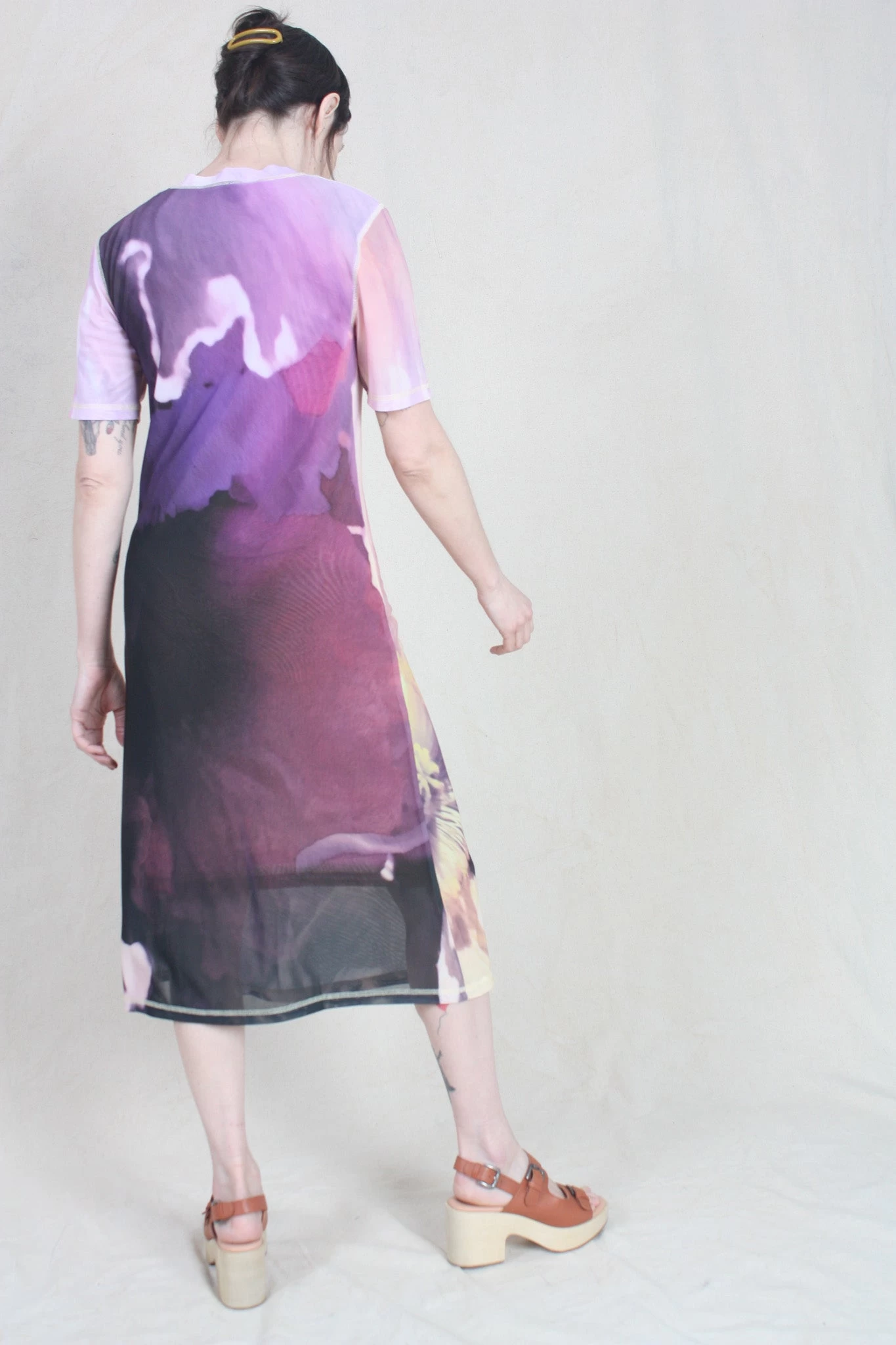Layered midi dress in stretchy abstract floral printed mesh. Short sleeves. Relaxed, slightly oversized fit. Easy to style. Looks great with boots. Lined.