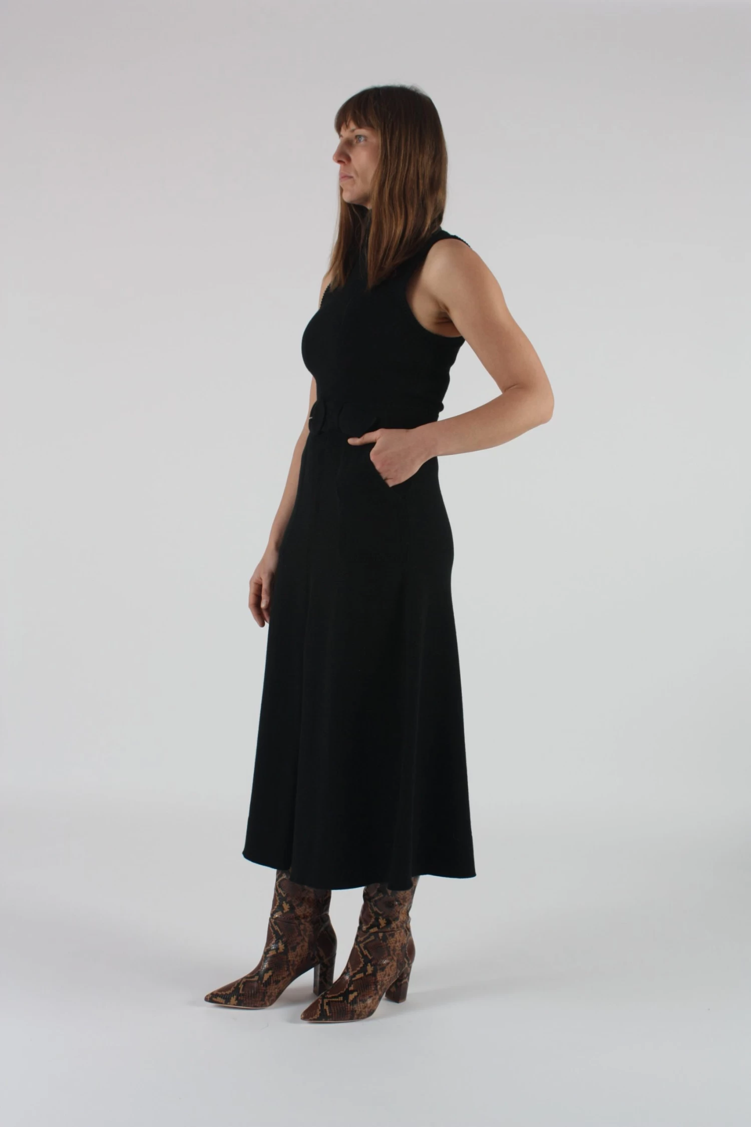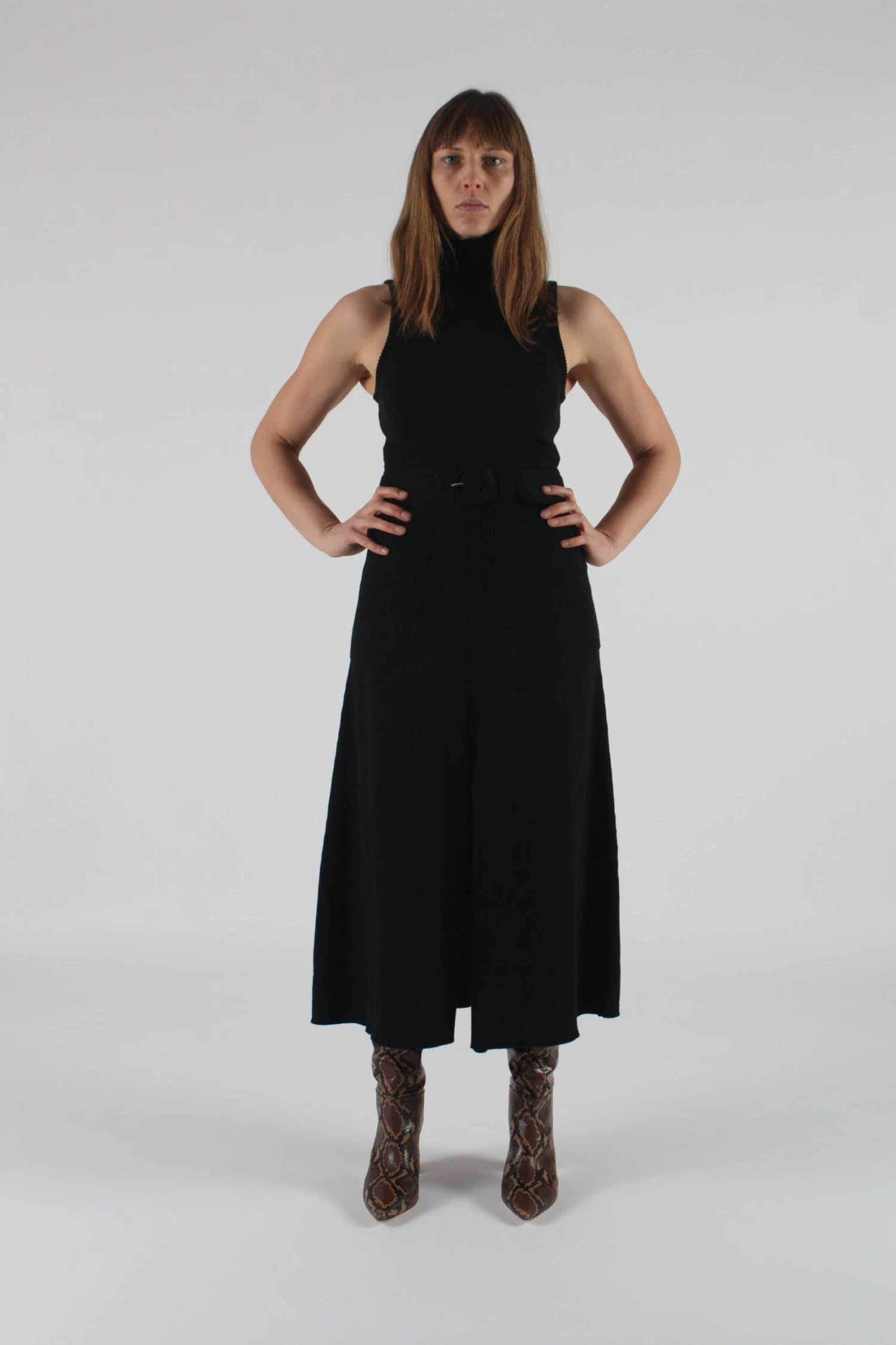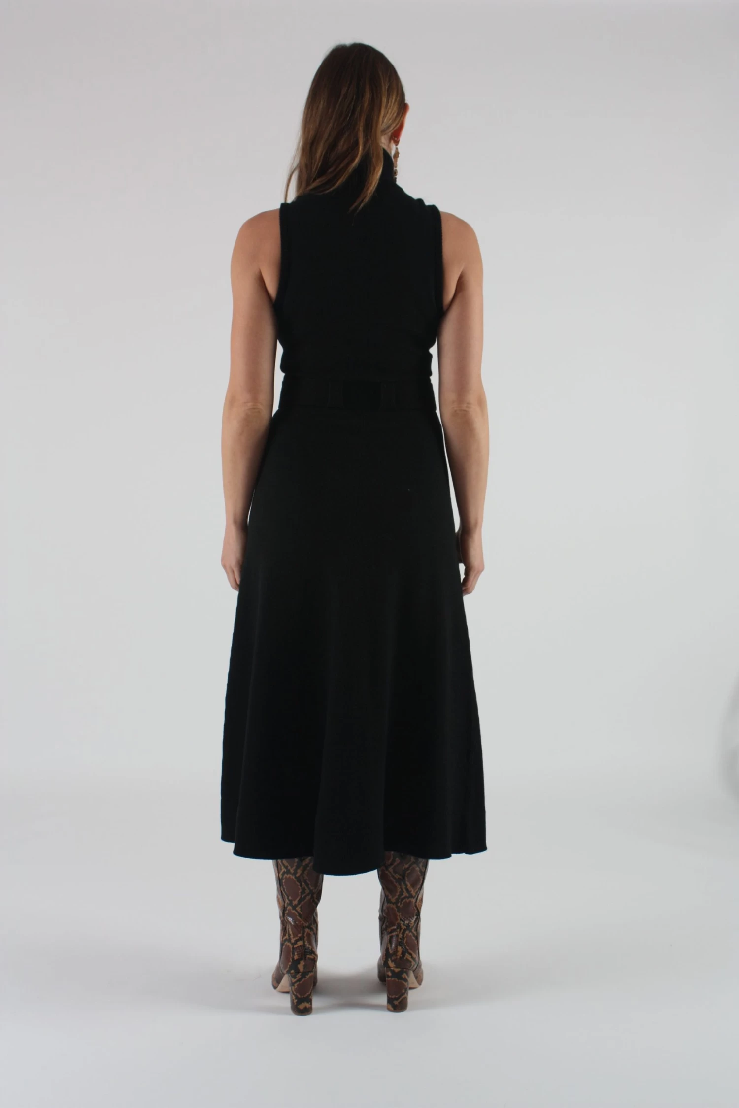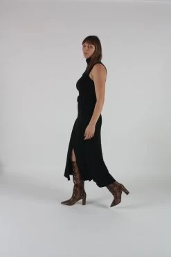 The Elle turtleneck sweater dress in black. Side patch pockets. Thigh high slit at front. Comes with removable knit belt.Â