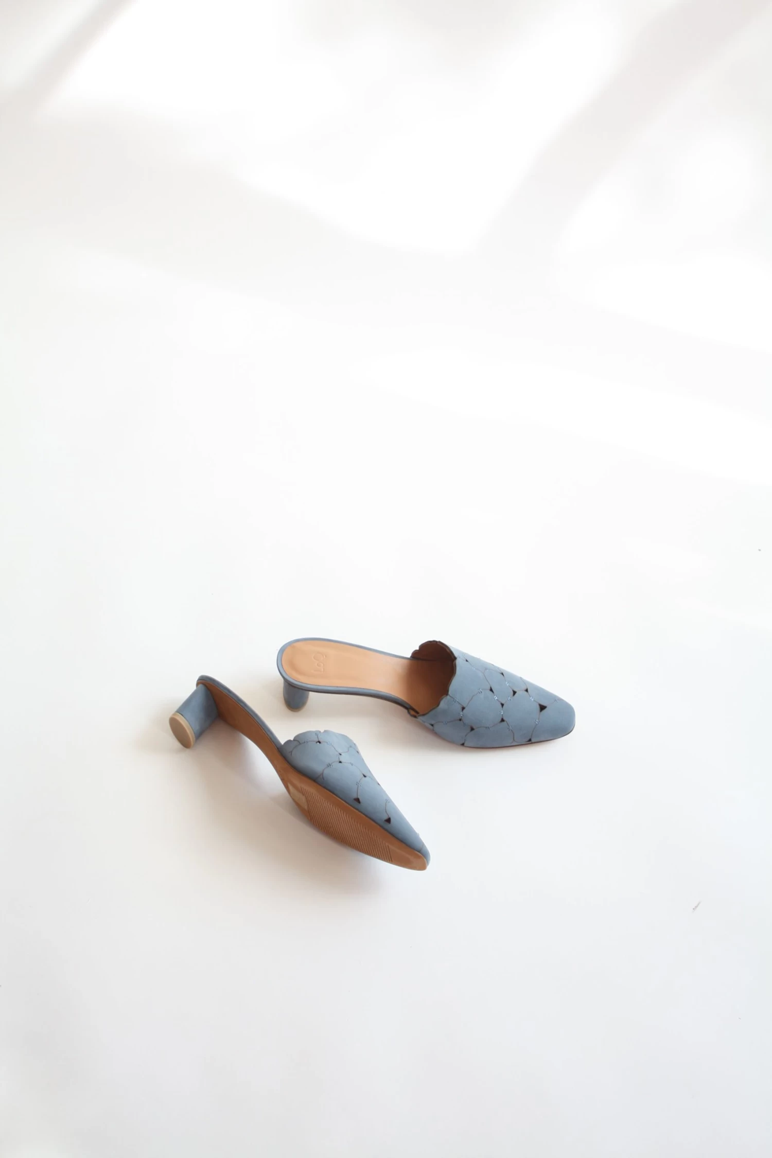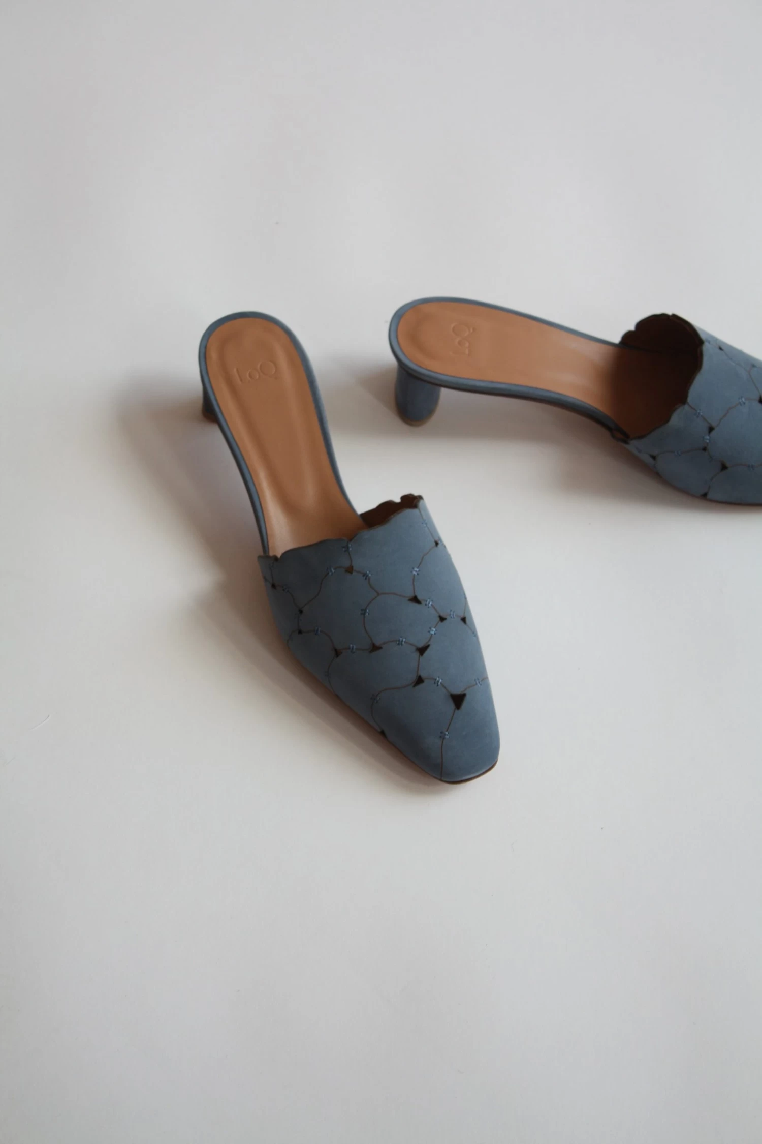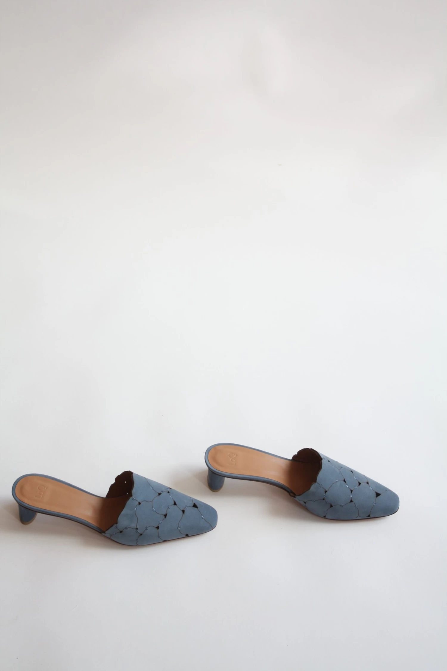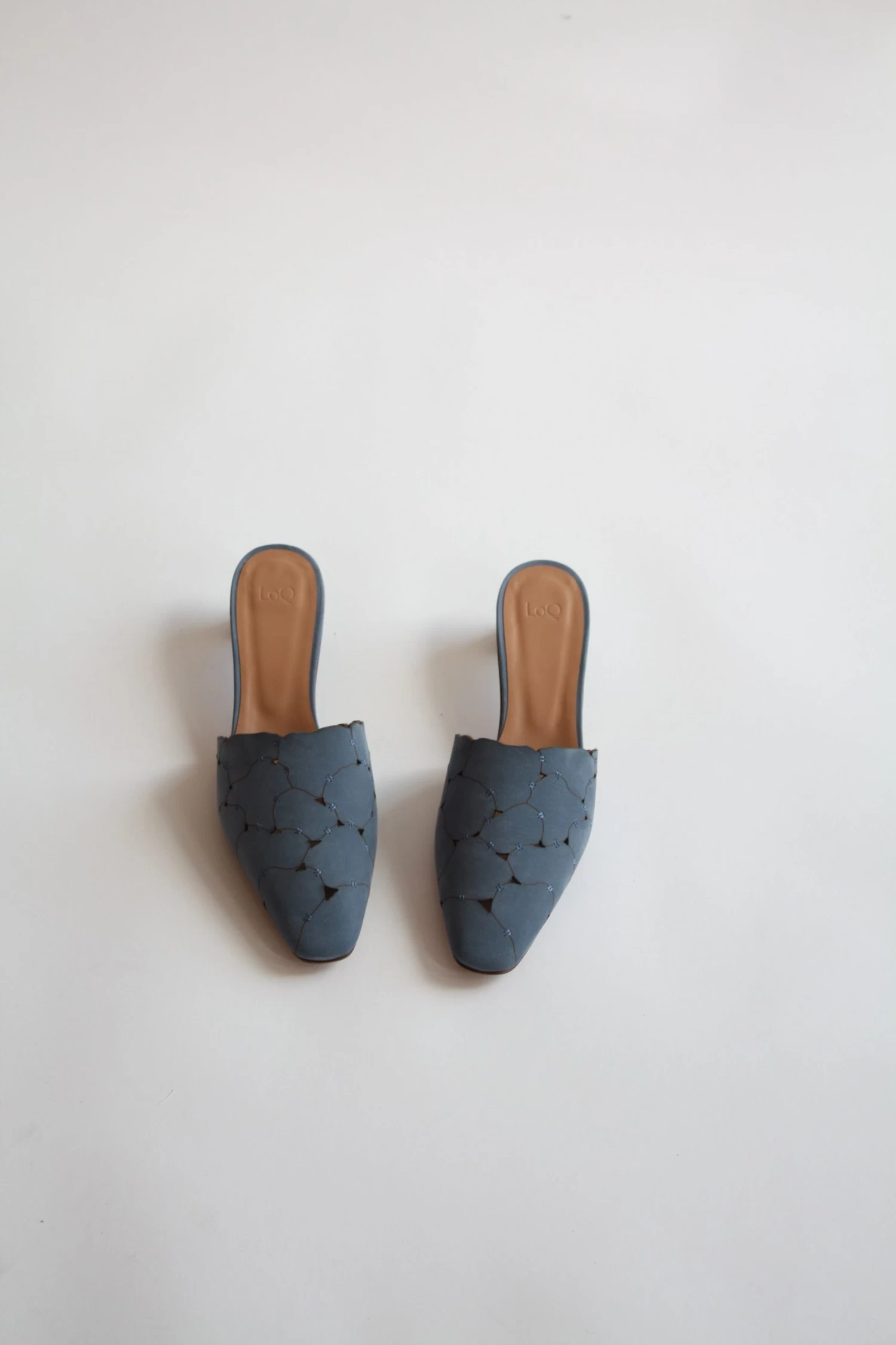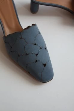The Emilia is an almond toe mule featuring a patchwork upper of organic shapes in denim blue kid suede.