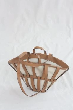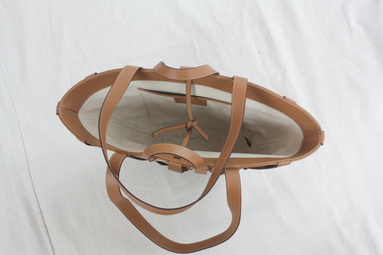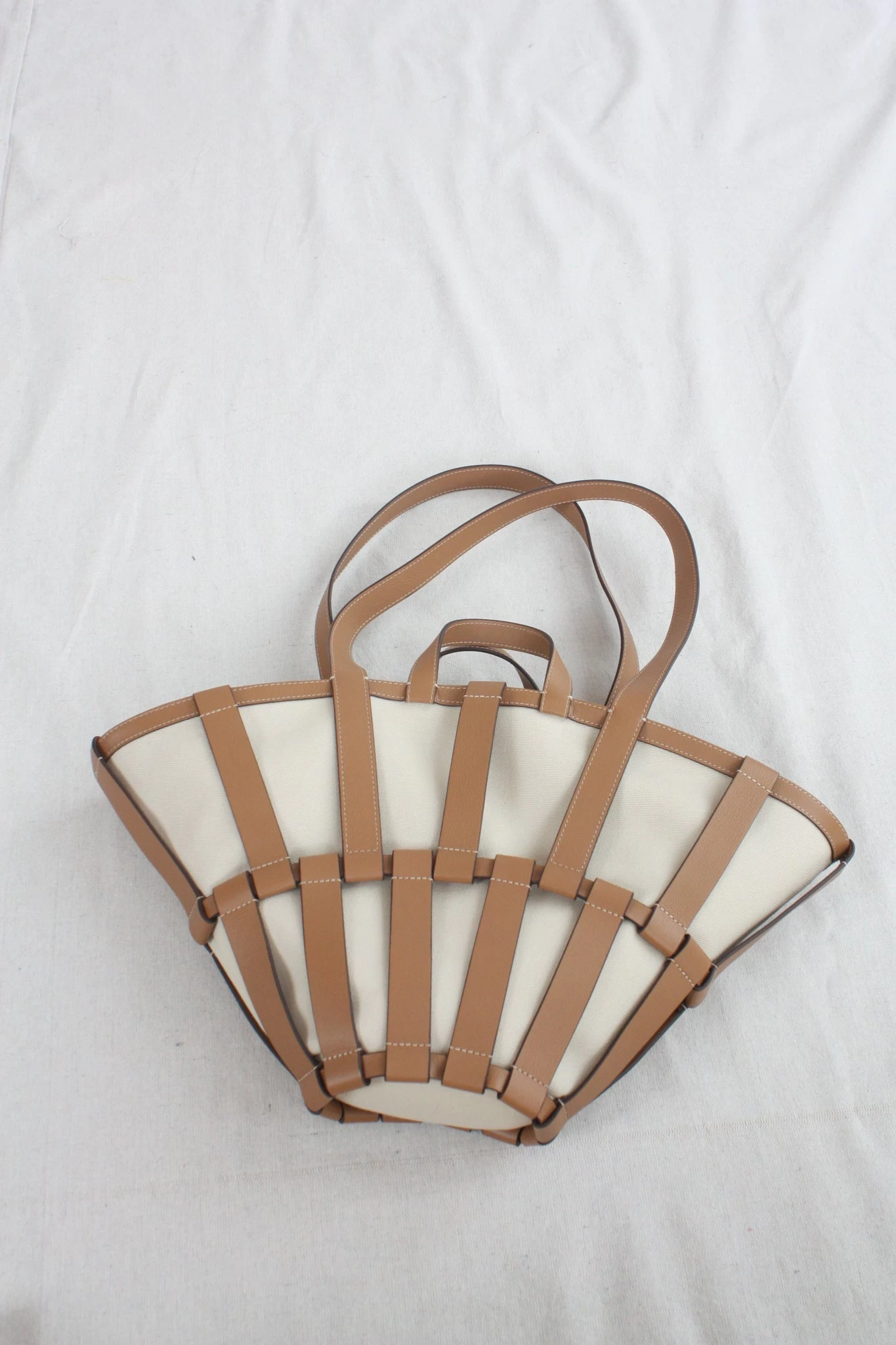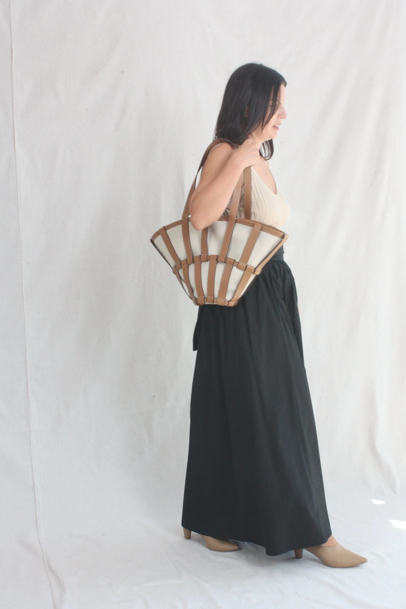 Encant is a medium tote crafted in organic cotton canvas paneled with a smooth calf leather frame, and lined with organic cotton canvas. Interior pocket and tie closure.