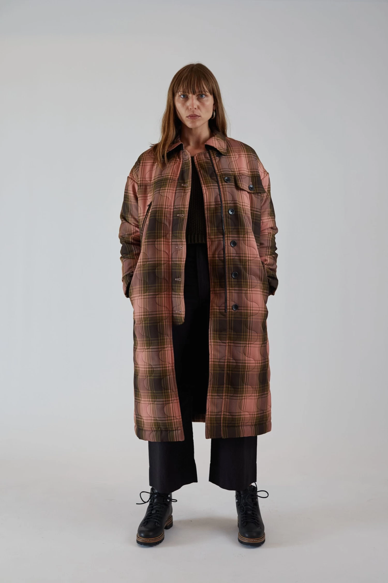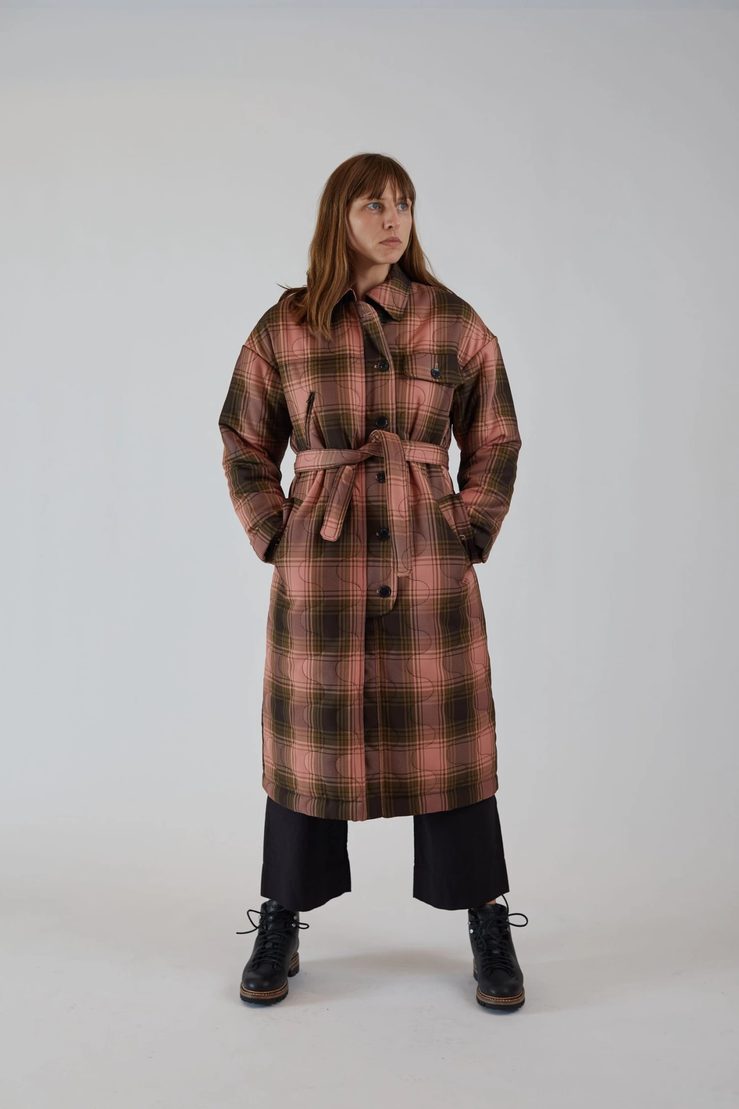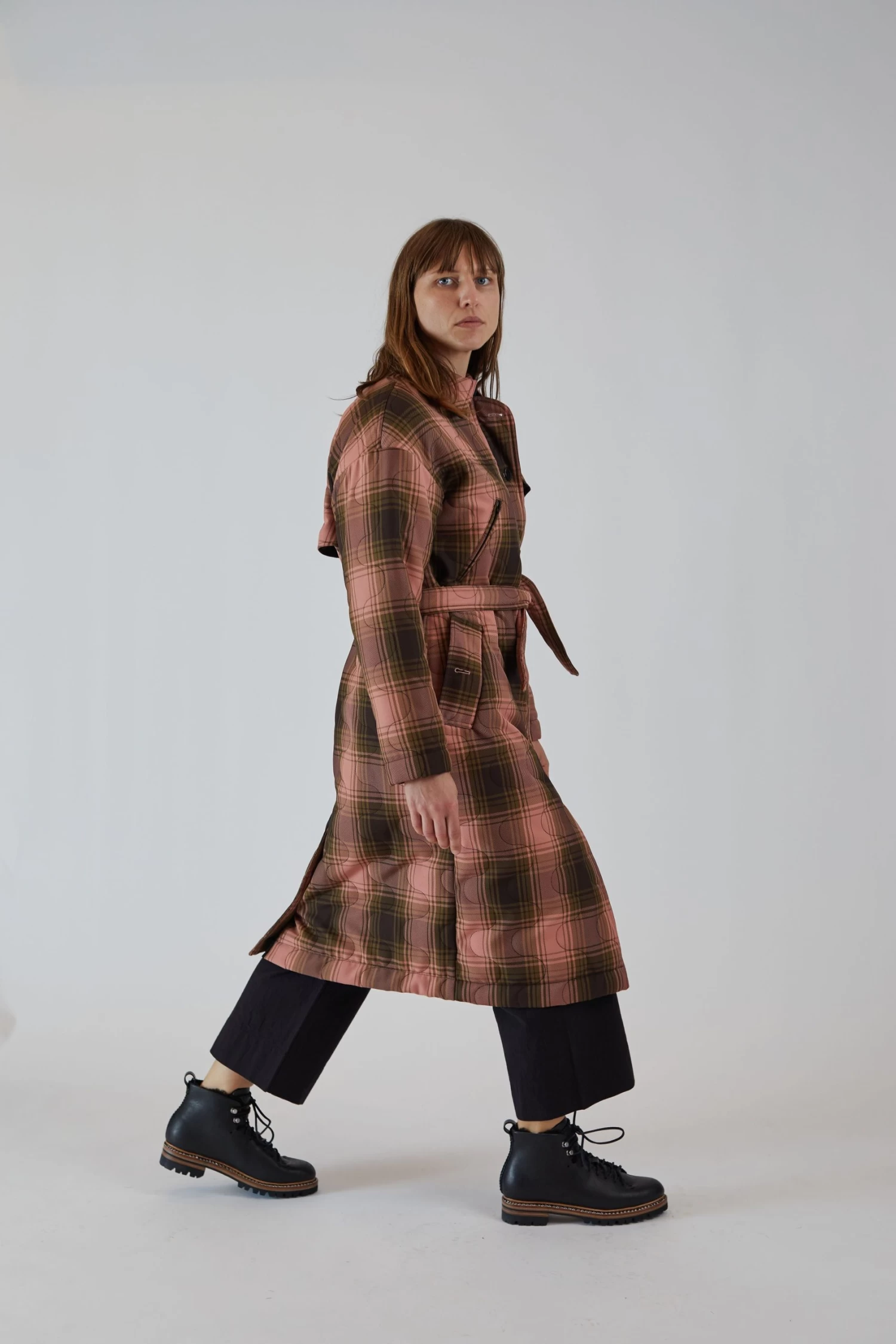 Long, straight cut quilted winter coat in a Bottiglia Check fabric and Squiggle Quilt motif. The Squiggle Quilt stitch is Rachel Comey’s take on the classic onion quilt. Bottiglia Check is a collaboration between one of Rachel Comey’s Italian mills and a leading Asian upcycling group. The fabric is woven from upcycled water bottles and has a smooth, dry finish. Welt pockets at the waist. Interior and exterior breast pocket. Waist tie, button placket, and interior zipper placket. Fully lined. Vented back body hem with button closure. Inset storm flap.