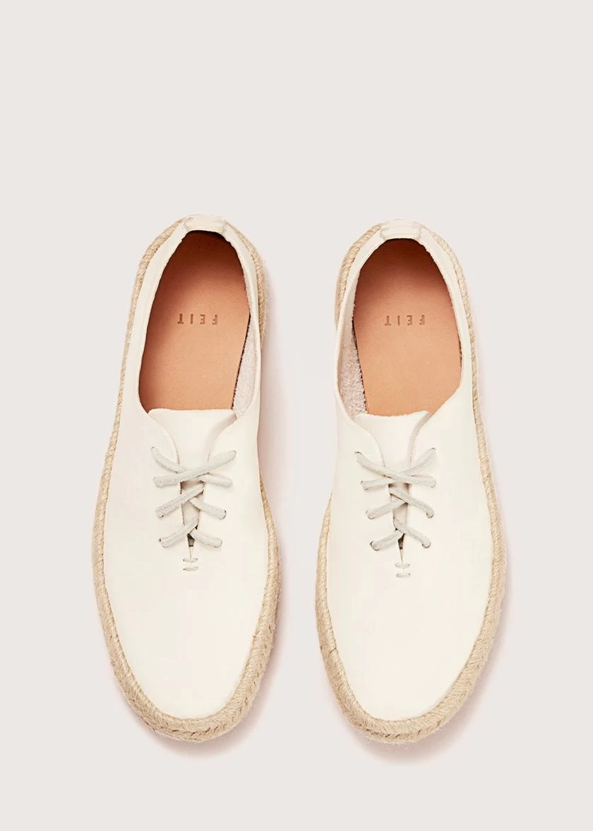 A minimal, plimsoll-style sneaker with natural jute fiber wrapping inspired by 13th century Spanish footwear. Each one-piece semi-cordovan upper is hand stitched at the welt for easy resoling. Soft, vegetable tanned leather insoles allow the wearer’s feet to breath; sturdy cork midsoles provide support and natural odor-resistance, and will mold to the shape of the wearer’s foot with time.