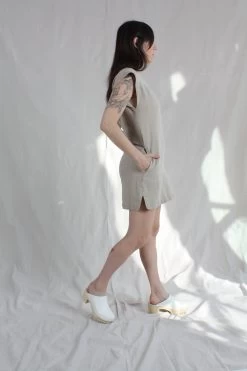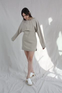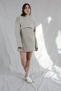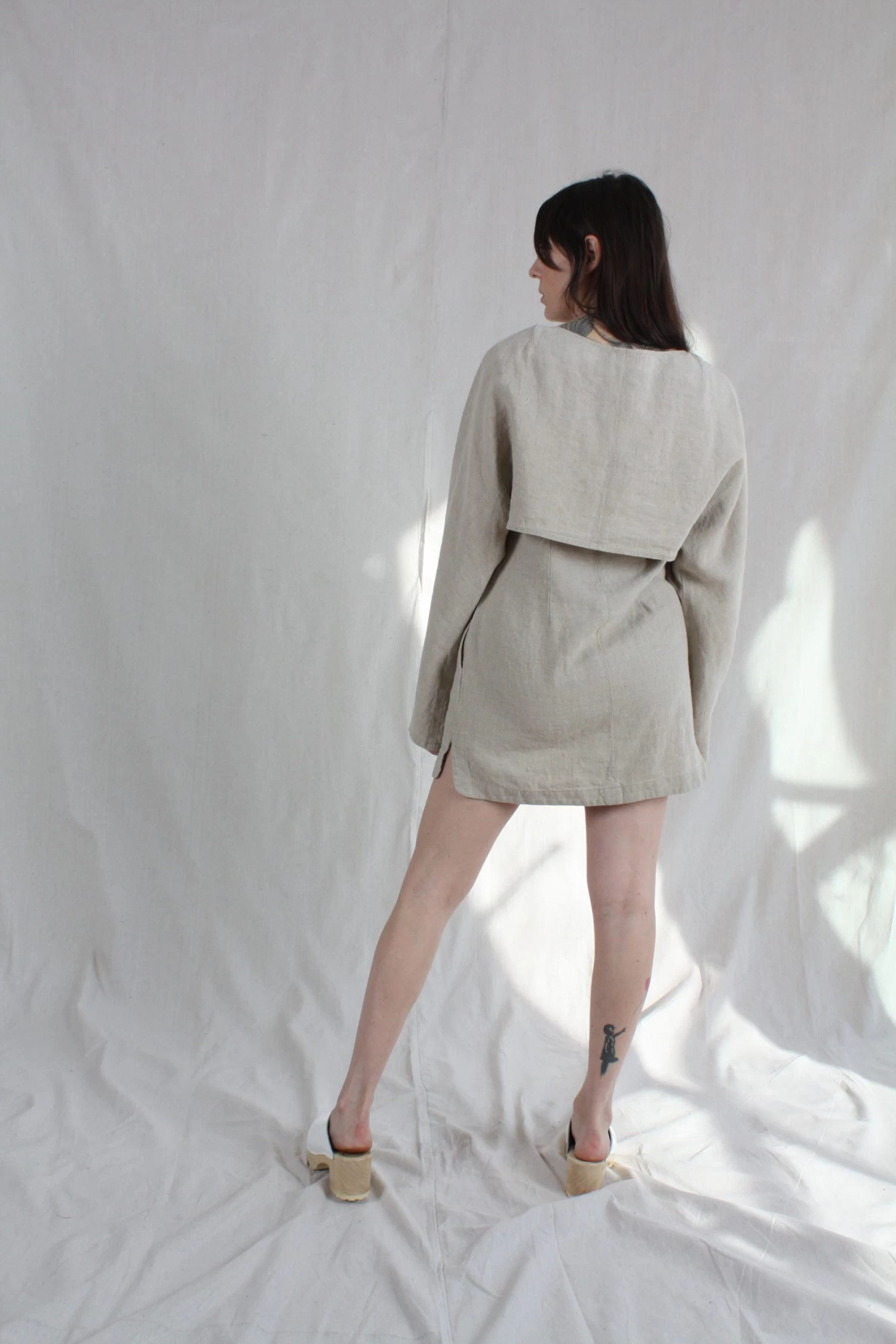 The Frankfurt Mini is made in a soft, enzyme washed heavy linen. This mini-dress silhouette features a boatneck, side pockets, and slits at the hem. Relaxed fit. Zipper closure at back.