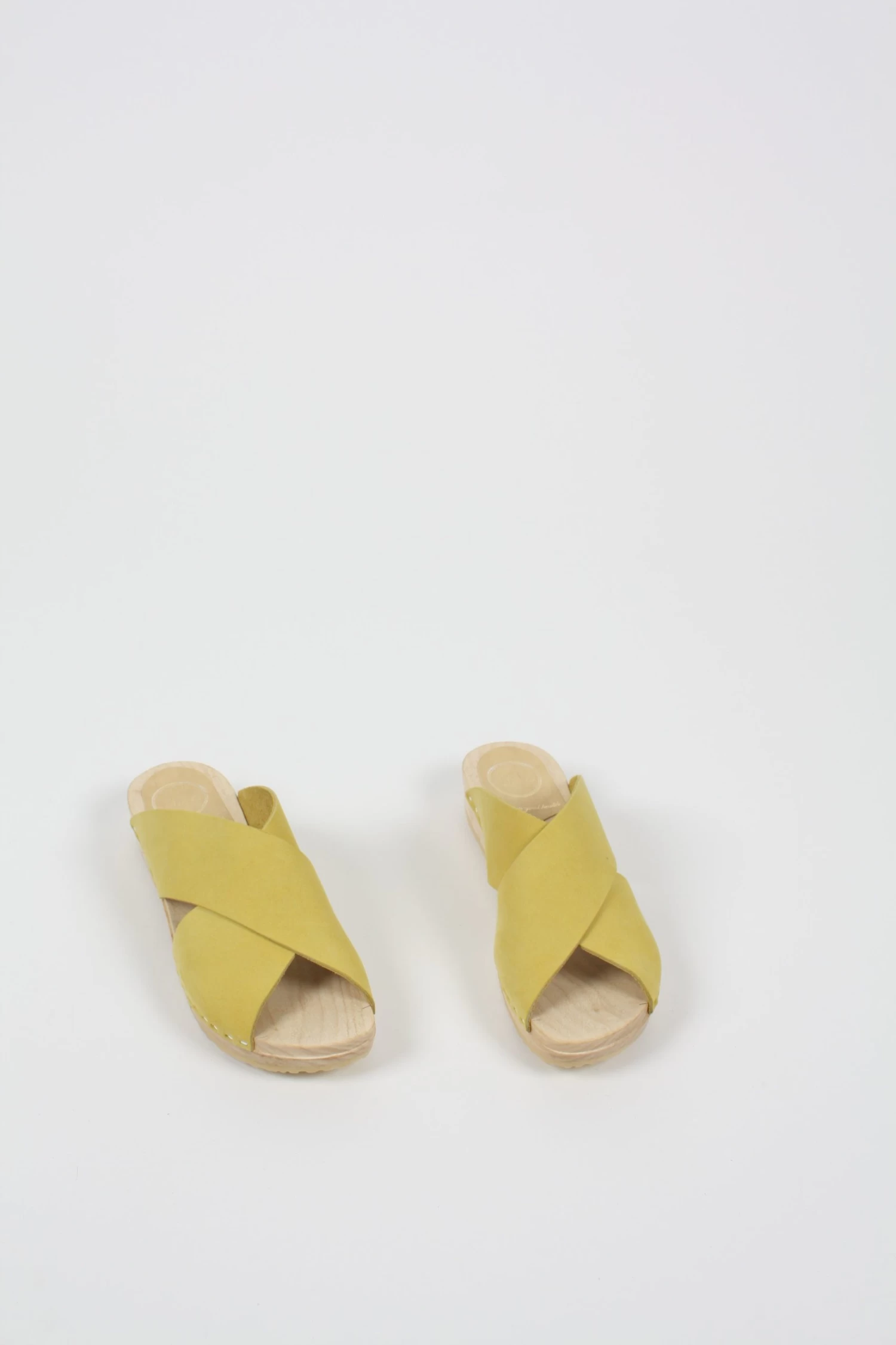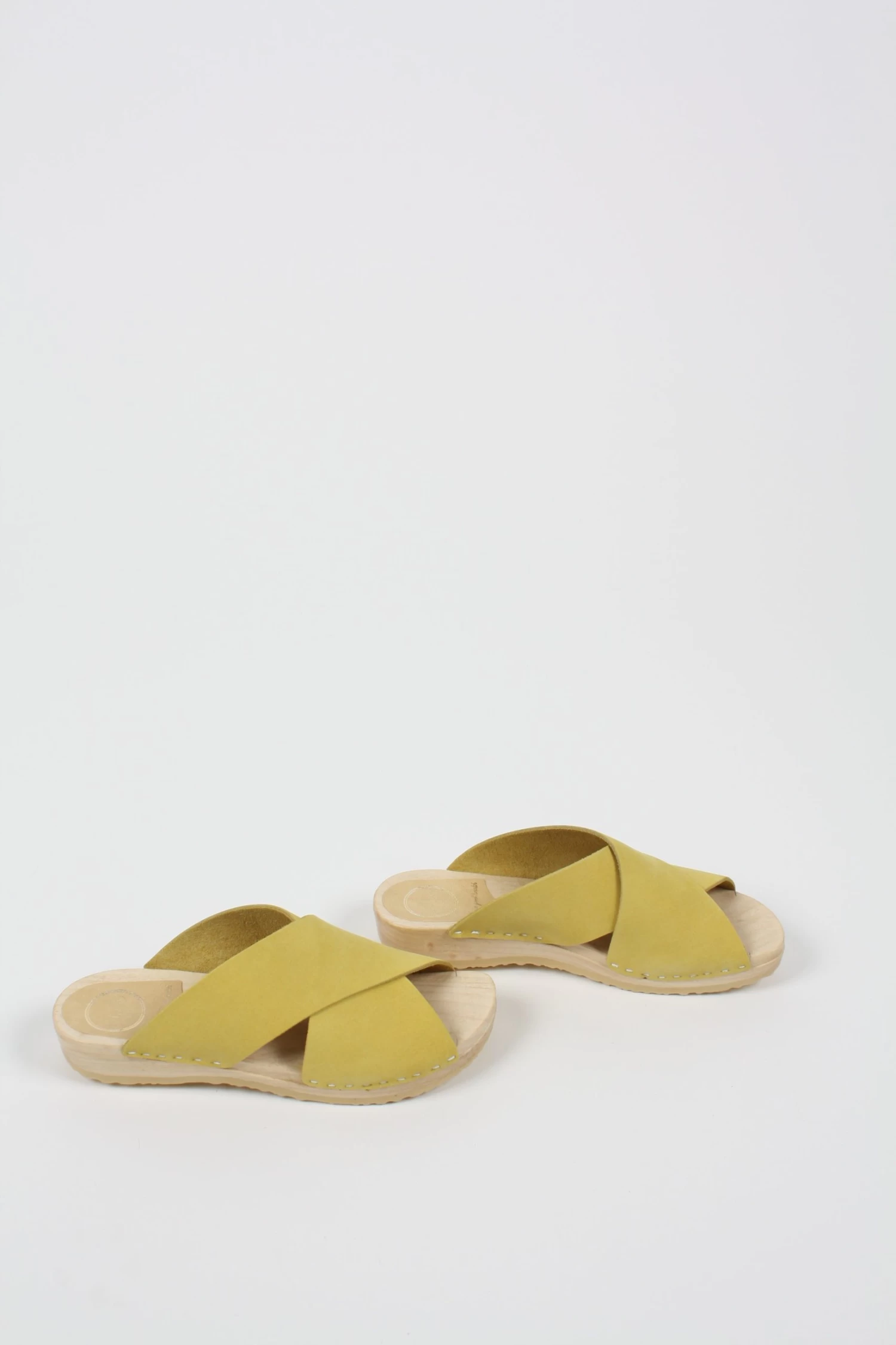 Clog sandal with criss crossed straps on clog sandal on unbendable flat base in a lemon soft leather. Lacquered, lightweight wood base. Unlined.
