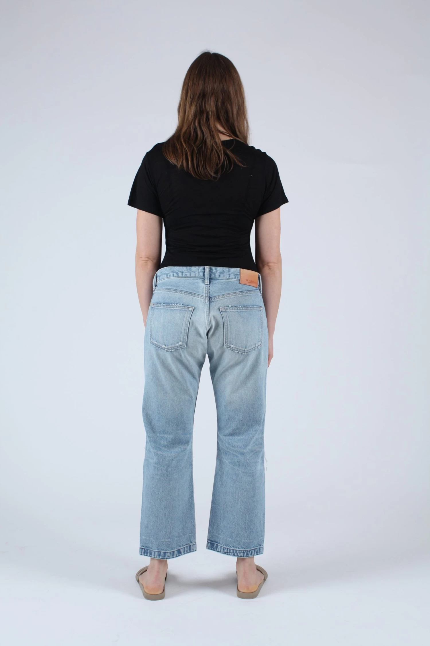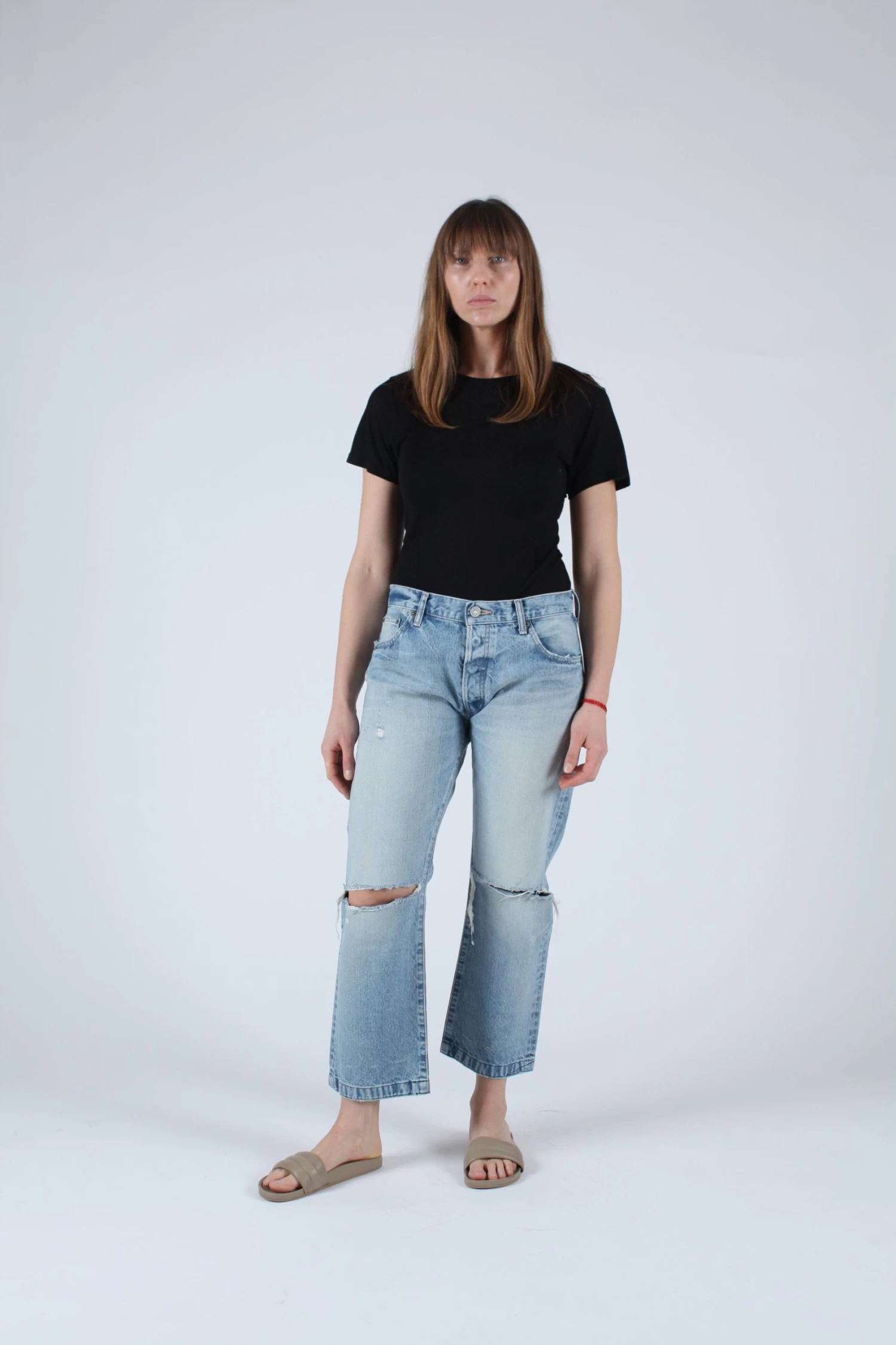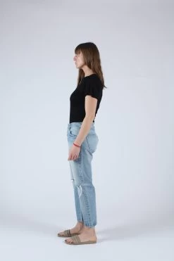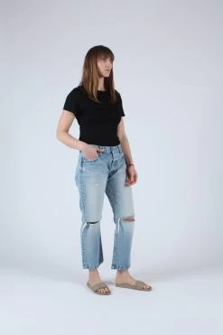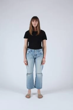 Mid rise cropped straight leg in light wash. Â Button fly and knee slashes.