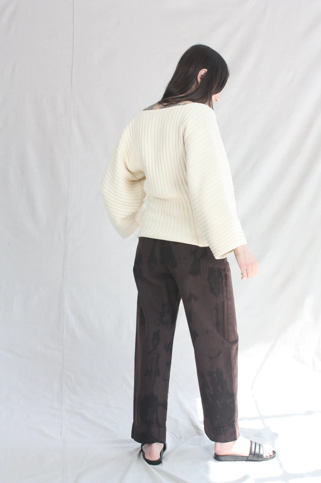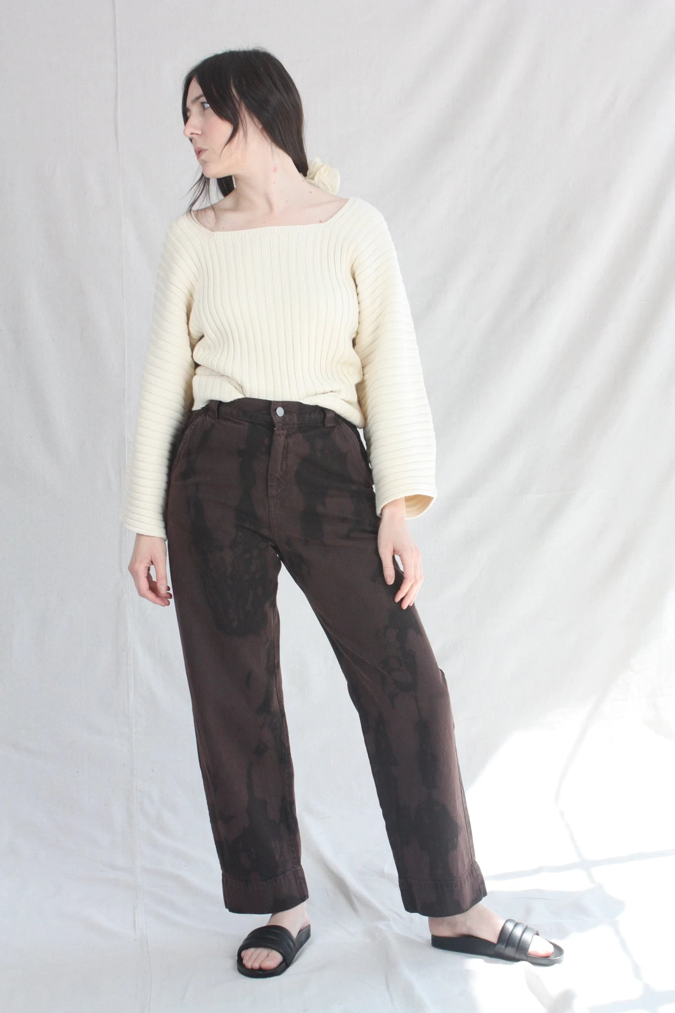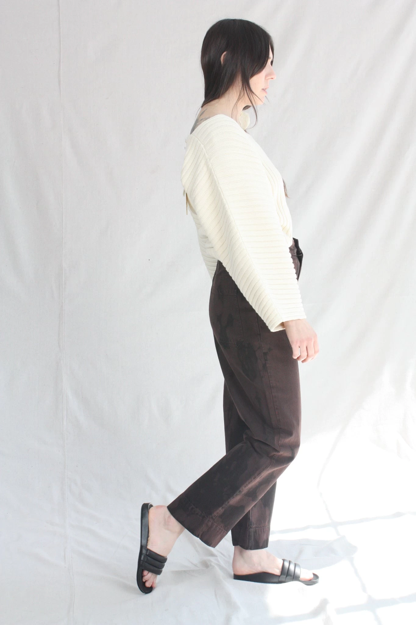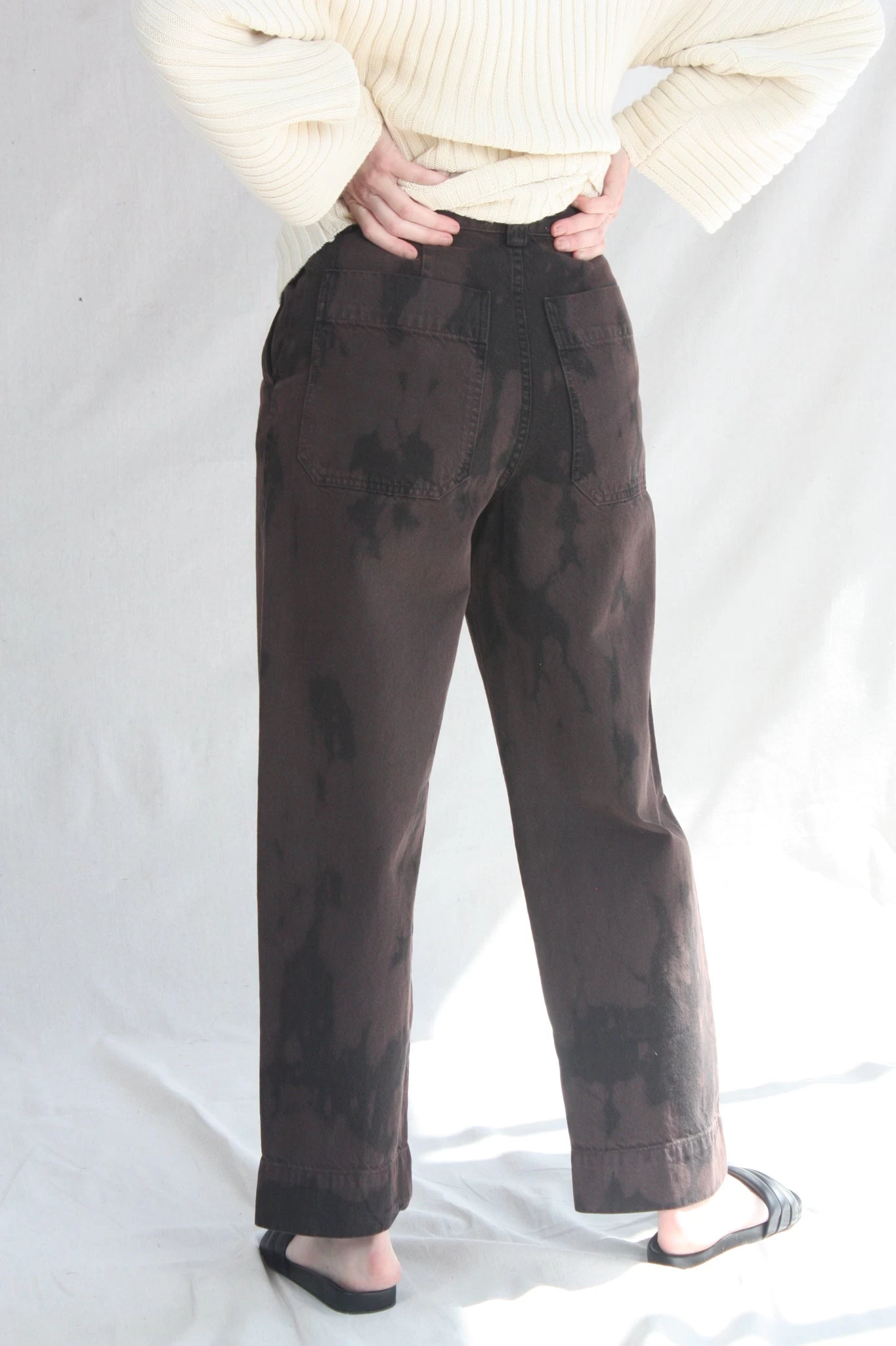 Gia is a mid-rise, straight-leg pant made from organic cotton denim. Designed to sit at the mid to high waist, with a slightly wide leg cropped at the ankle. Features belt loops, side pockets, oversized back patch pockets, front zipper and exposed.