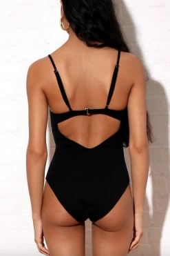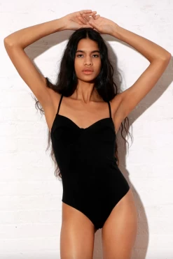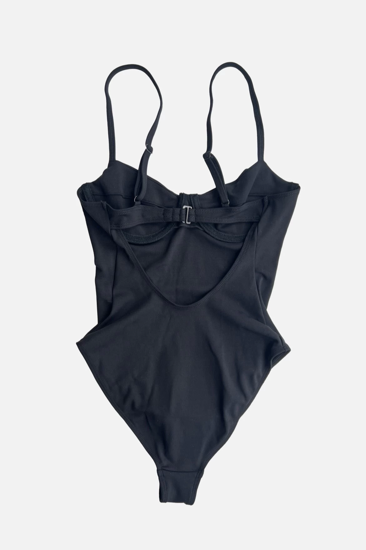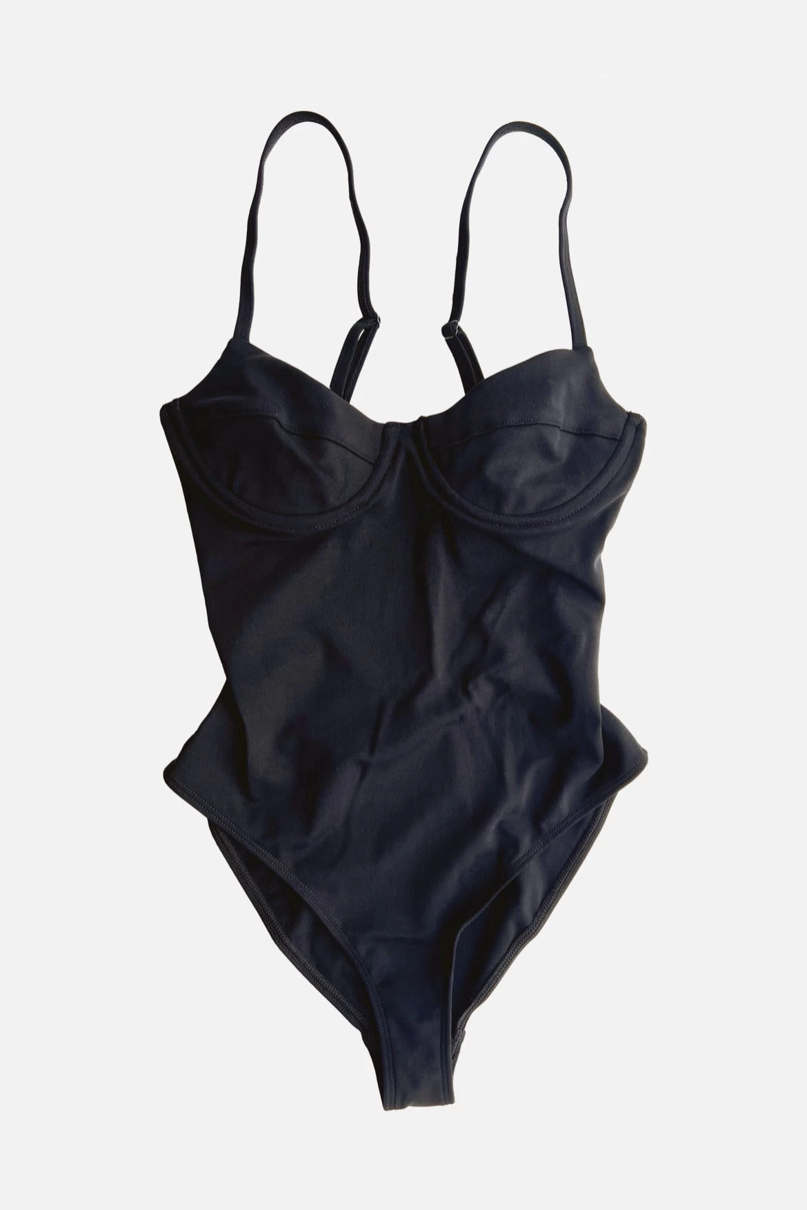 Gigi is a one-piece bathing suit with a mid-leg cut. Featuring an underwire cup, back cutout with hook-and-eye closure and adjustable straight back spaghetti straps.