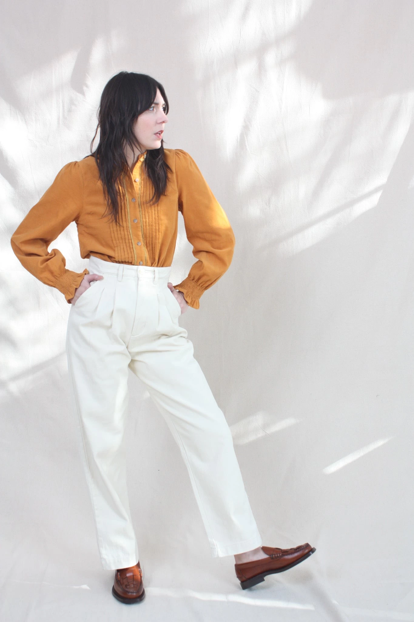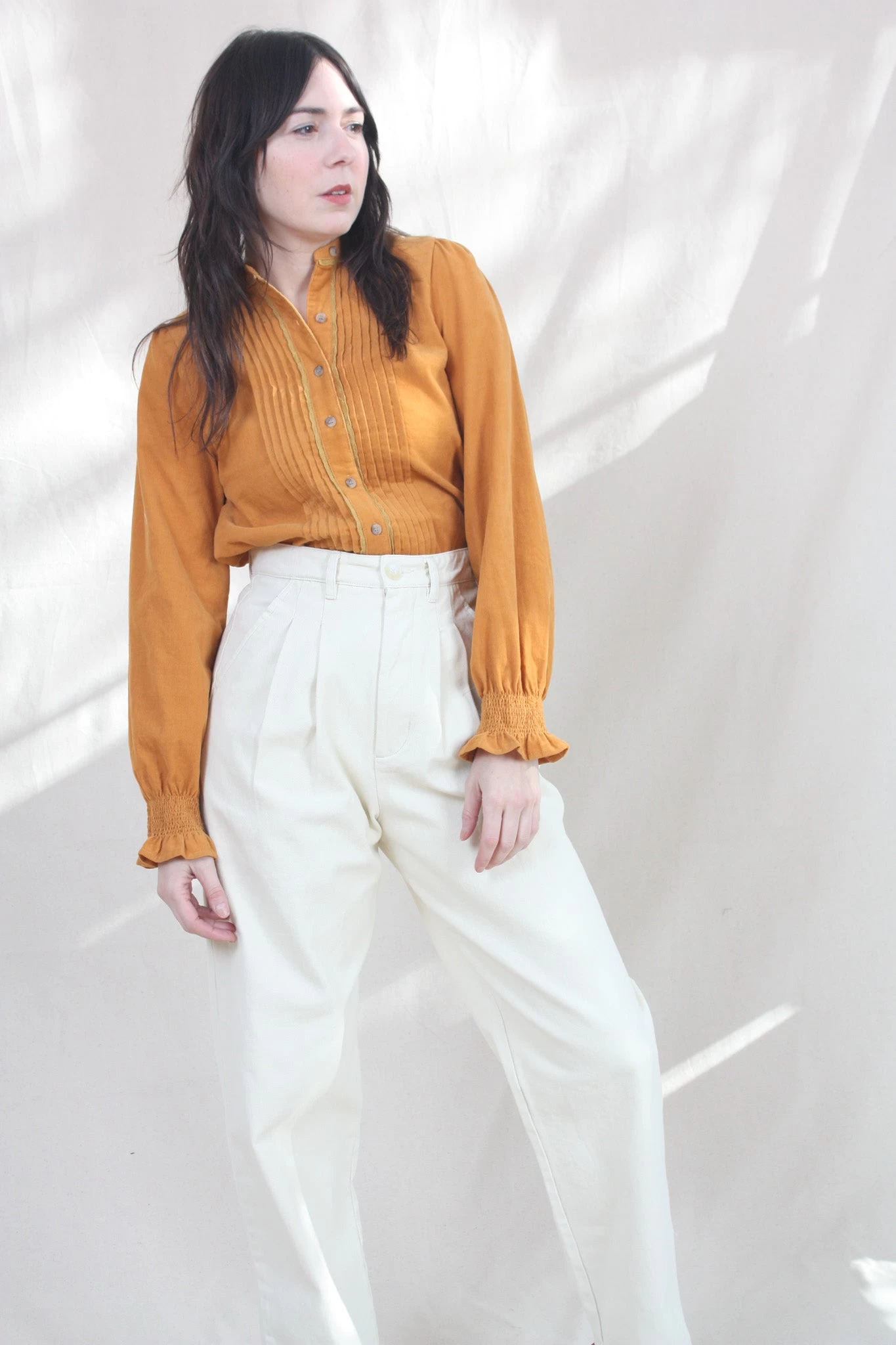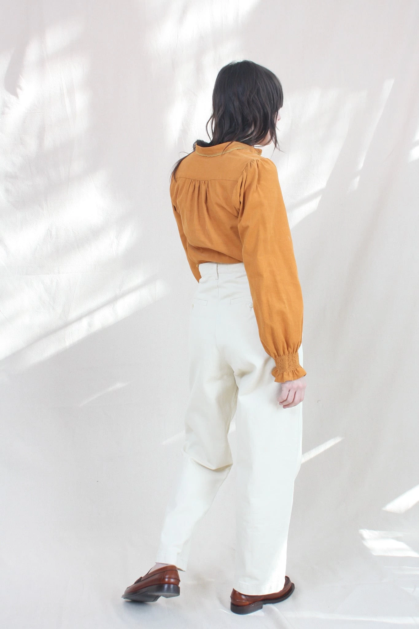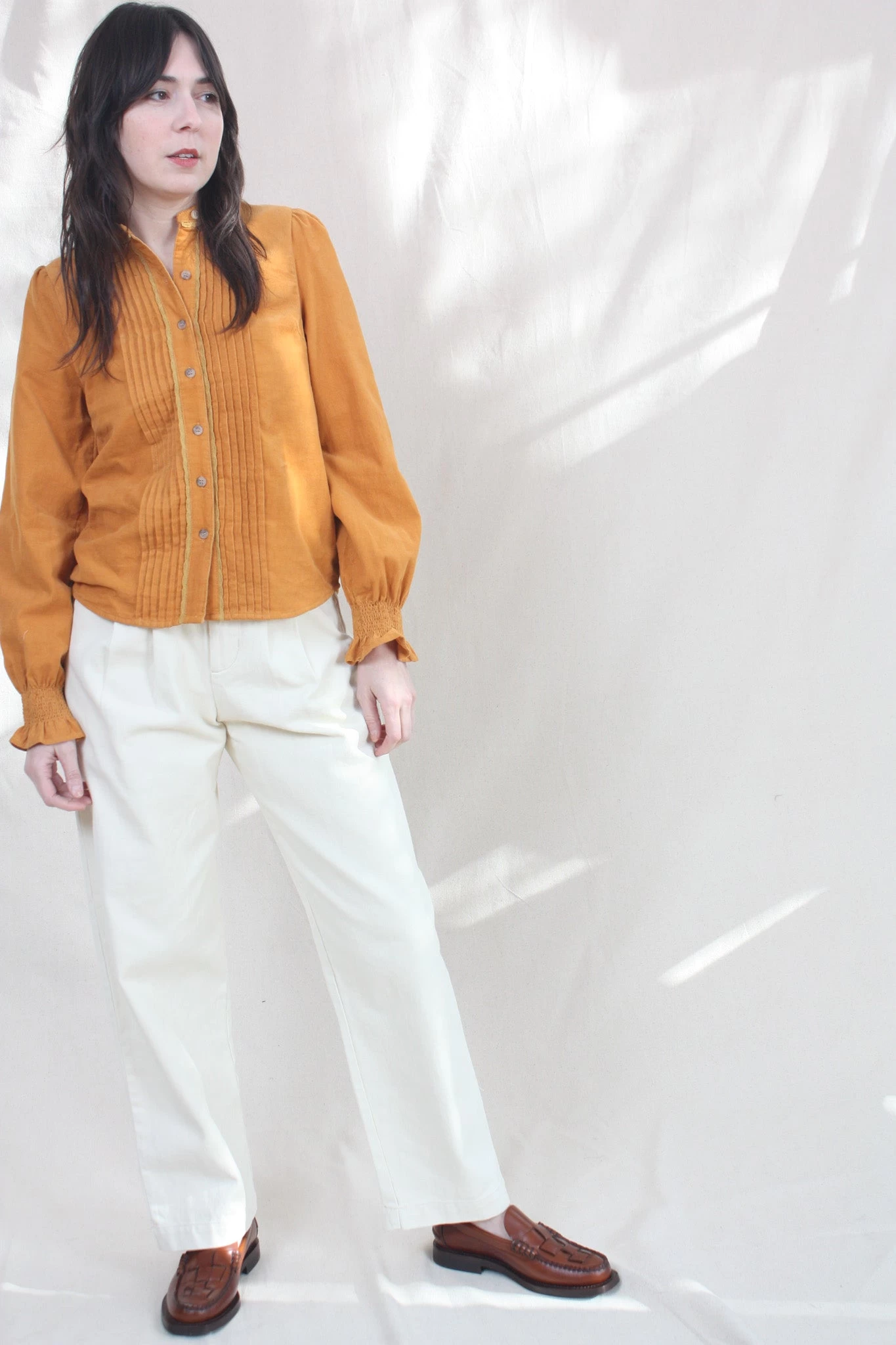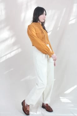 The Gladiola Shirt is a long-sleeved top with a grandad collar, decorative central panel pleating and shirred cuffs. In luscious Rust and crafted from fine cotton corduroy.