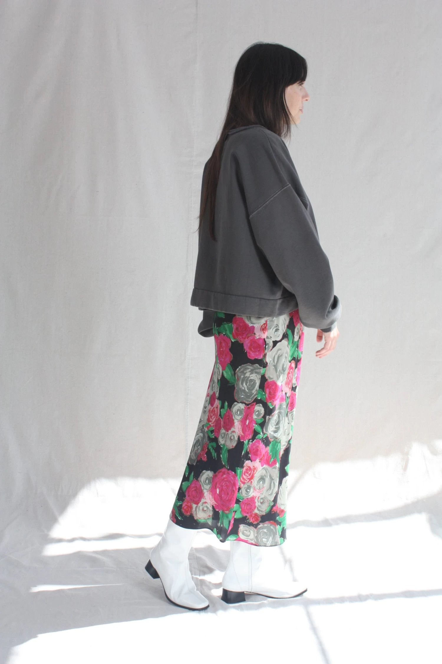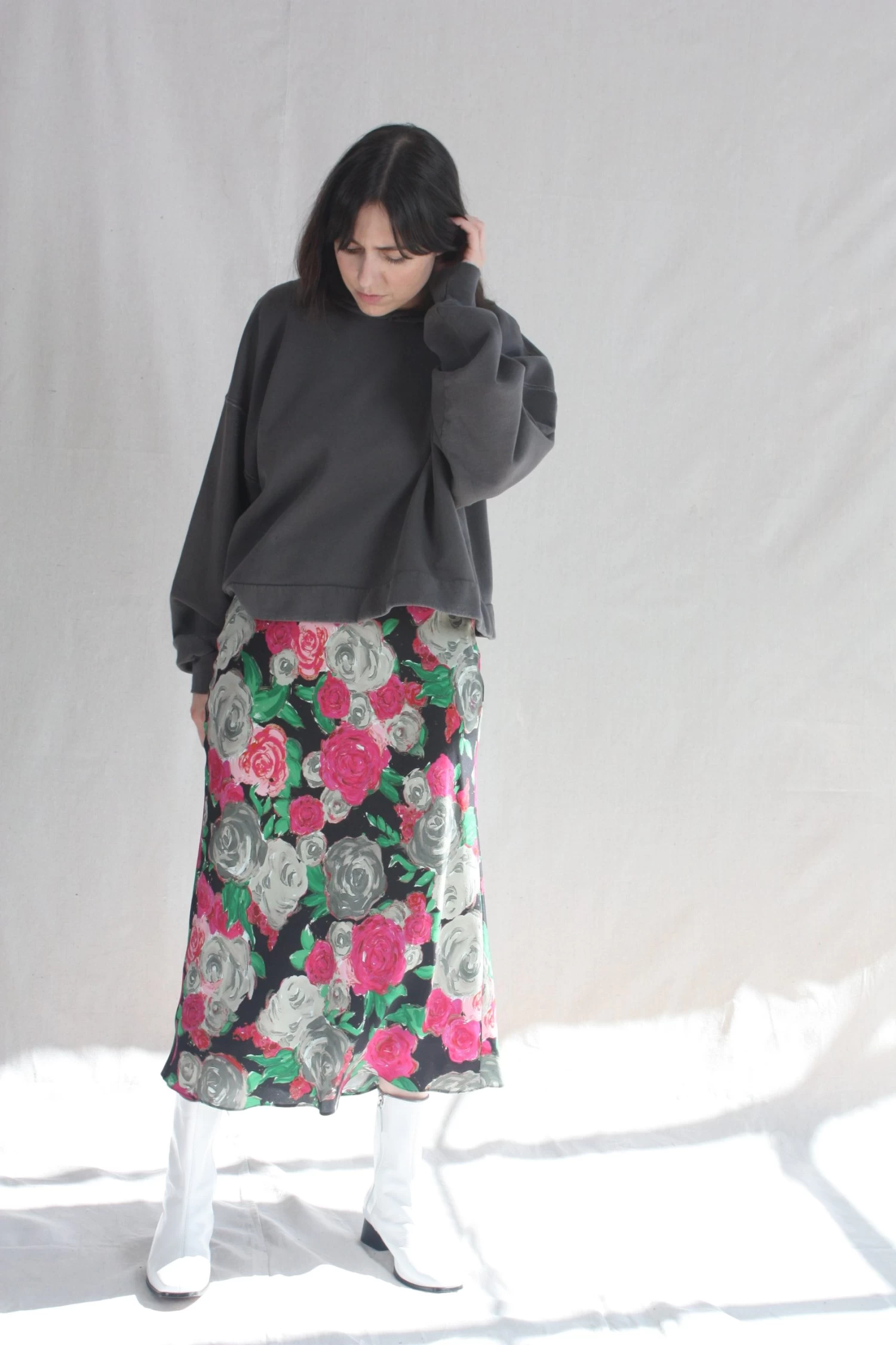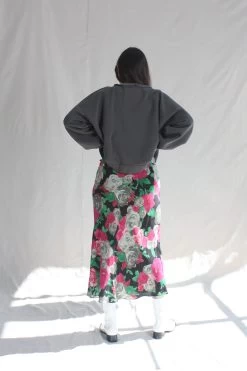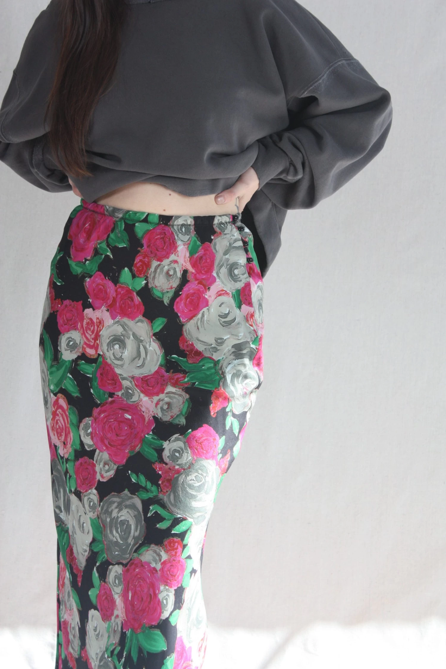 The Glass Skirt is a full-length slip silhouette with a side button closure. Damascena silk crepe de chine is custom rendered and digitally printed on soft, washed silk.Â
