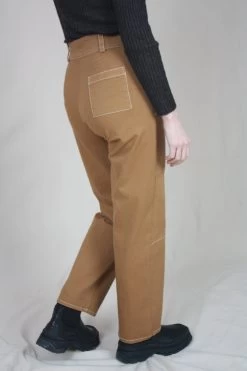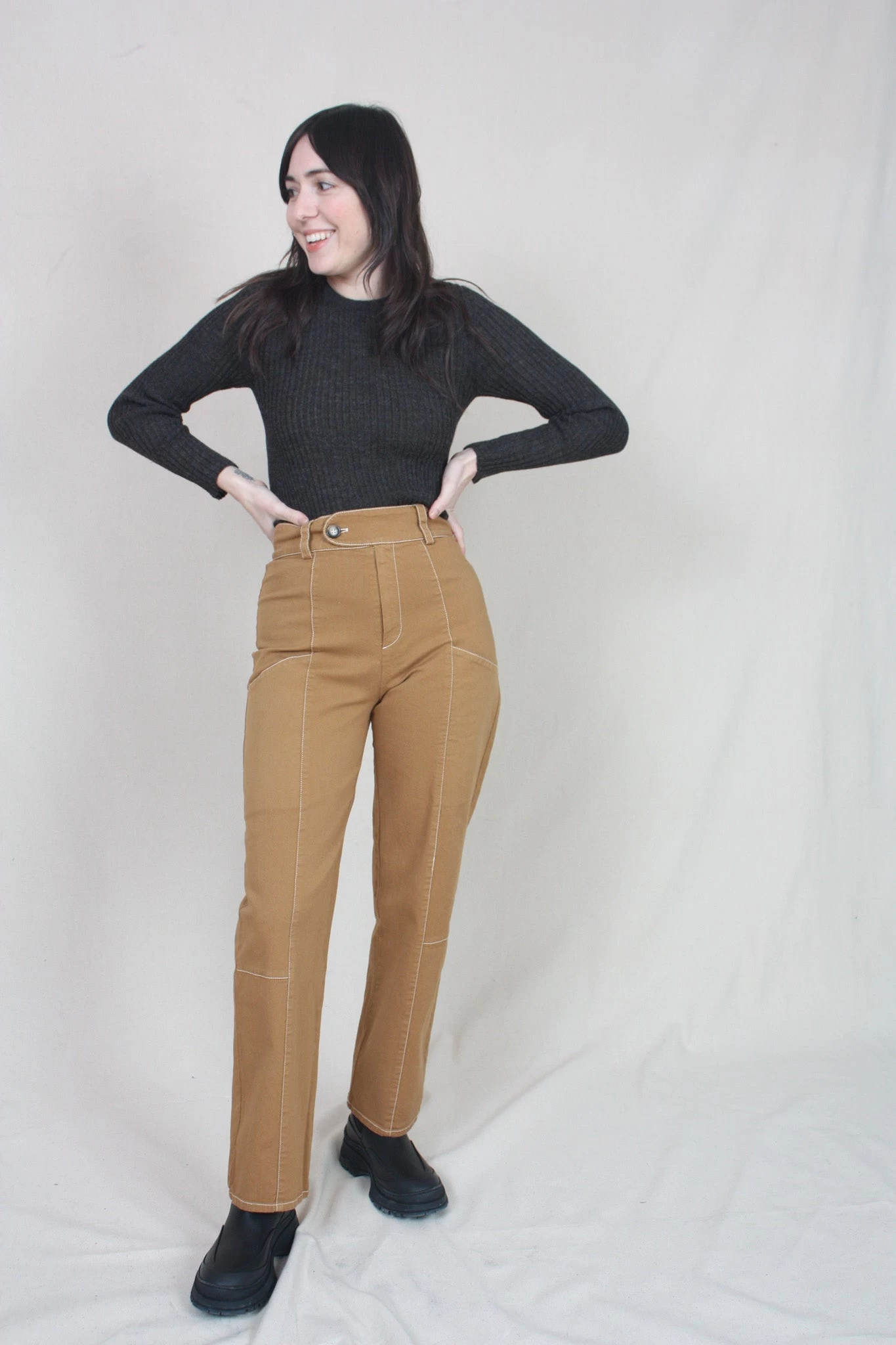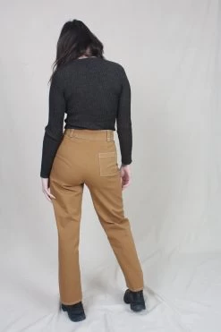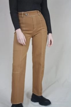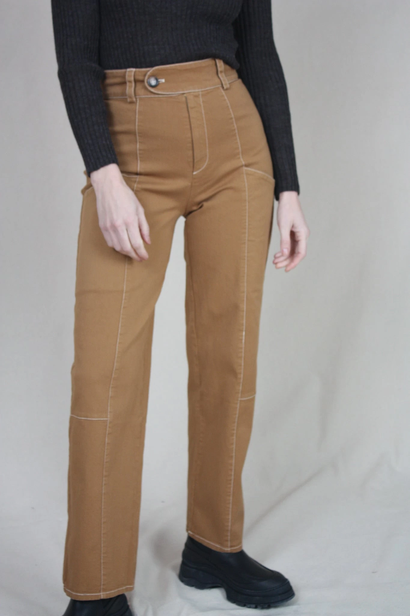 Elastic straight jeans with contrast stitching. Waistband button detail.